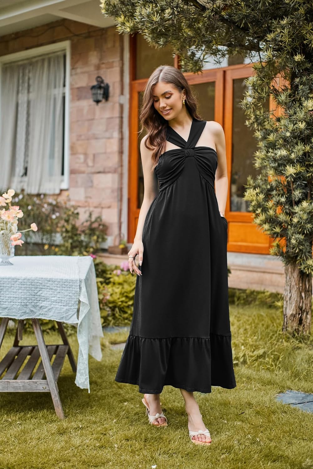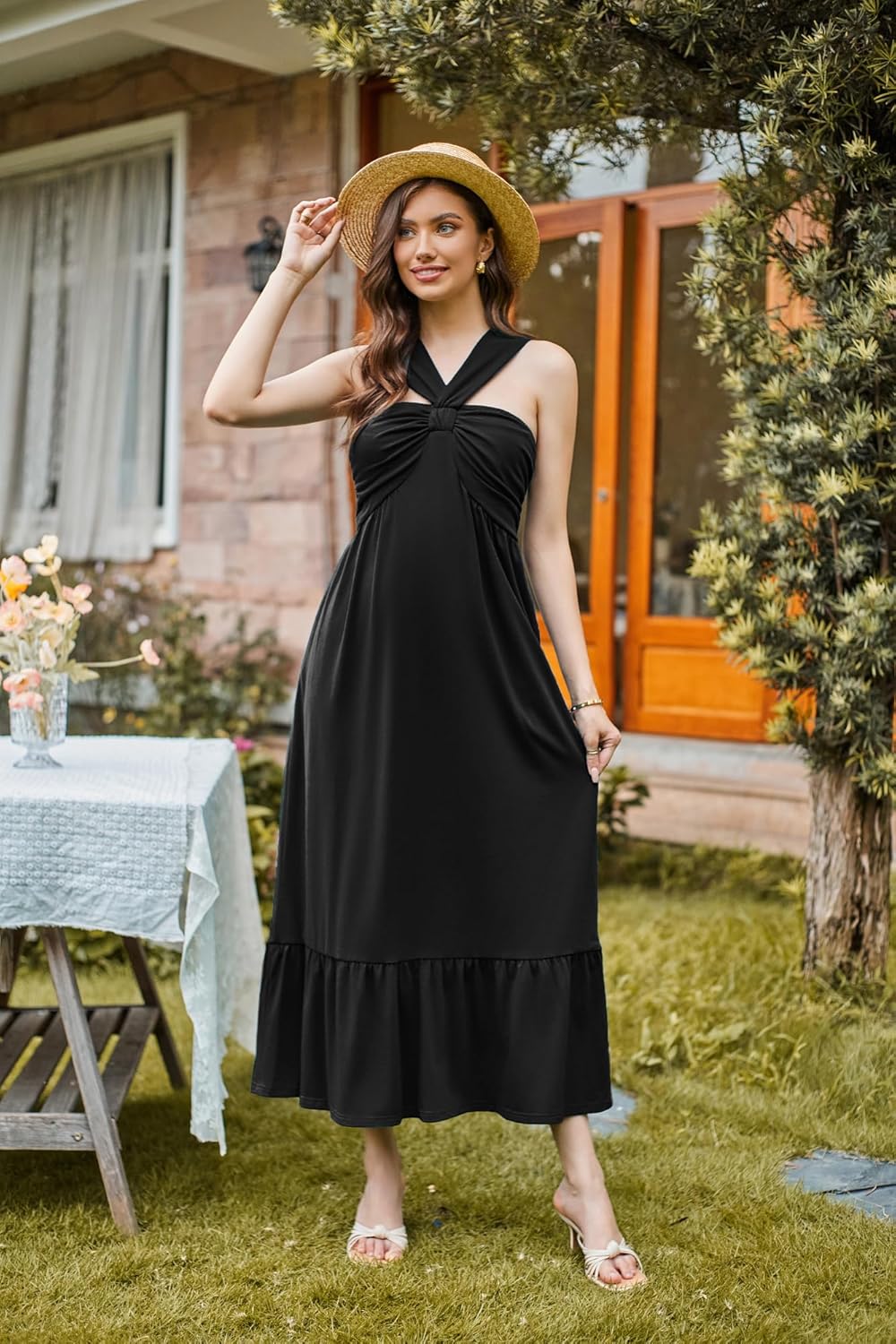 Summer Halterneck Sleeveless Dress Ruffle Hem Flowy A Line Boho Maxi Dress for Women.
