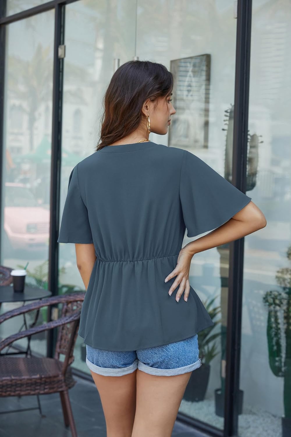 GRACE KARIN 2024 Women’s Elegant Peplum Tops V Neck Tie Front Short Bell Sleeve Shirts Tops Blouse(Grey Blue)