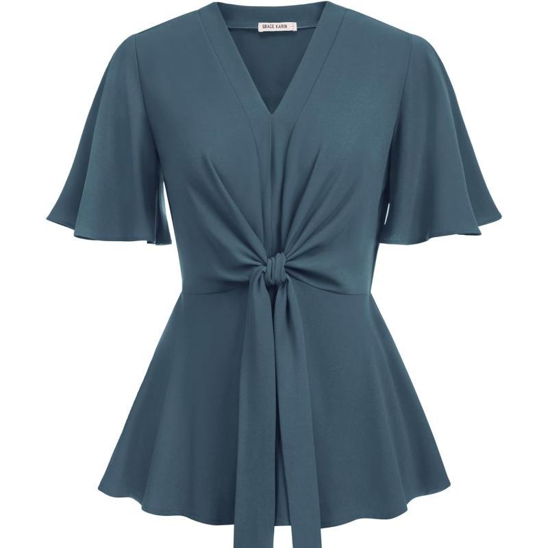 GRACE KARIN 2024 Womens Elegant Peplum Tops V Neck Tie Front Short Bell Sleeve Shirts Tops BlouseGrey Blue