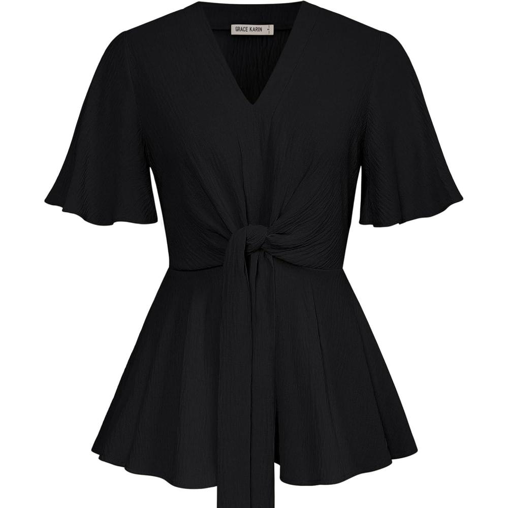 GRACE KARIN 2024 Women's Elegant V Neck Peplum Tops Tie Front Short Bell Sleeve Shirts Tops Blouse(Crinkly Black)