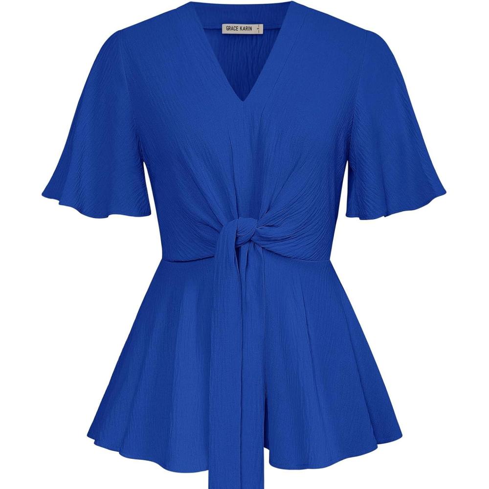GRACE KARIN 2024 Women's Elegant V Neck Peplum Tops Tie Front Short Bell Sleeve Shirts Tops Blouse(Crinkly Royal Blue)