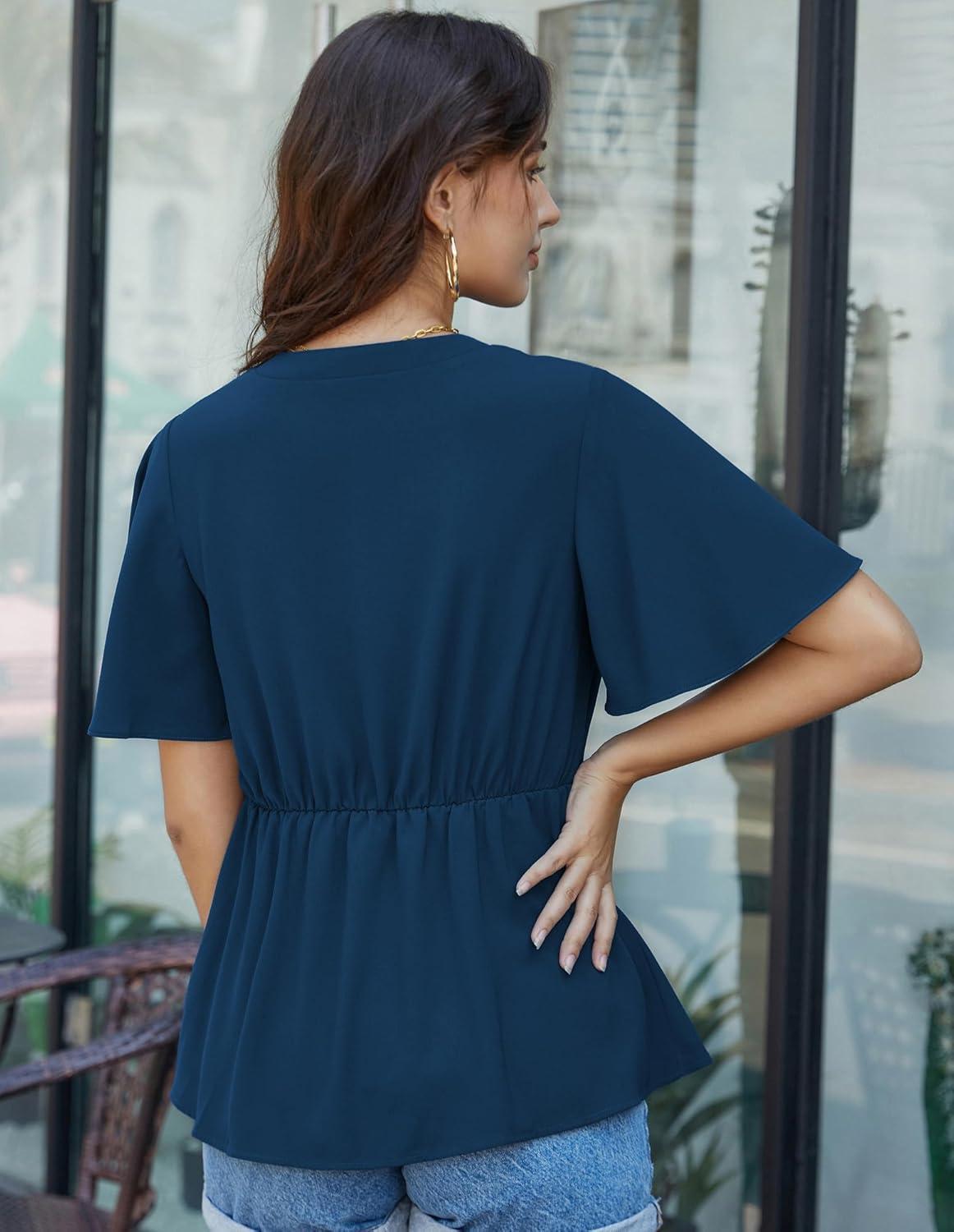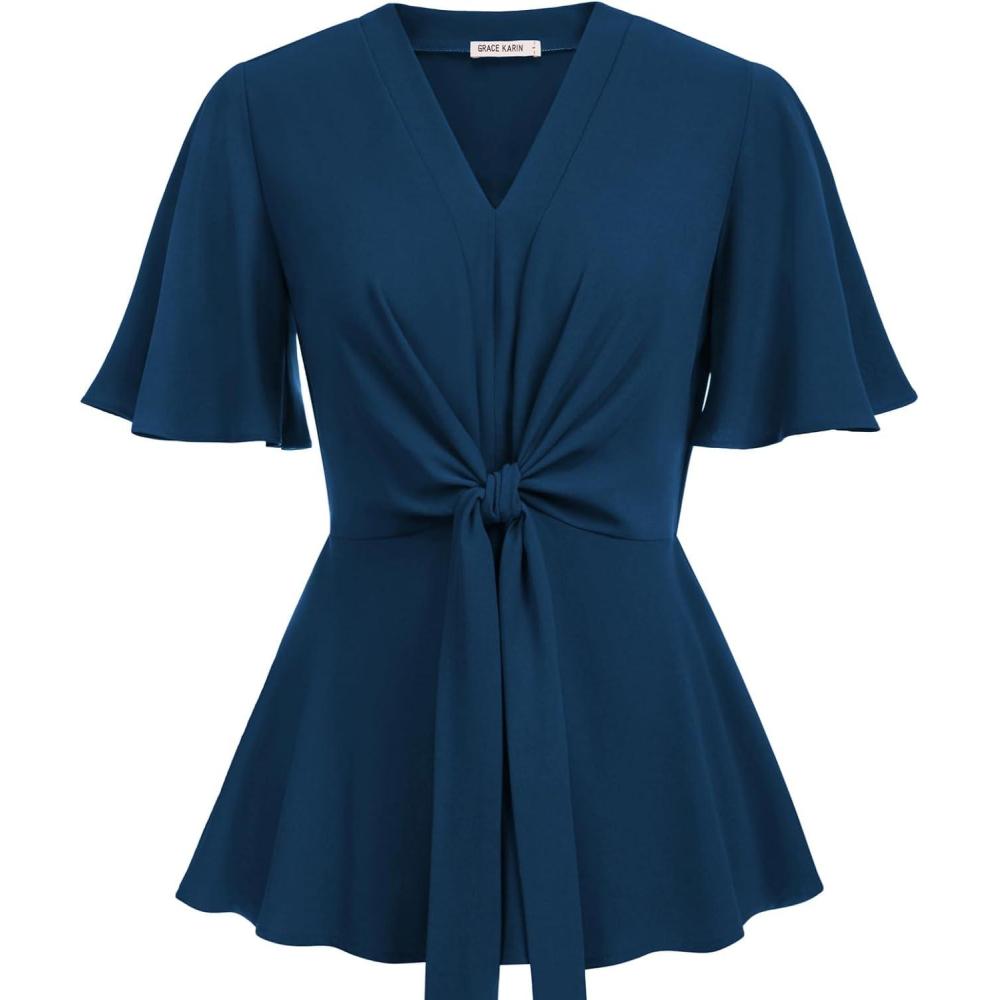 GRACE KARIN 2024 Women’s Elegant V Neck Peplum Tops Tie Front Short Bell Sleeve Shirts Tops Blouse(Dark Blue)