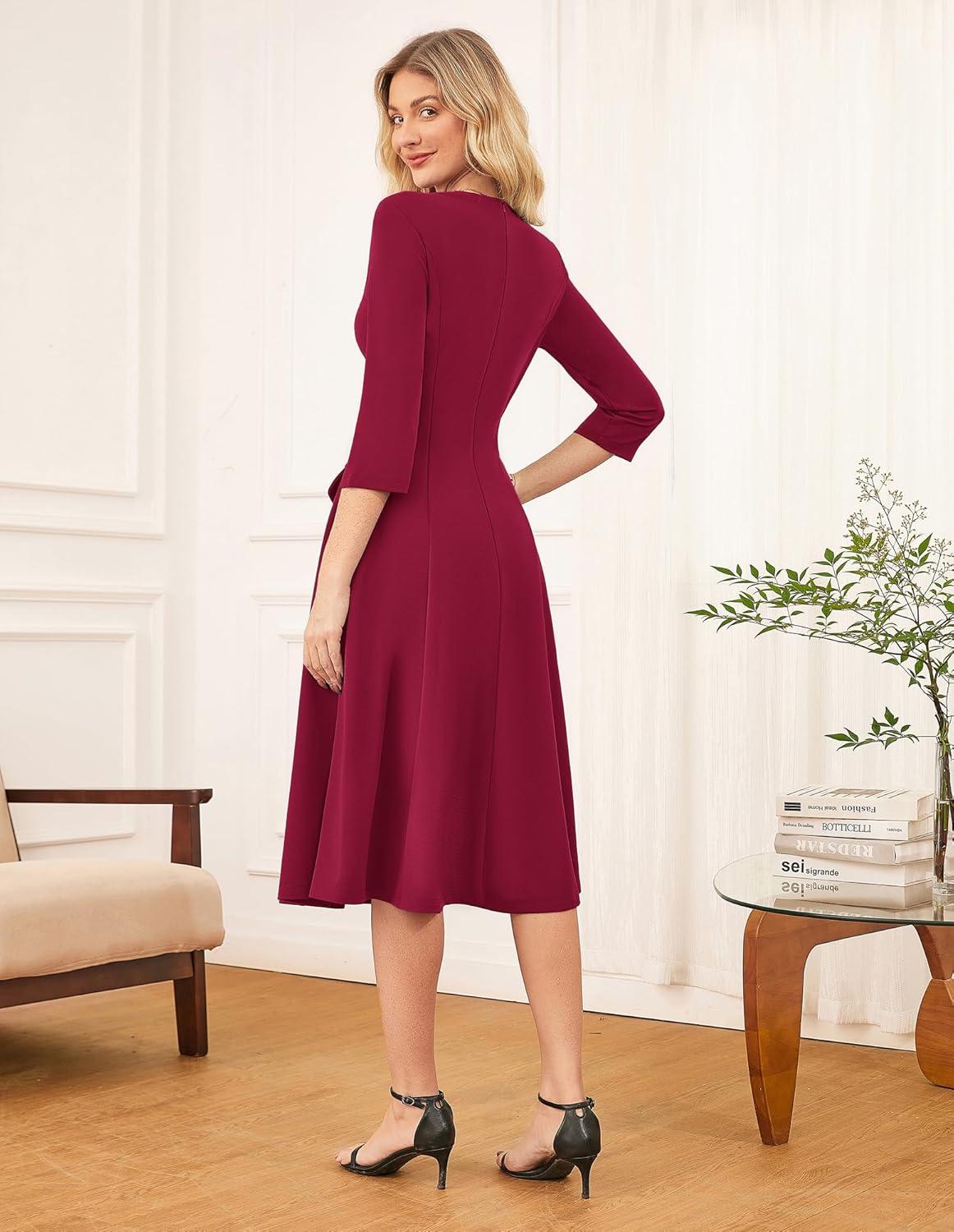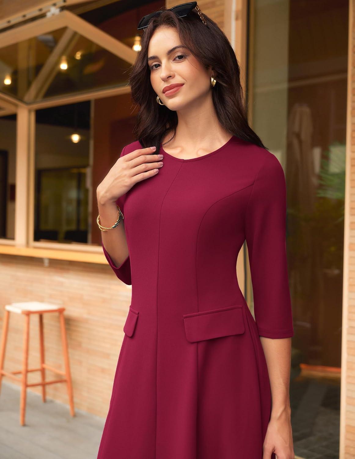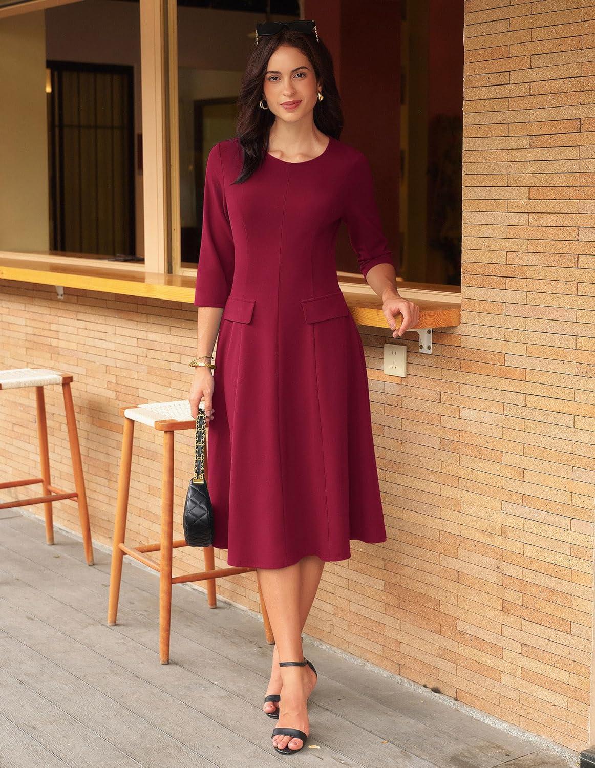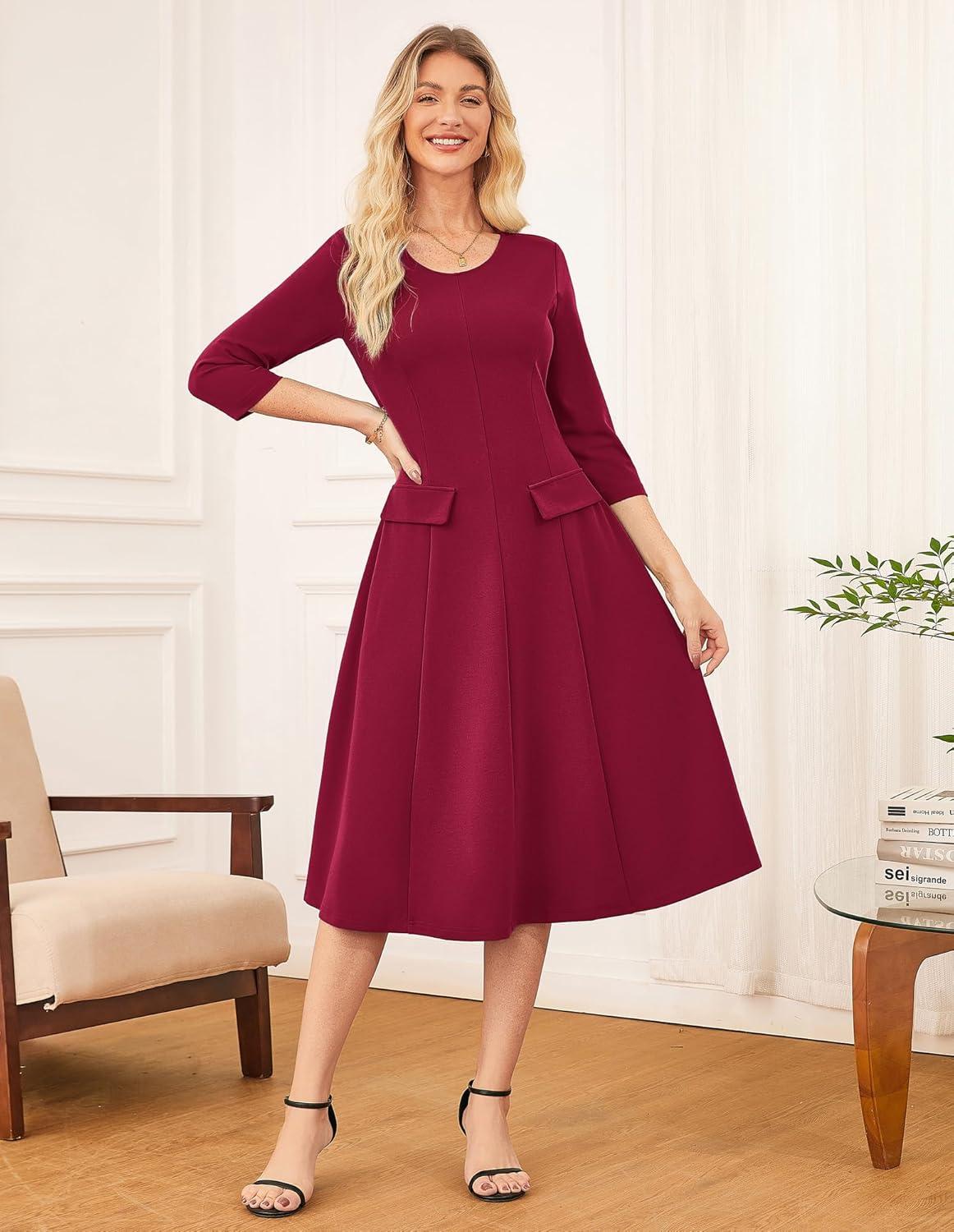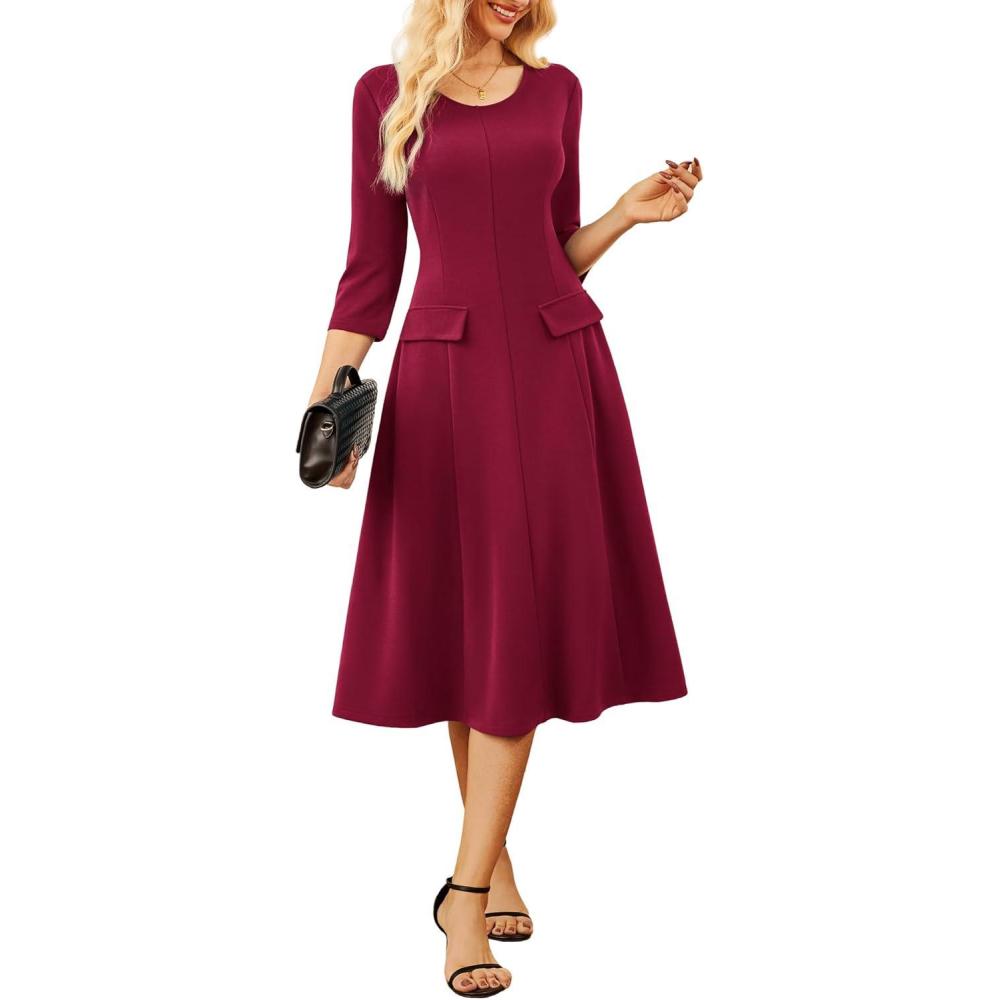 GRACE KARIN 2025 Wear to Work Dress for Women A Line Midi Fit 3/4 Sleeve Church Round Neck Business Dresses(Wine Red)
