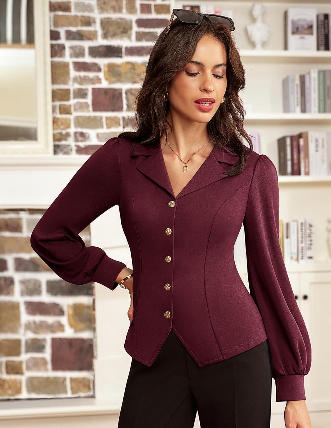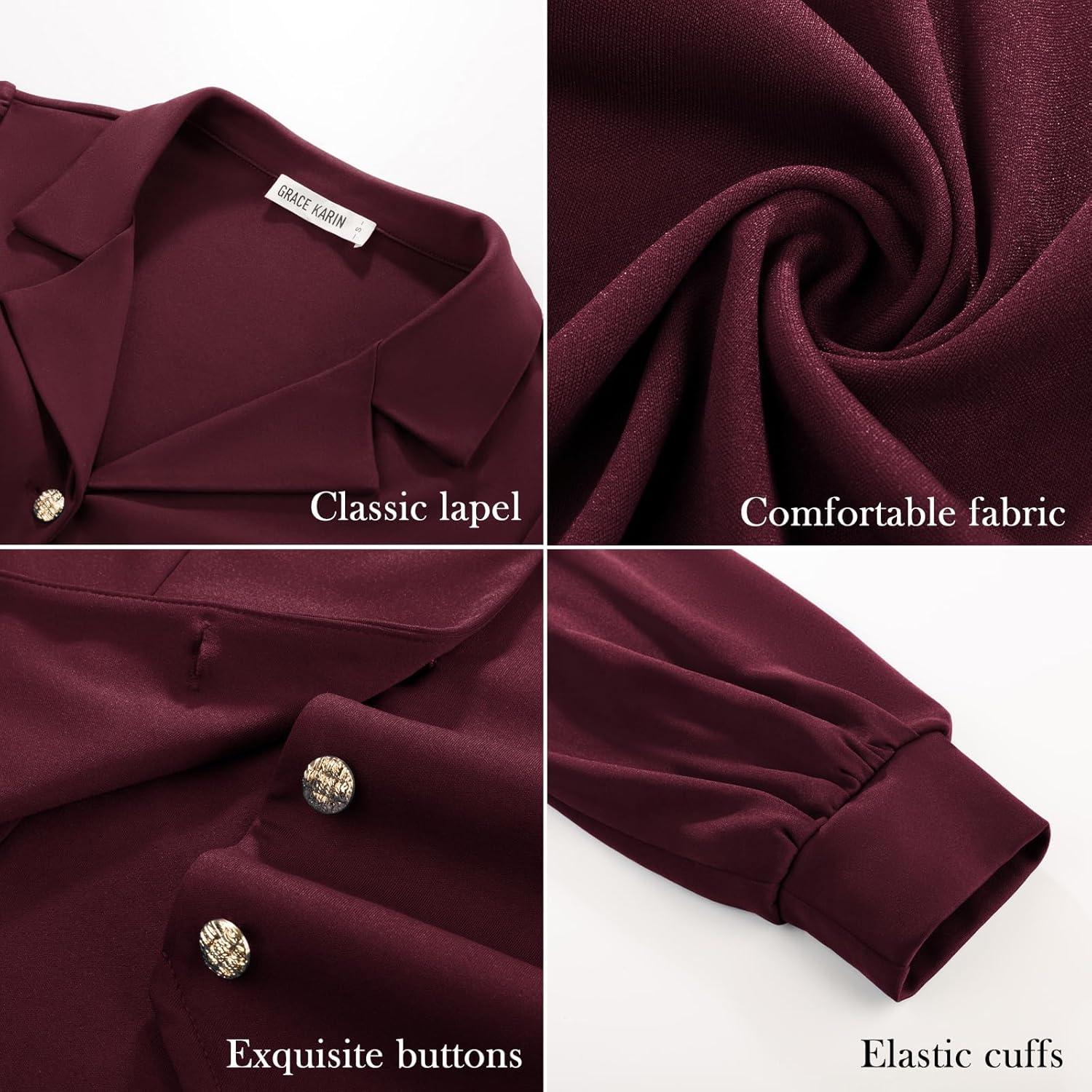 GRACE KARIN 2025 Women Fall Work Office Blouses,Long Sleeve Trendy Work Tops,V Neck Button Down Slim Shirts(Wine Red)