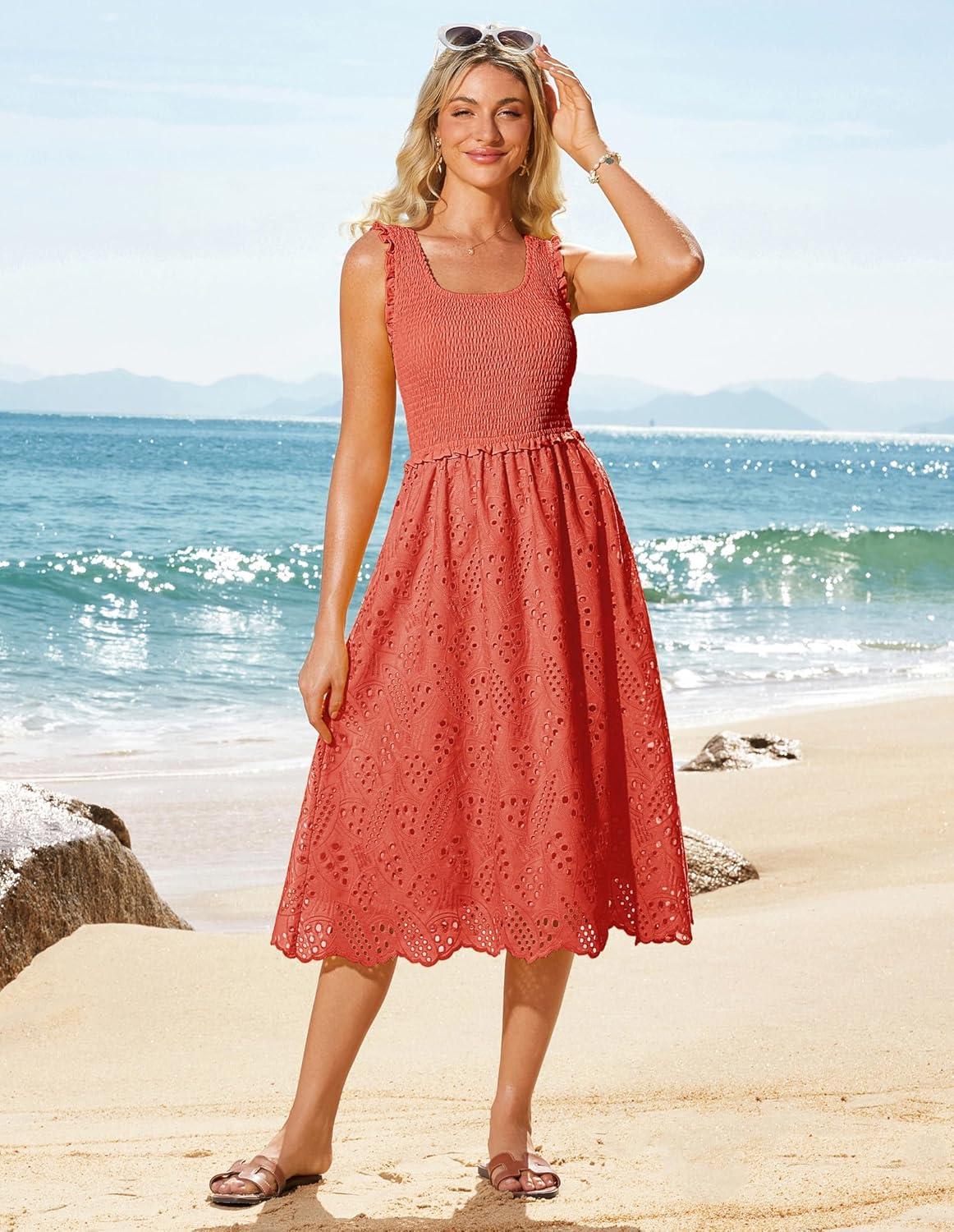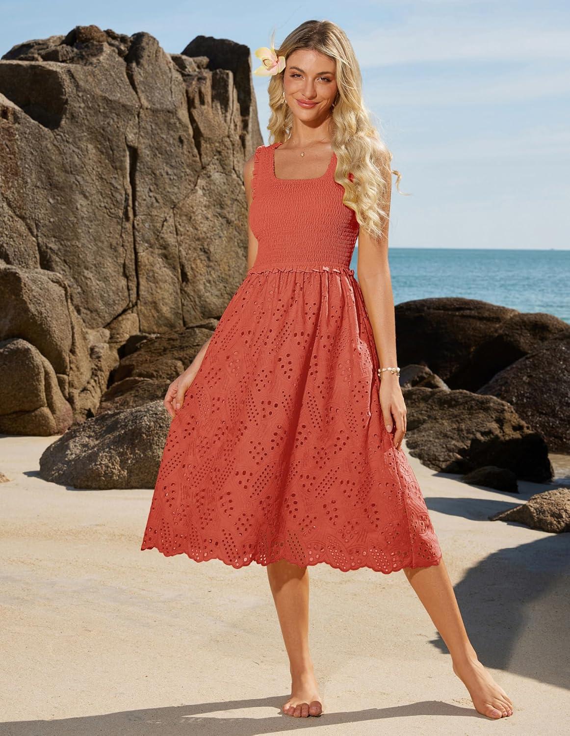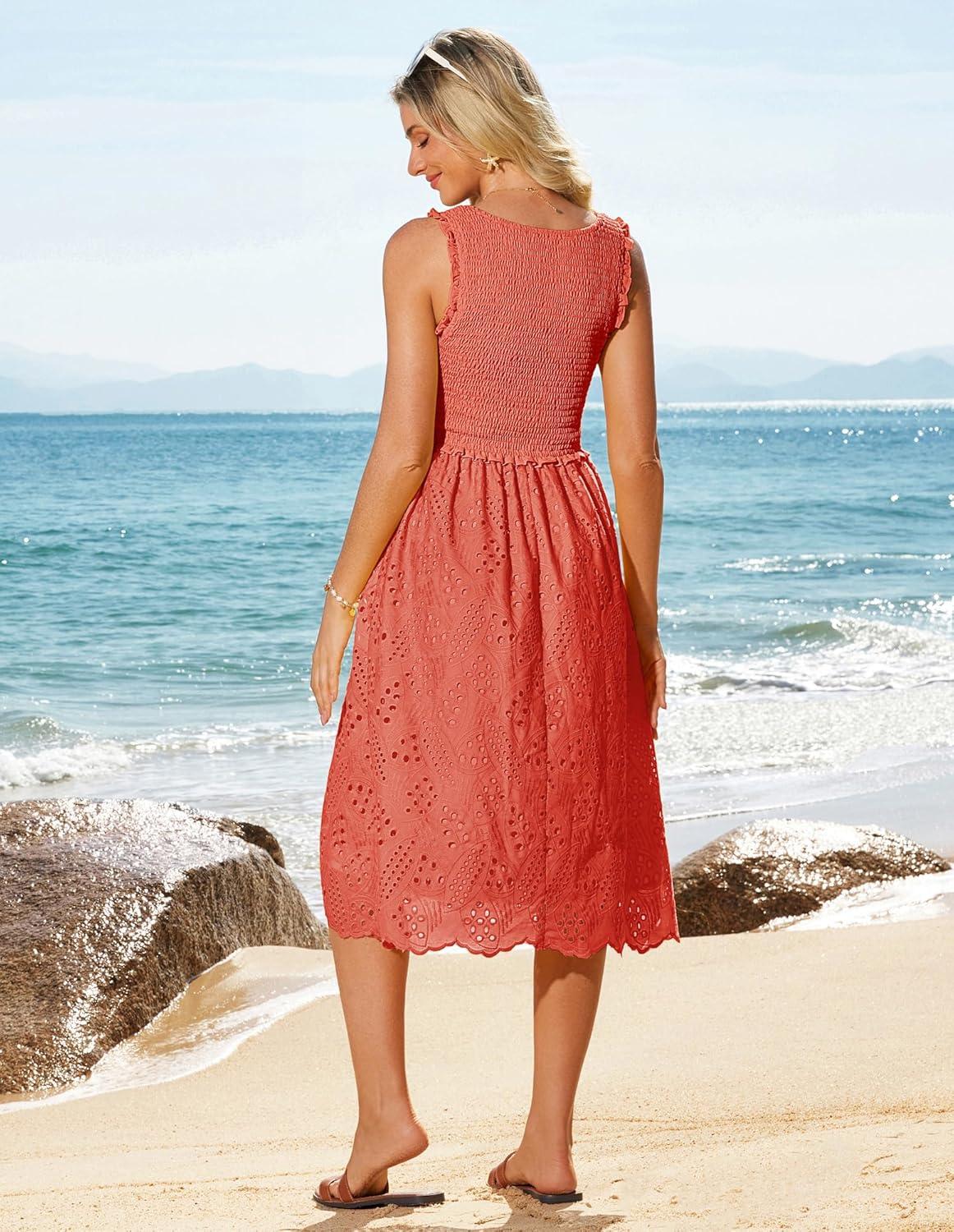 GRACE KARIN 2025 Womens Dress Summer Sleeveless Casual Vacation Embroidered Midi Dress with Pockets(Coral Red)