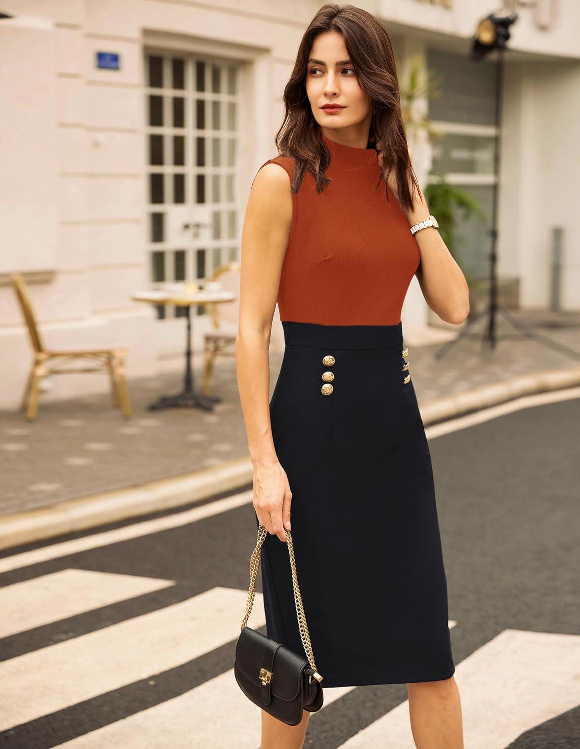 GRACE KARIN 2025 Women’s Lightweight Mock Neck Business Work Dress Sleeveless Double Breasted Bodycon Midi Dress(Orange-black)