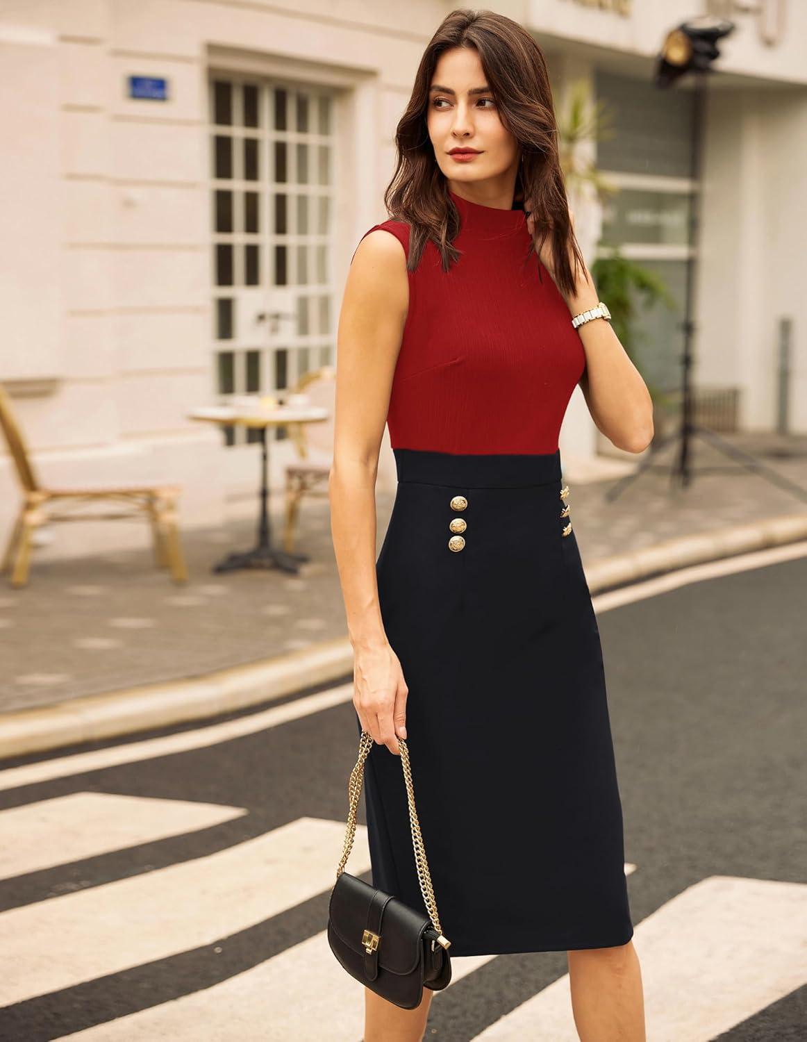 GRACE KARIN 2025 Women's Lightweight Mock Neck Business Work Dress Sleeveless Double Breasted Bodycon Midi Dress(Red-black)