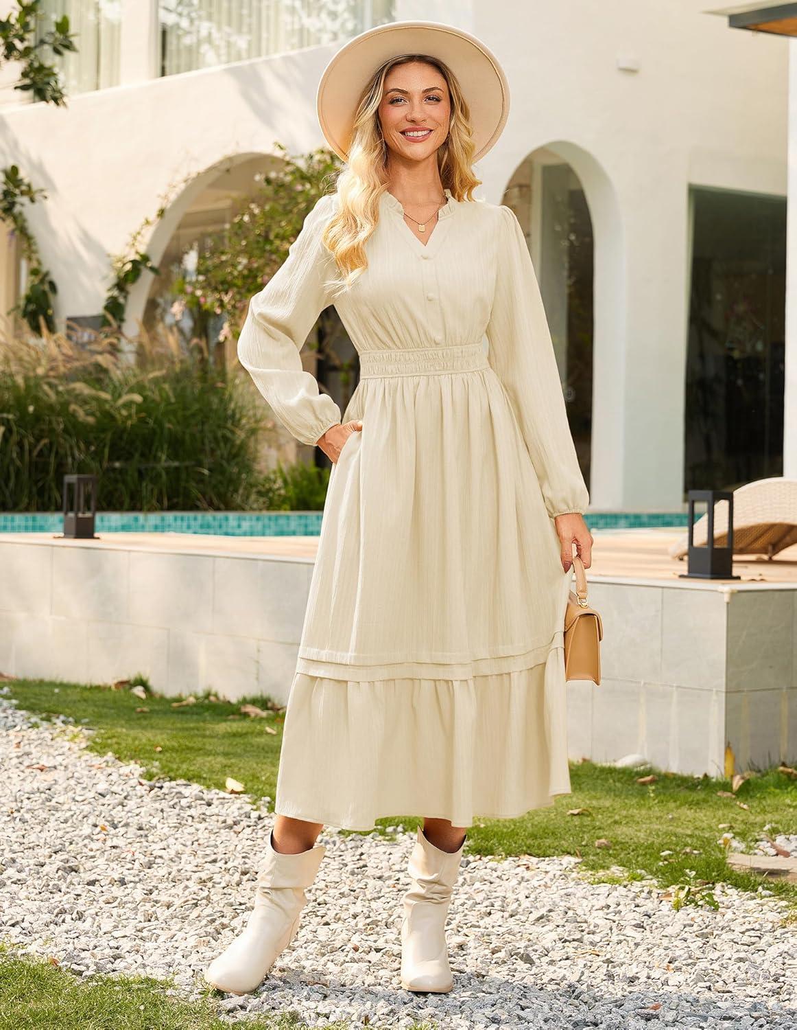 GRACE KARIN 2025 Women's Long Sleeve Henley V-Neck Midi Dresses Smocked Tiered Flowy A Line Dresses(Apricot)