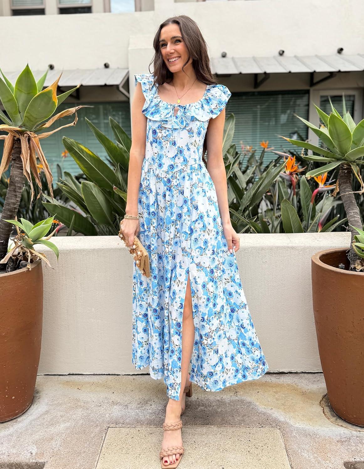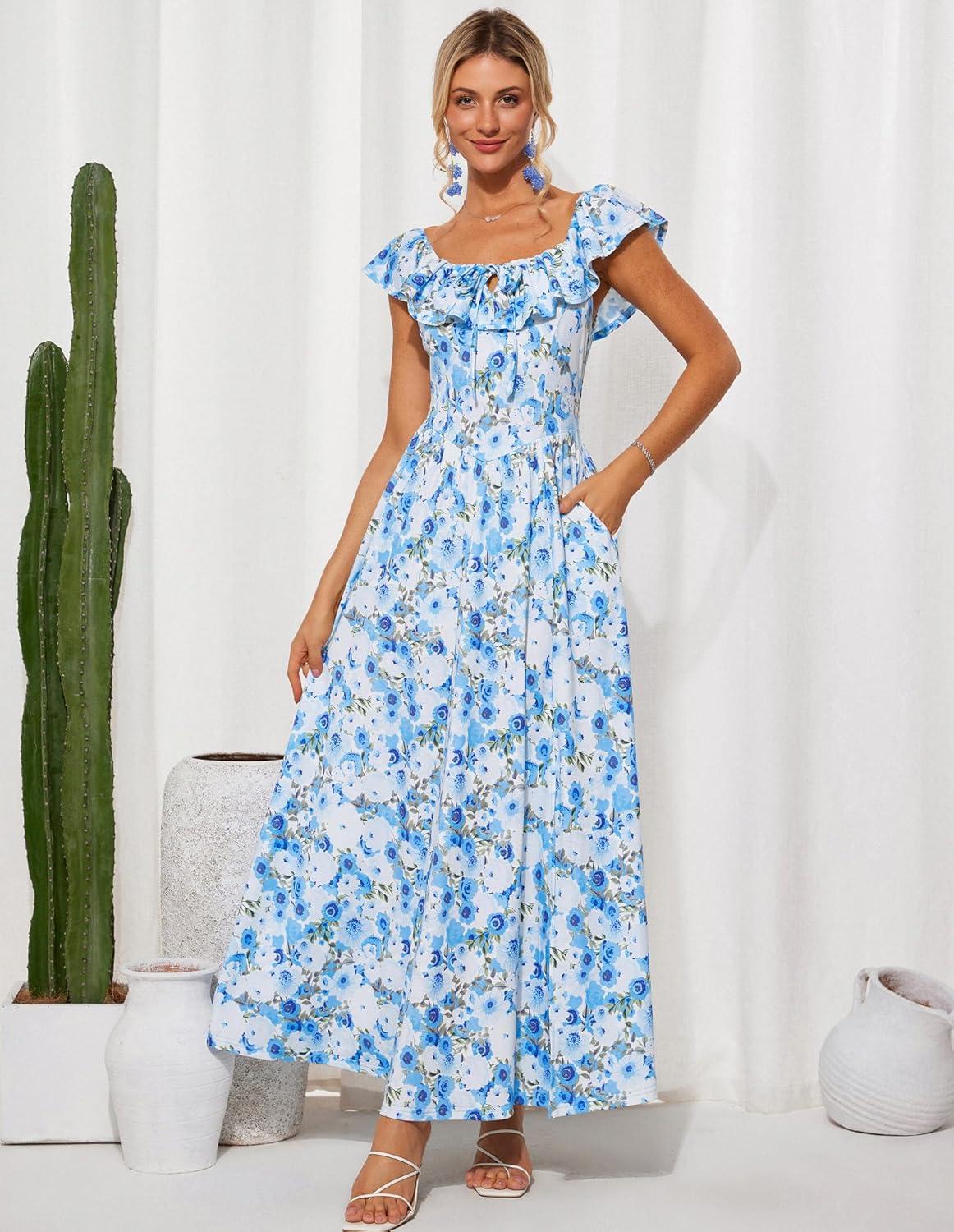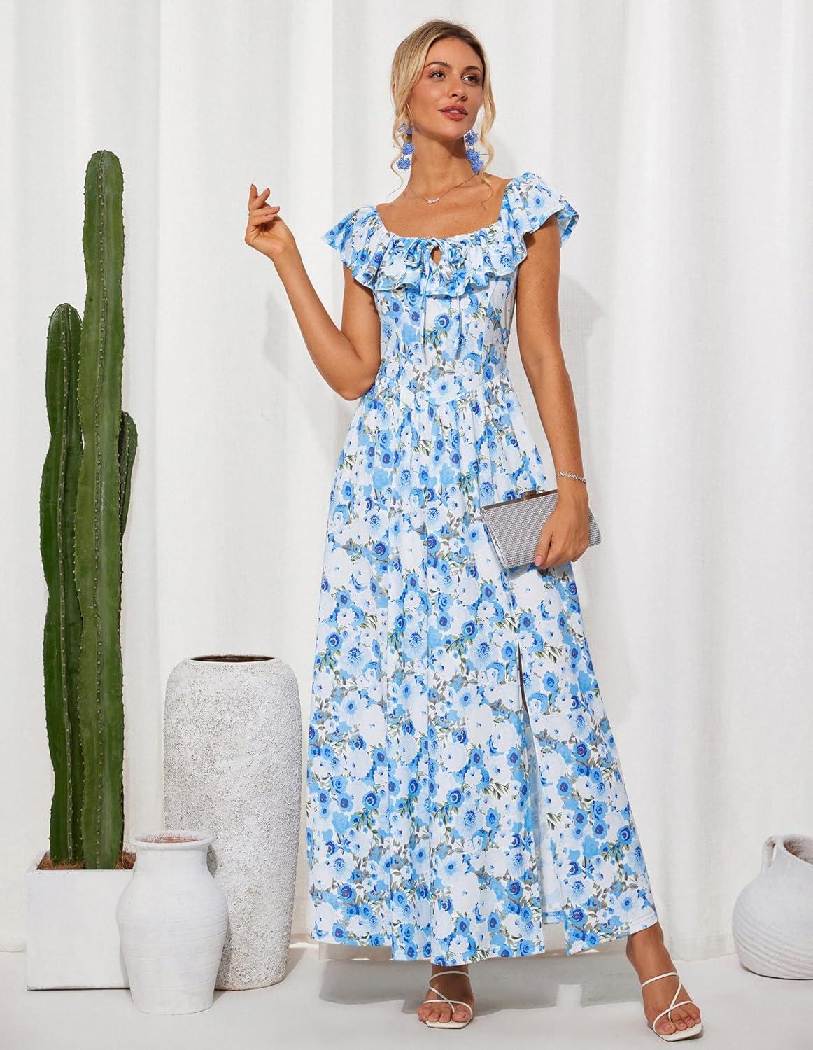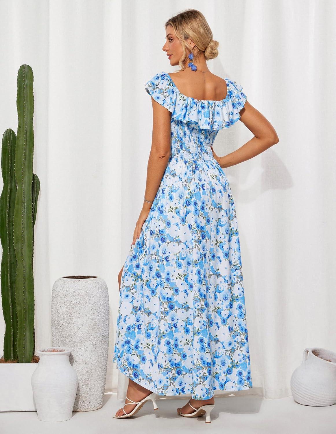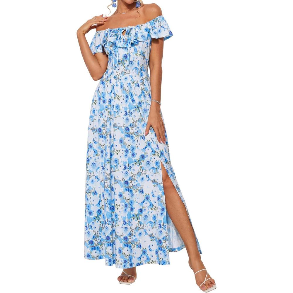 Don’t break the bank! Get the GRACE KARIN 2025 Womens Maxi Dresses Summer Off Shoulder Floral Dress Ruffle Split Beach Flowy Boho Wedding Guest Dress(Blue) you want at a price you can afford during our markdown sale.