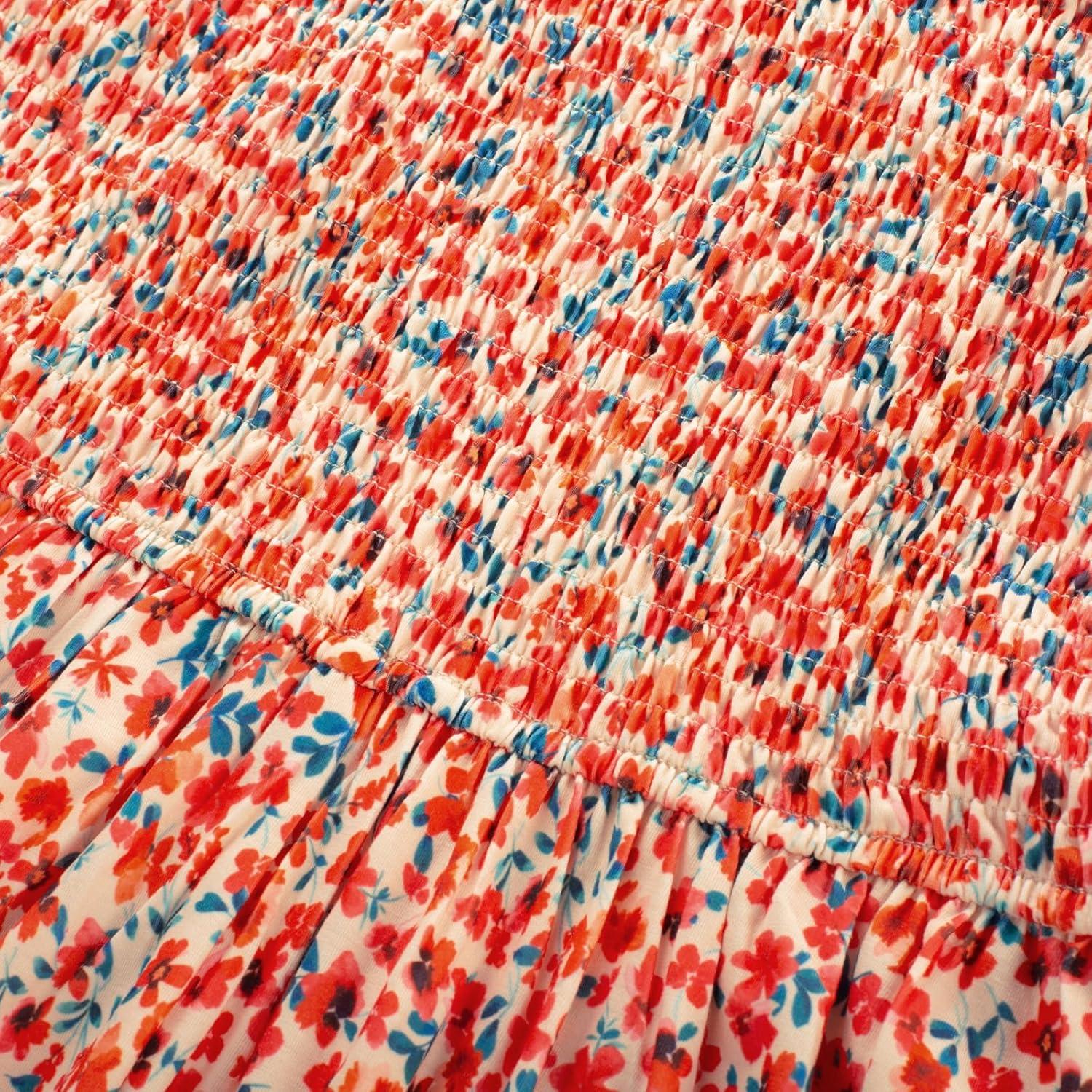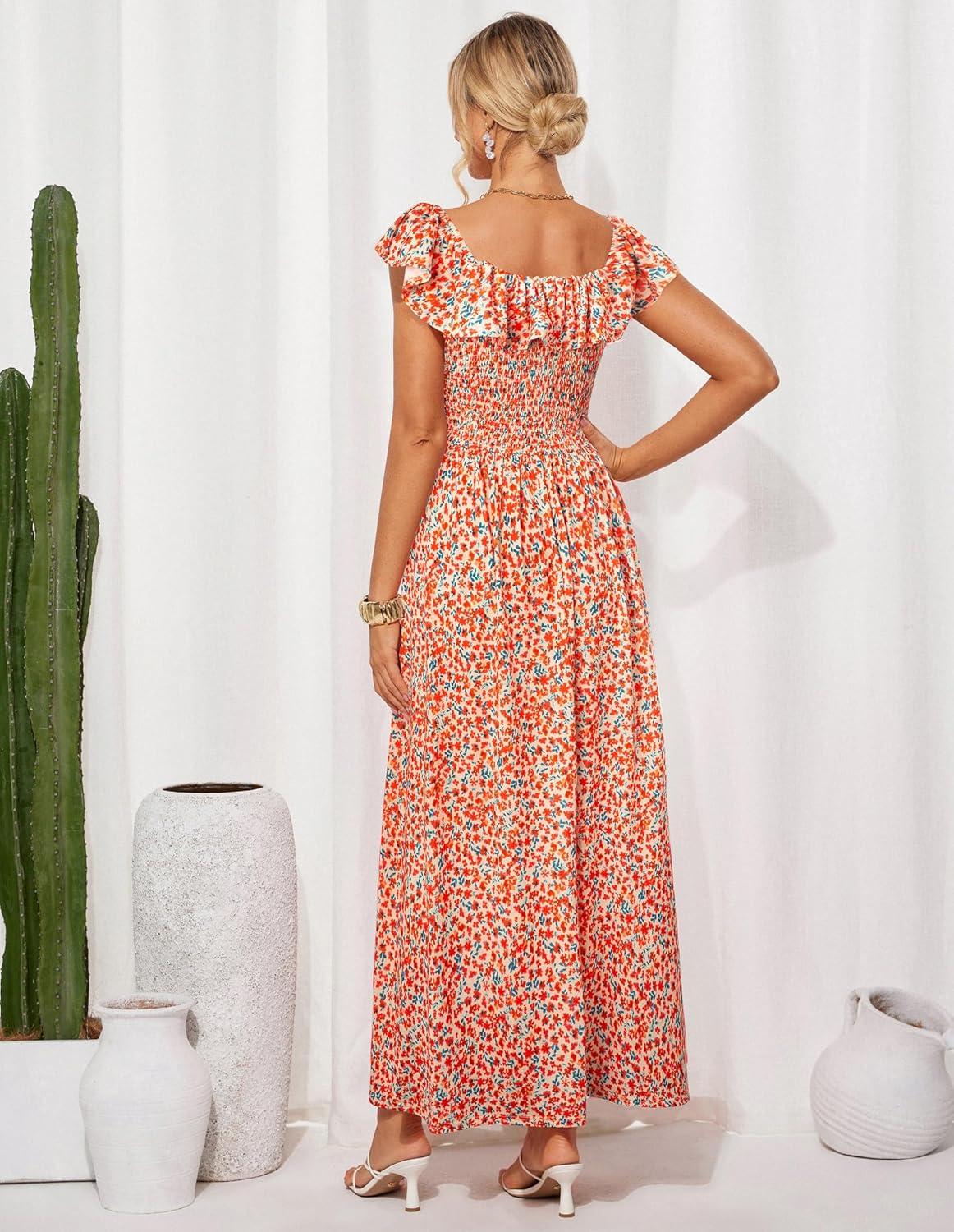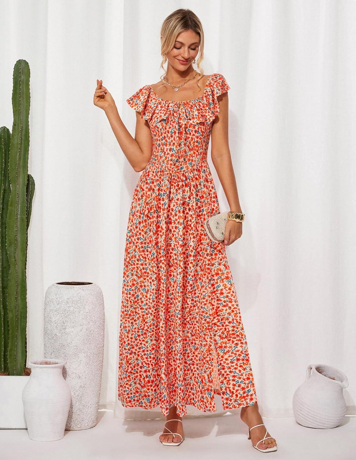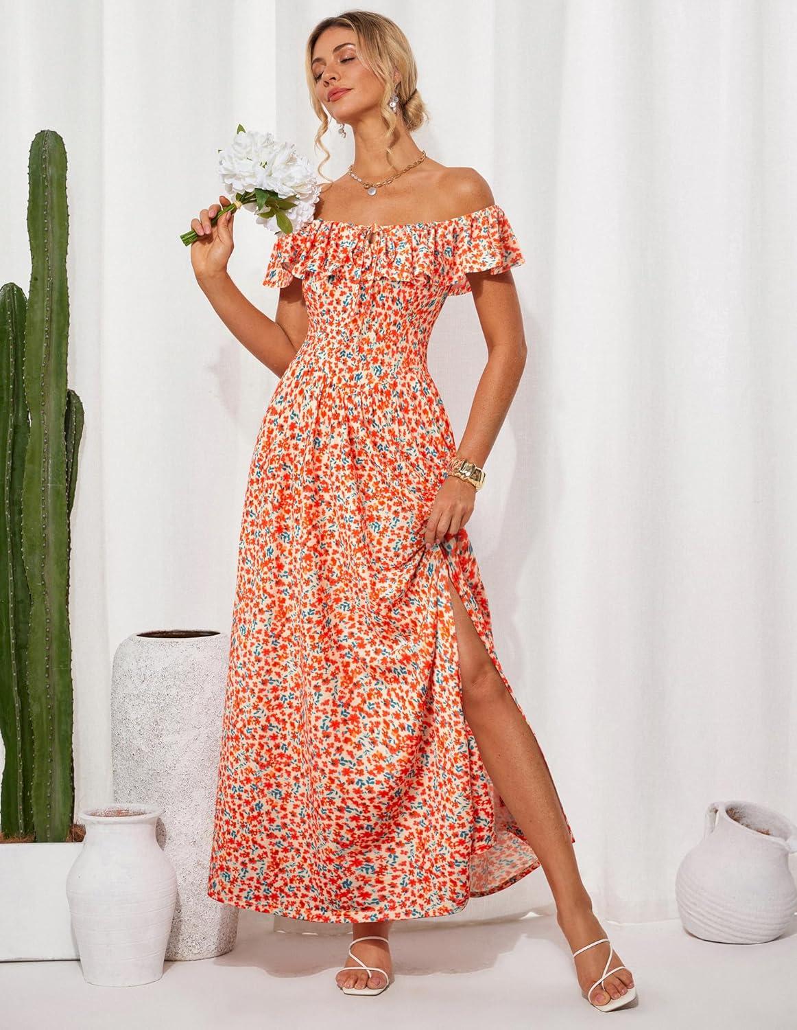 GRACE KARIN 2025 Womens Maxi Dresses Summer Off Shoulder Floral Dress Ruffle Split Beach Flowy Boho Wedding Guest Dress(Orange Flower)