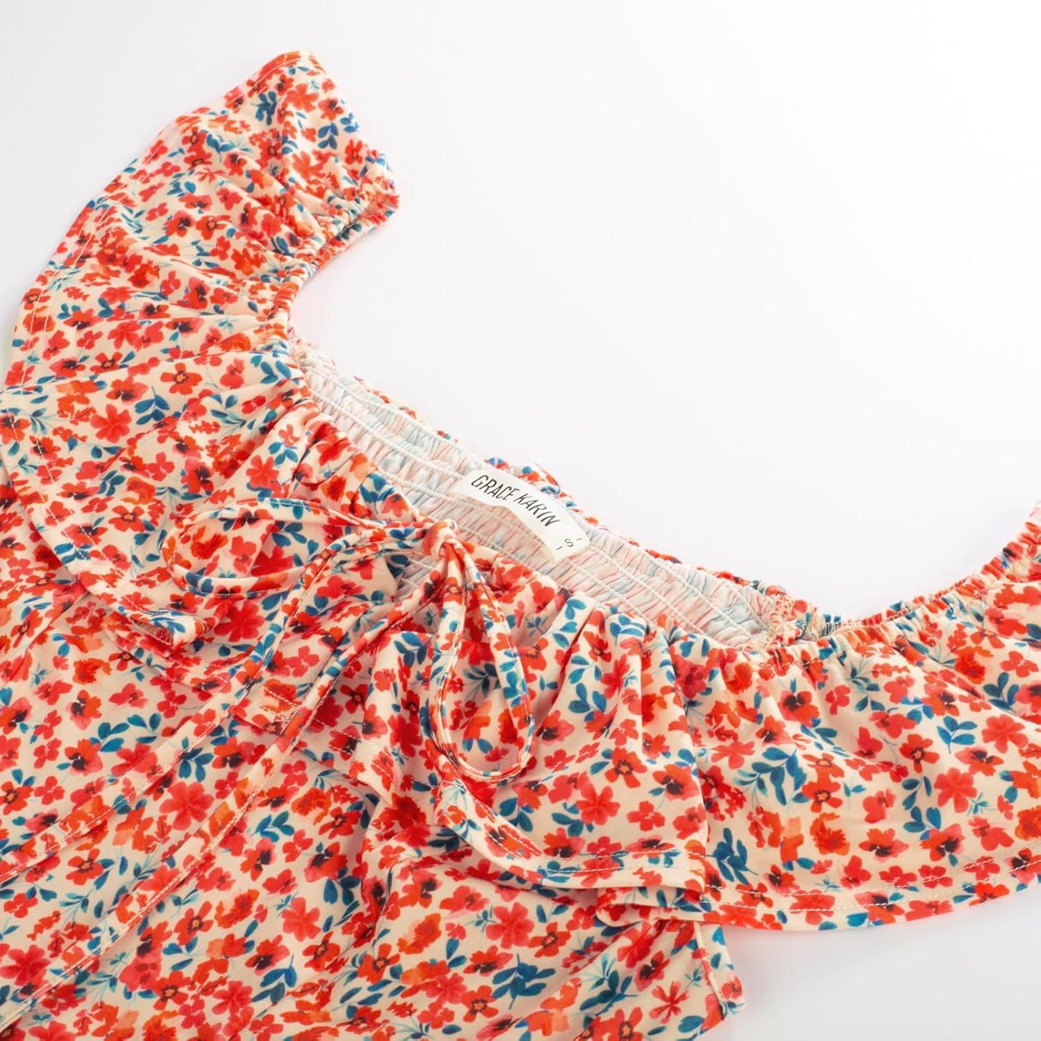 imageGRACE KARIN 2025 Womens Maxi Dresses Summer Off Shoulder Floral Dress Ruffle Split Beach Flowy Boho Wedding Guest DressOrange Flower