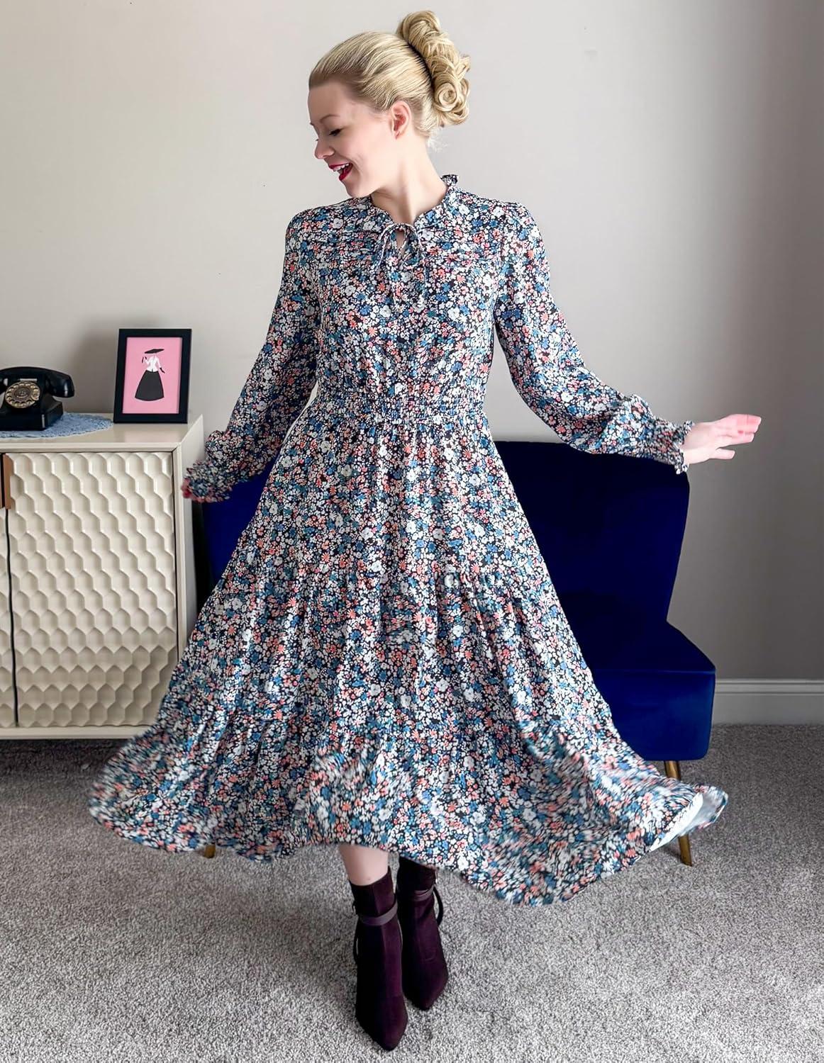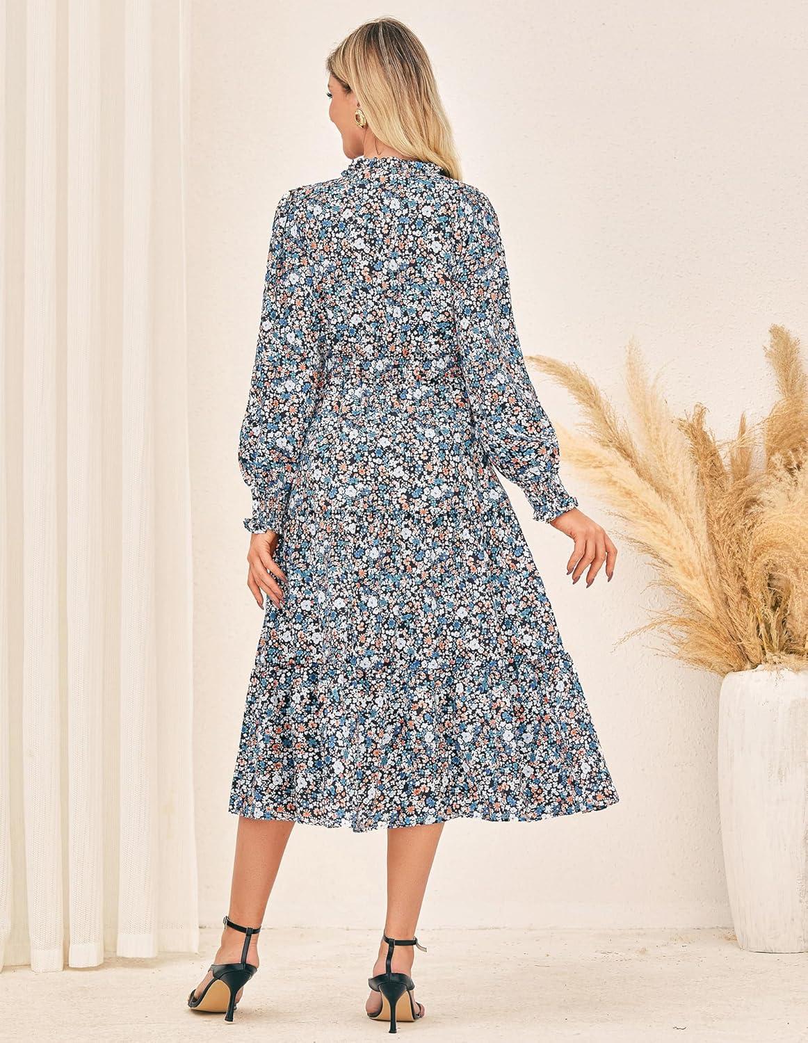 imageGRACE KARIN 2025 Womens Summer Floral Midi Dress Boho Long Sleeve V Neck Ruffle Casual A Line Flowy Dresses with PocketBlue Floral