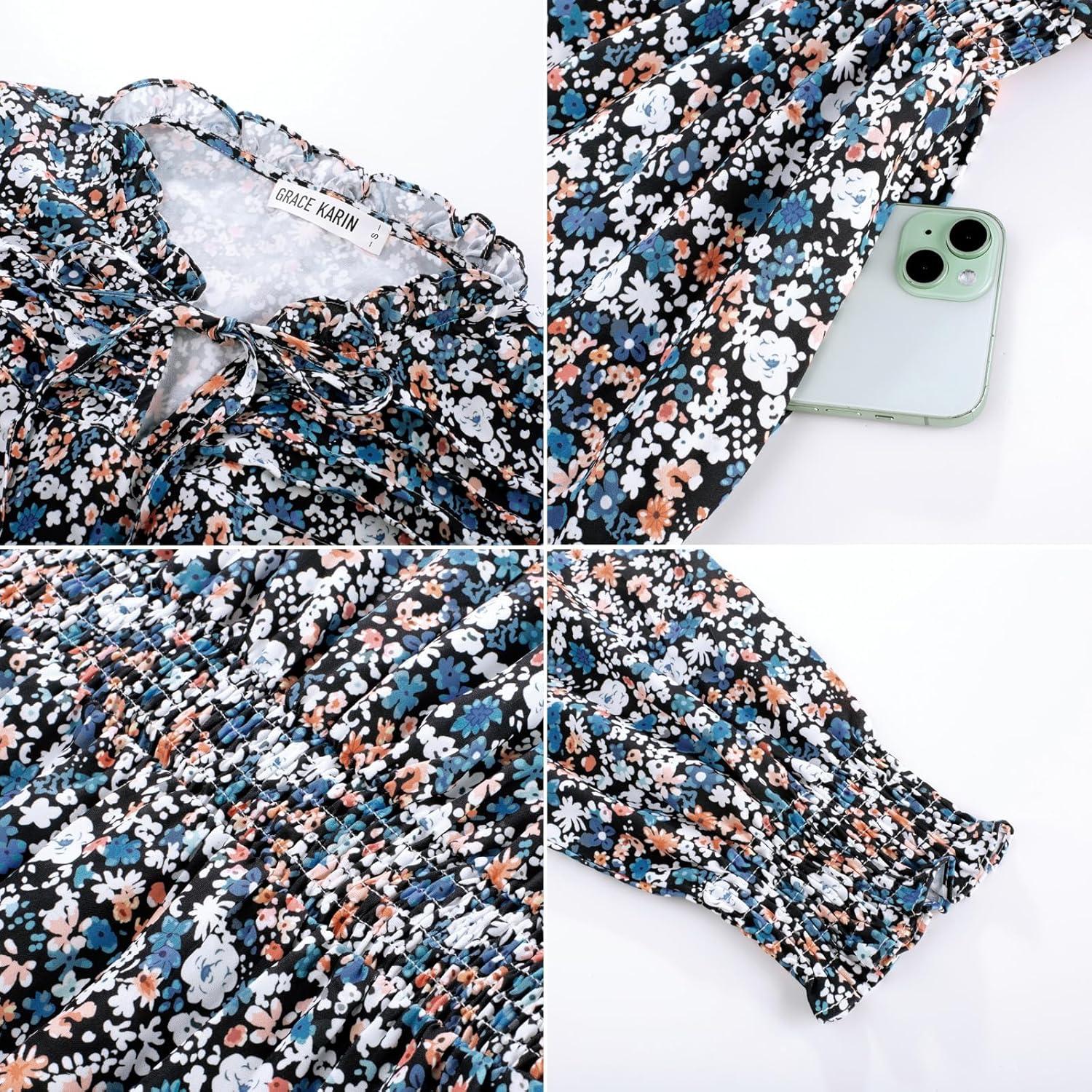 GRACE KARIN 2025 Women’s Summer Floral Midi Dress Boho Long Sleeve V Neck Ruffle Casual A Line Flowy Dresses with Pocket(Blue Floral)