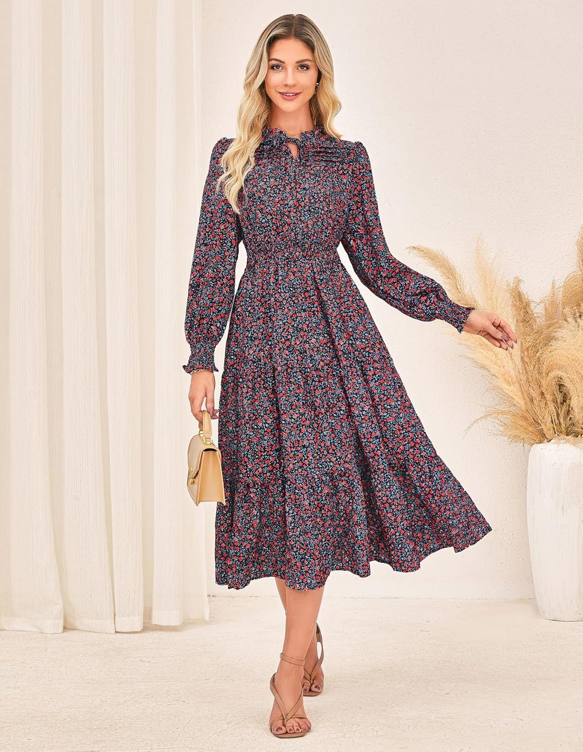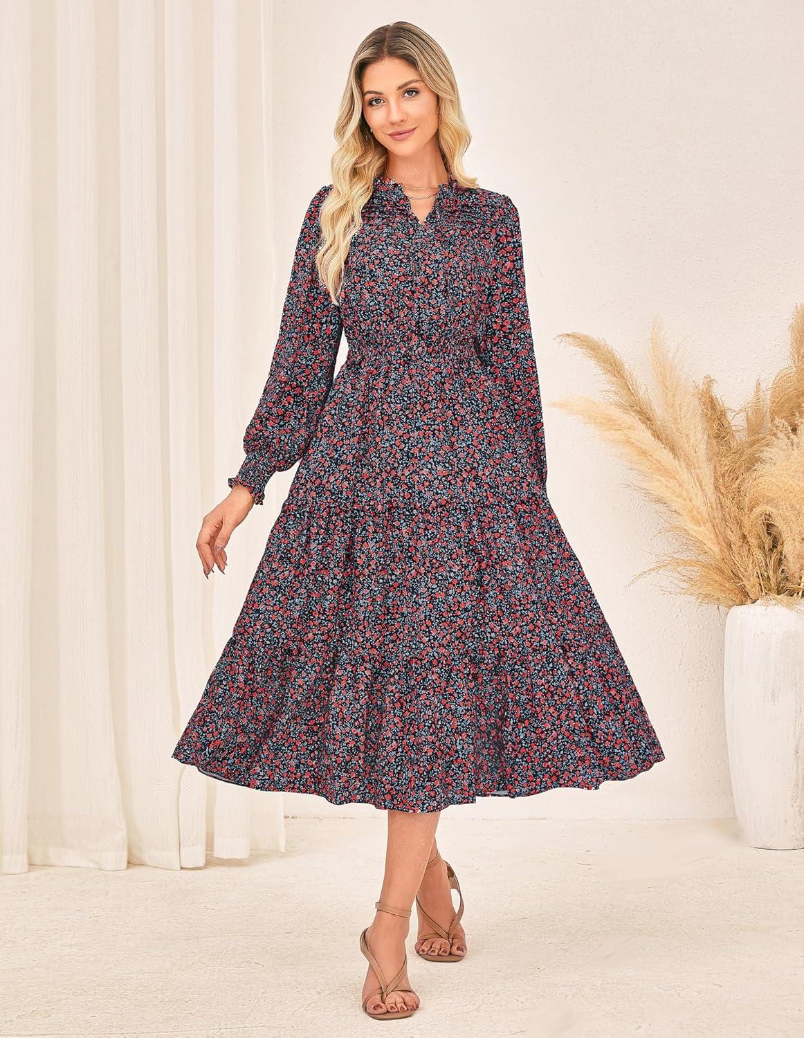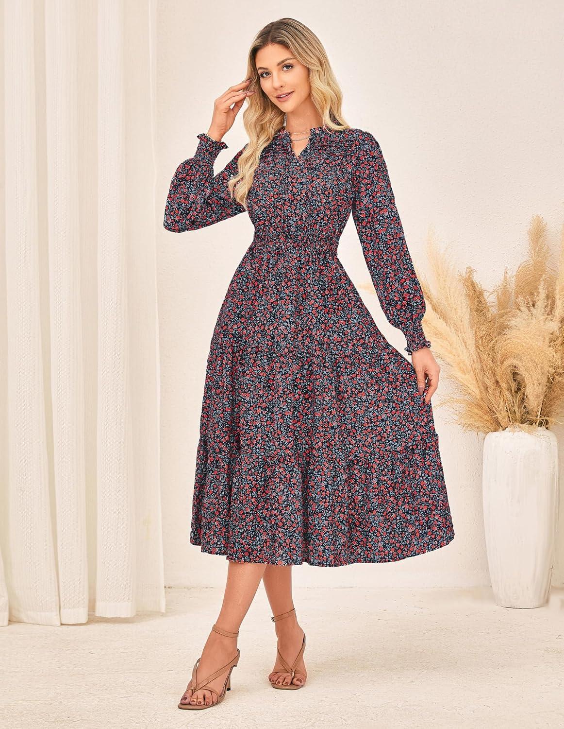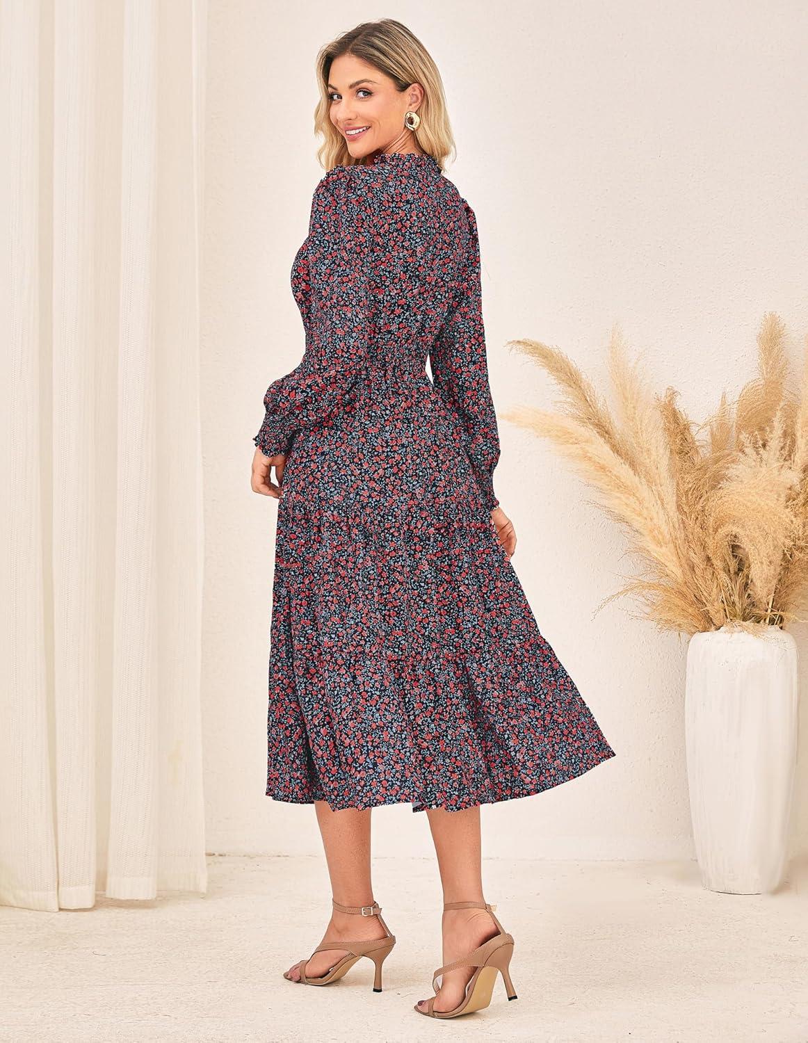imageGRACE KARIN 2025 Womens Summer Floral Midi Dress Boho Long Sleeve V Neck Ruffle Casual A Line Flowy Dresses with PocketRed Floral