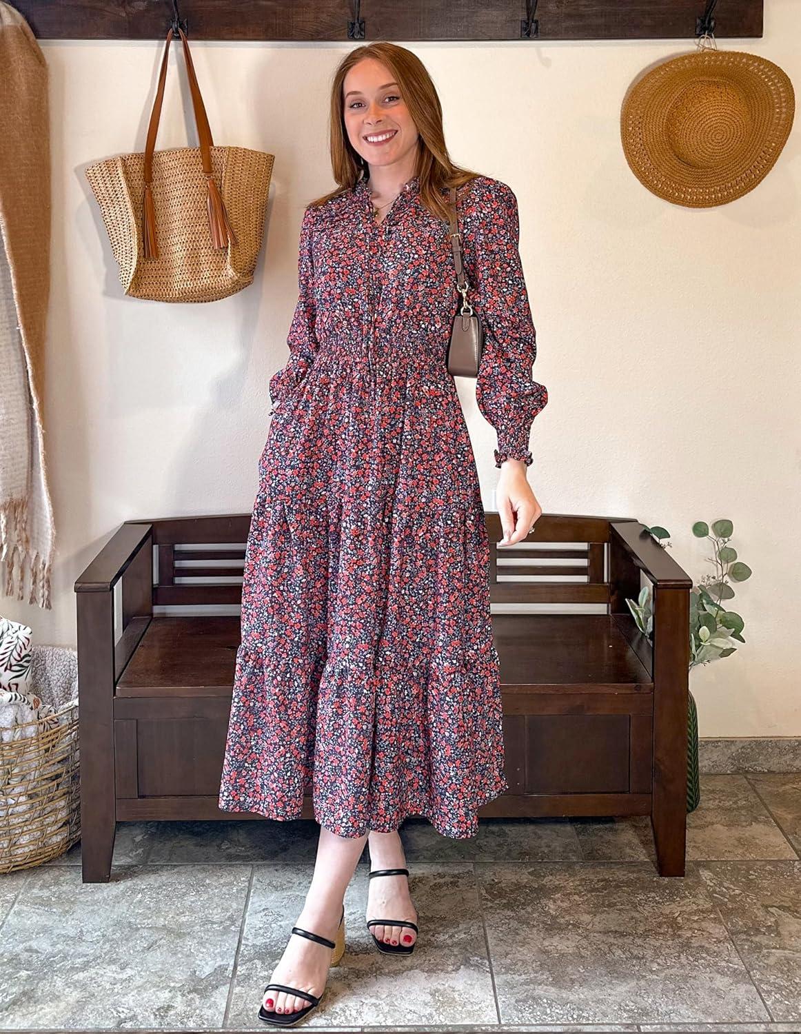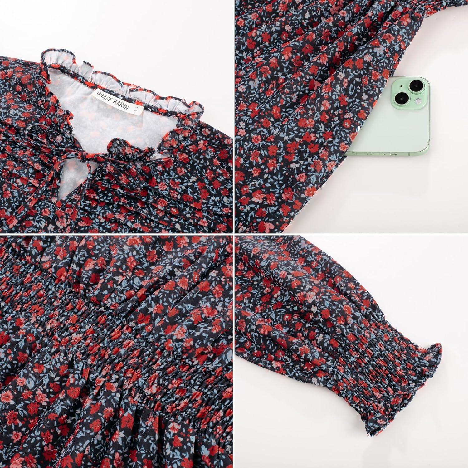 GRACE KARIN 2025 Women’s Summer Floral Midi Dress Boho Long Sleeve V Neck Ruffle Casual A Line Flowy Dresses with Pocket(Red Floral)