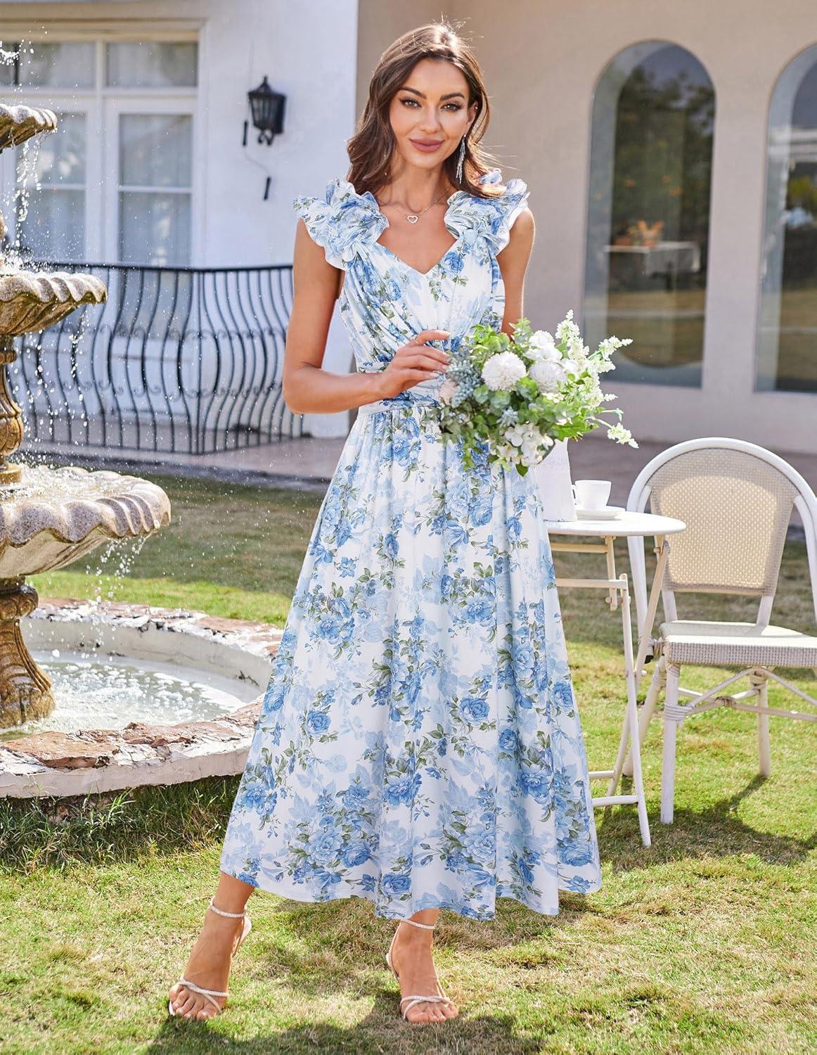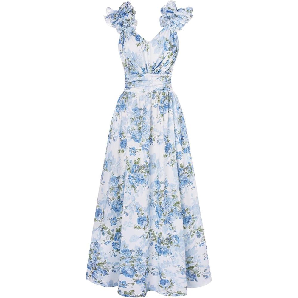 GRACE KARIN 2025 Women’s Summer Floral Print Dress Sleeveless Casual Flowy Sundress A Line Ruffle Wedding Guest Outfit(Blue Green)