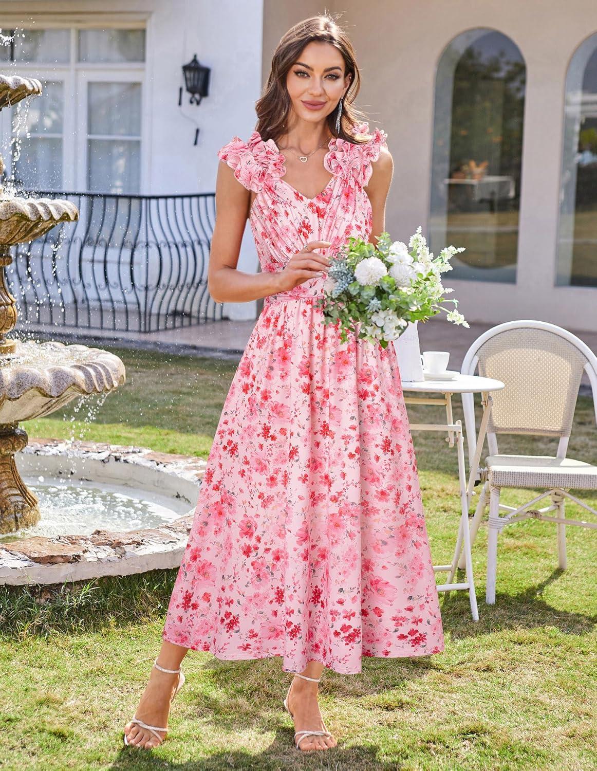 GRACE KARIN 2025 Women's Summer Floral Print Dress Sleeveless Casual Flowy Sundress A Line Ruffle Wedding Guest Outfit(Pink Red)