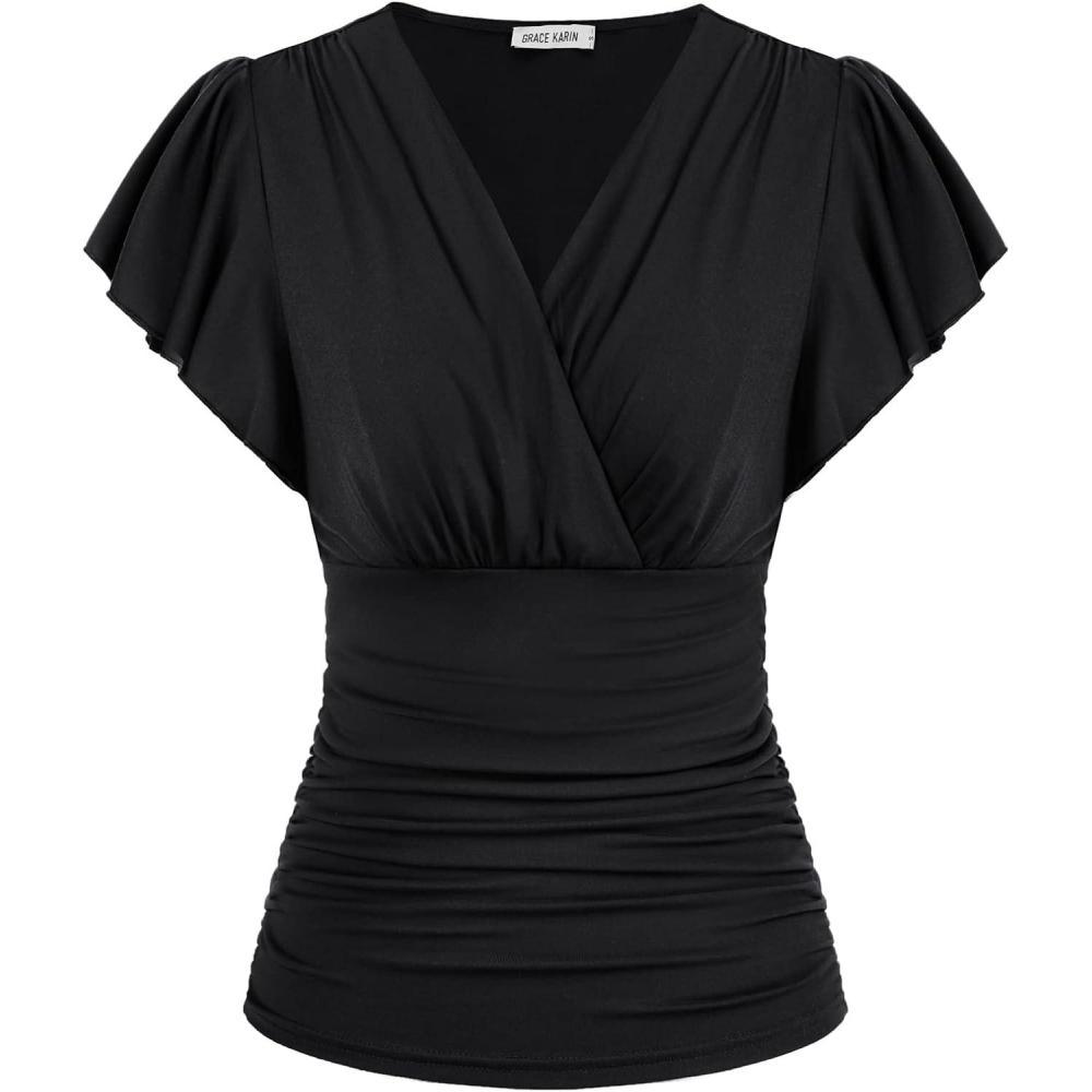 Get more for your money with our exclusive bundle deals on GRACE KARIN 2025 Womens Tops Summer Wrap Blouse V Neck Ruffle Sleeve Dressy Casual Top Ruched T-Shirts(Black) and accessories.