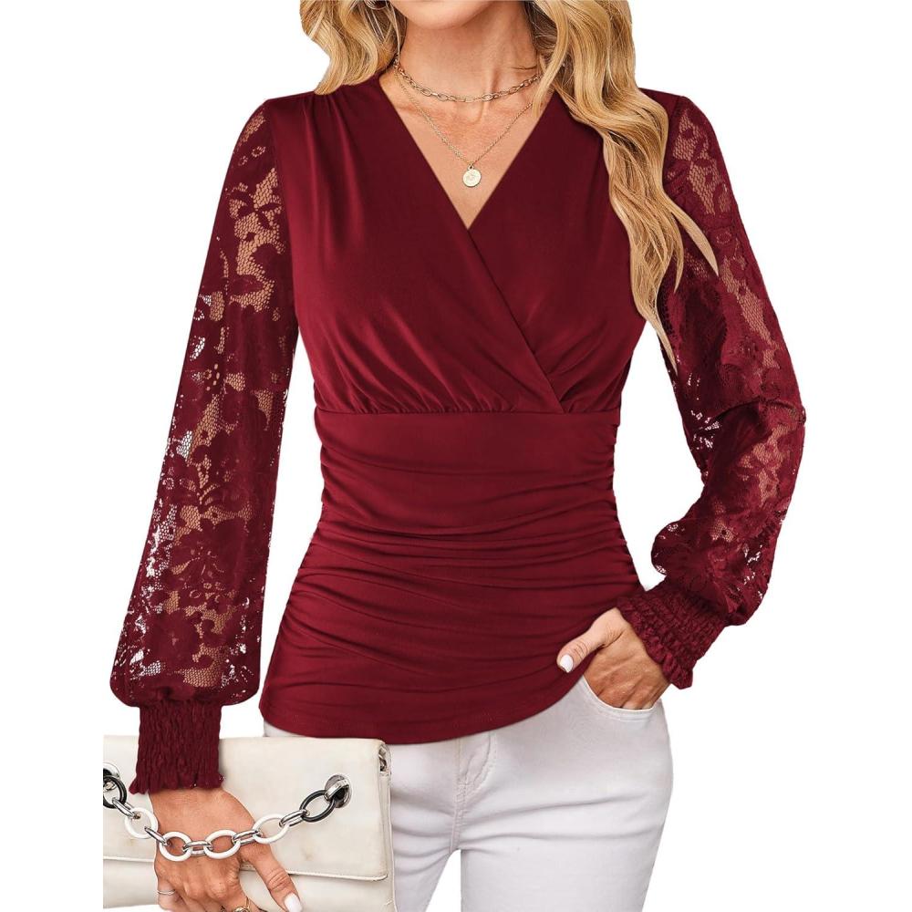 GRACE KARIN 2025 Womens Tops Wrap V Neck Shirt Lace Long Sleeve Blouses Dressy Casual Ruched Top Fall Fashion Outfits(Burgundy)