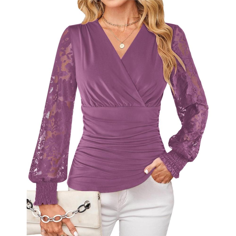 GRACE KARIN 2025 Womens Tops Wrap V Neck Shirt Lace Long Sleeve Blouses Dressy Casual Ruched Top Fall Fashion Outfits(Dusty Purple)