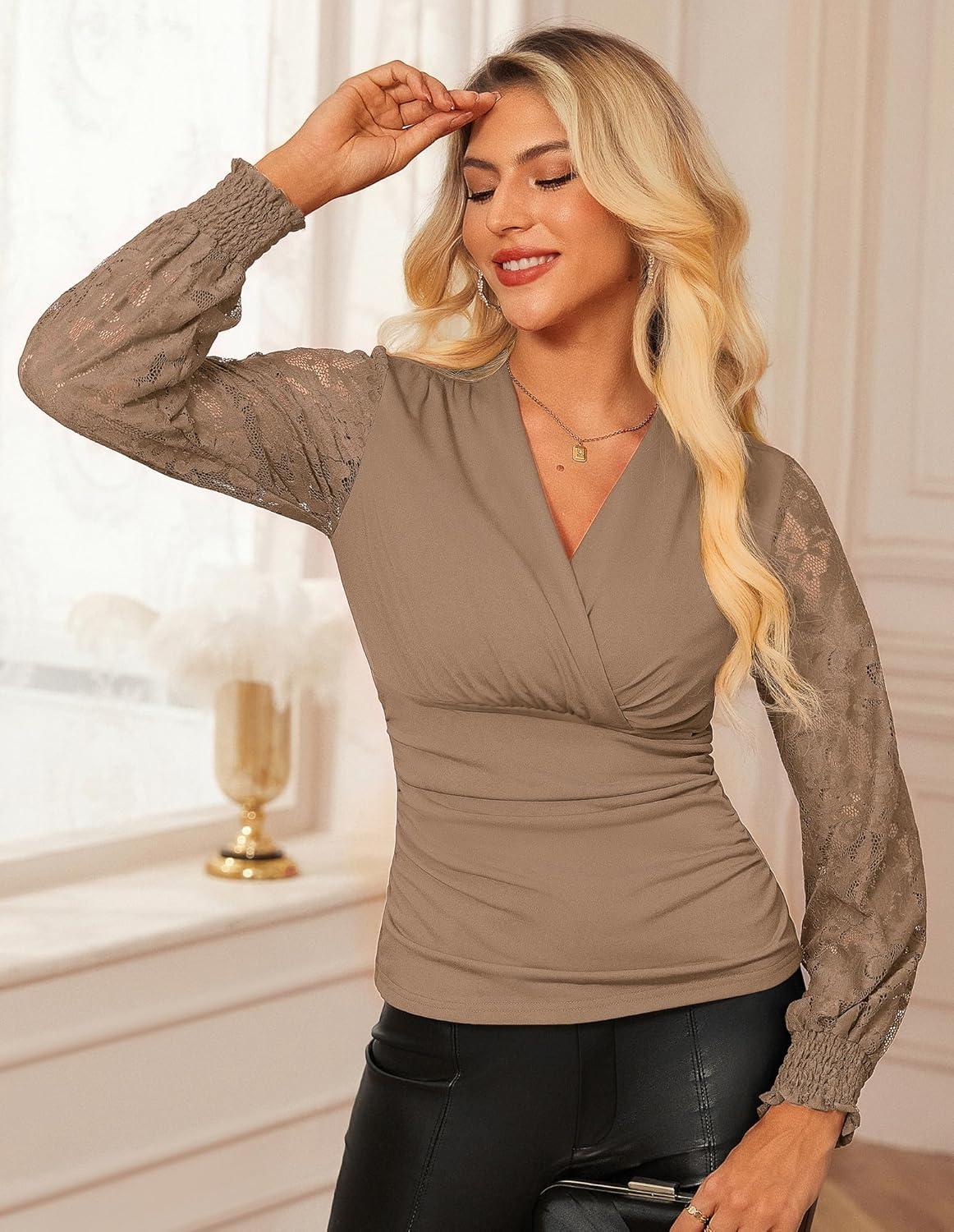 GRACE KARIN 2025 Womens Tops Wrap V Neck Shirt Lace Long Sleeve Blouses Dressy Casual Ruched Top Fall Fashion Outfits(Light Coffee)