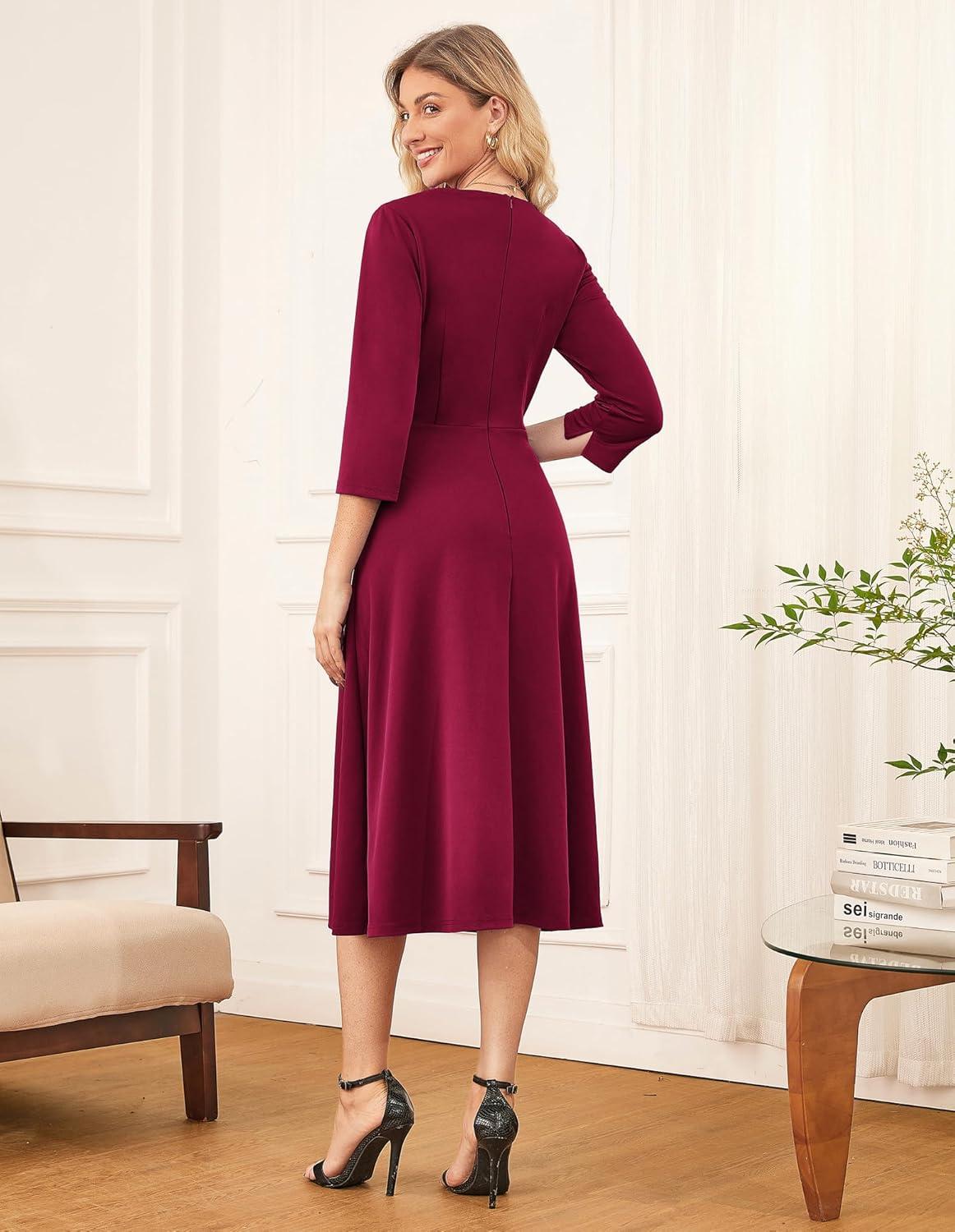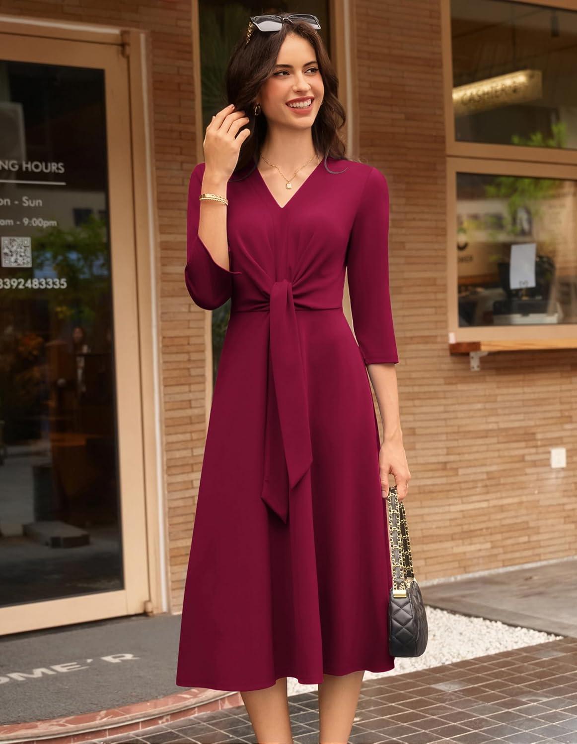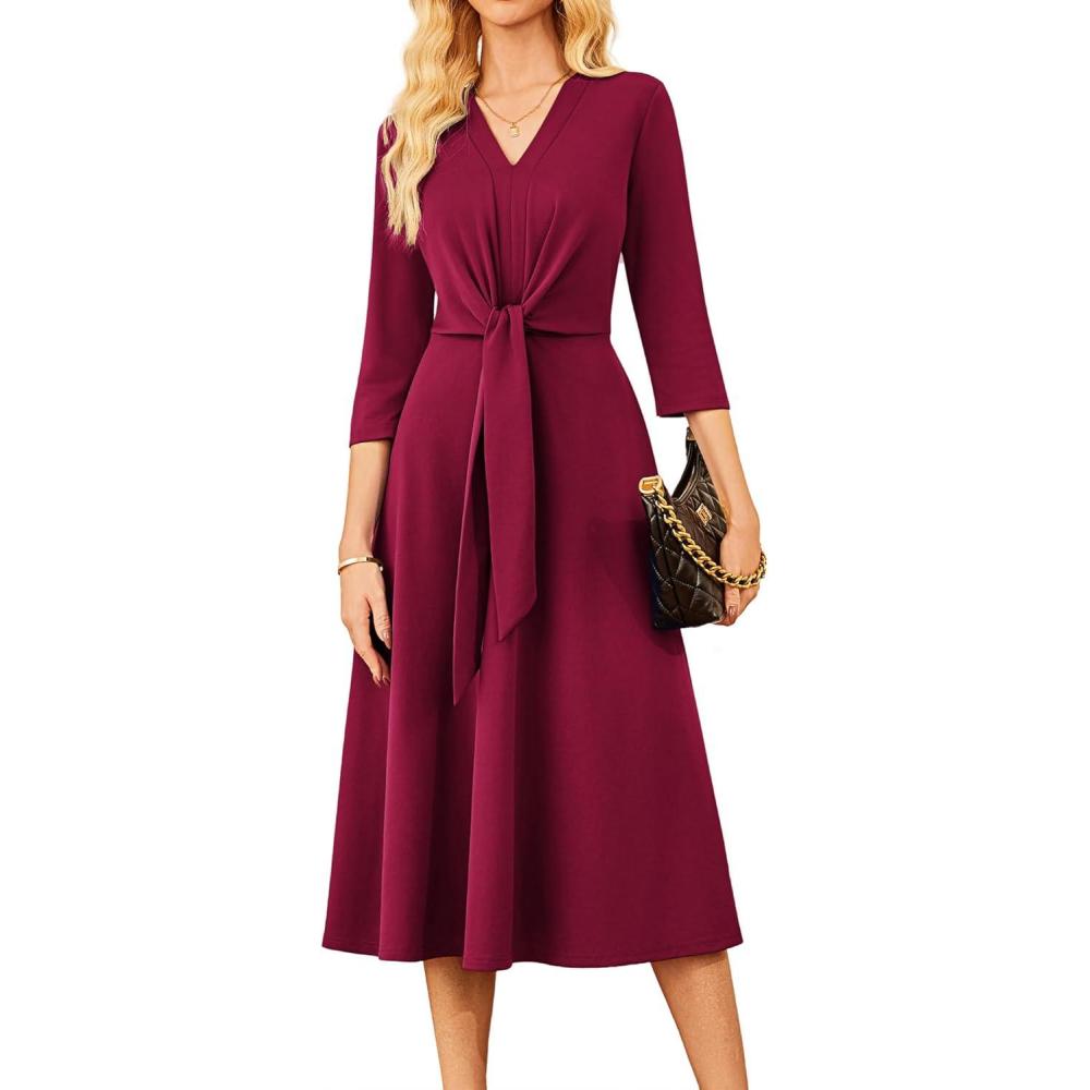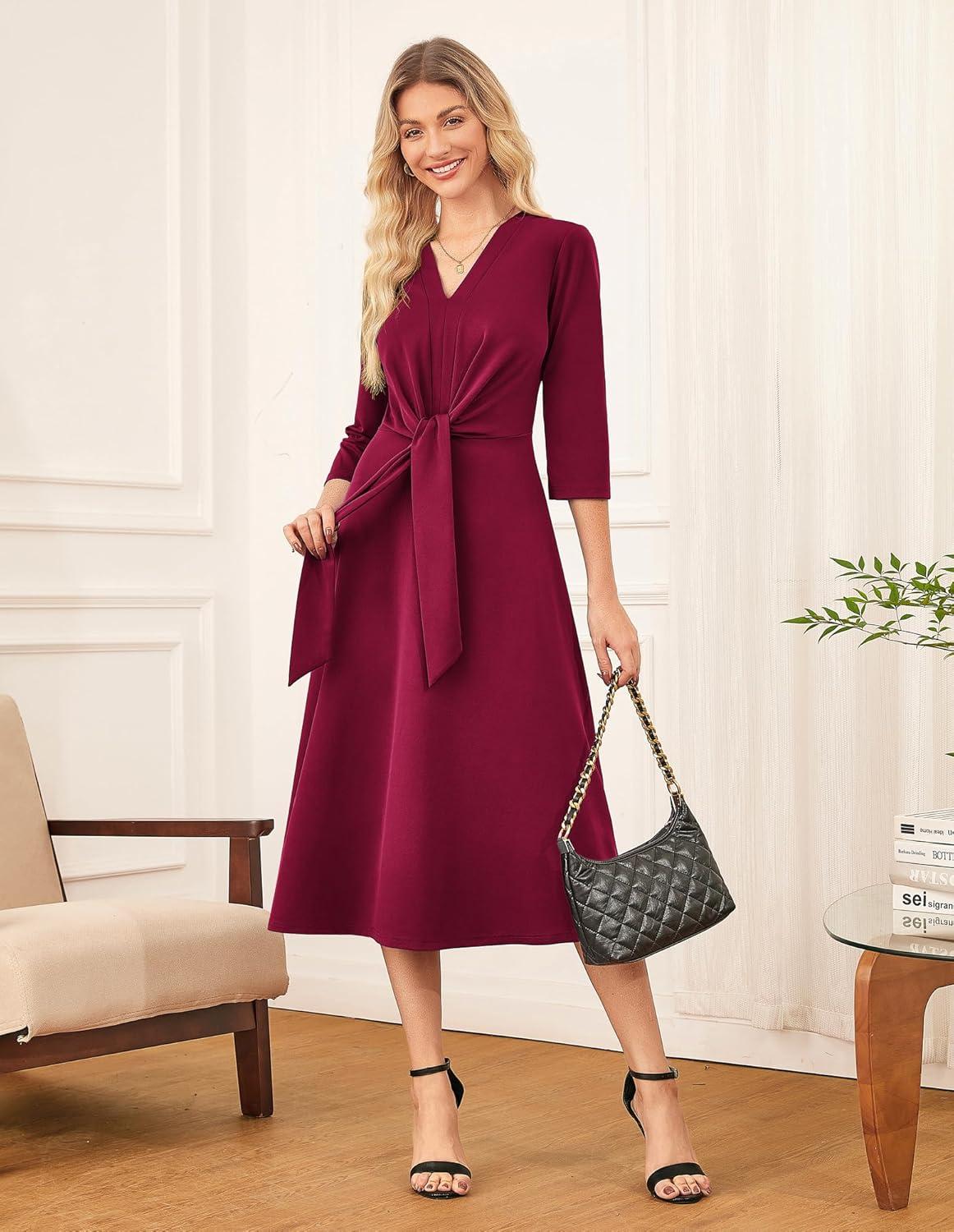 GRACE KARIN 2025 Women’s V Neck 3/4 Sleeve Tie Waist Business Work A Line Midi Dress(Wine Red)