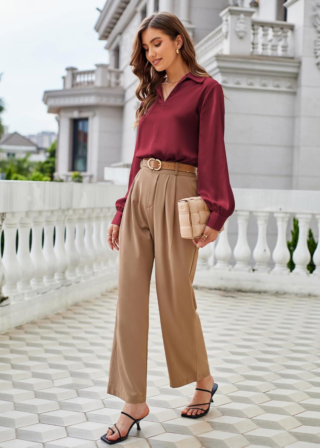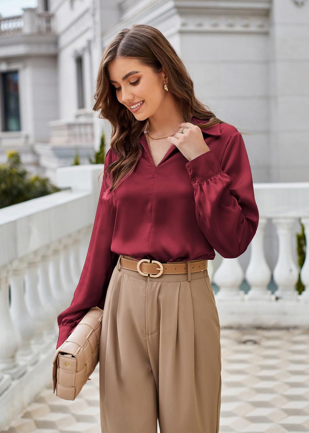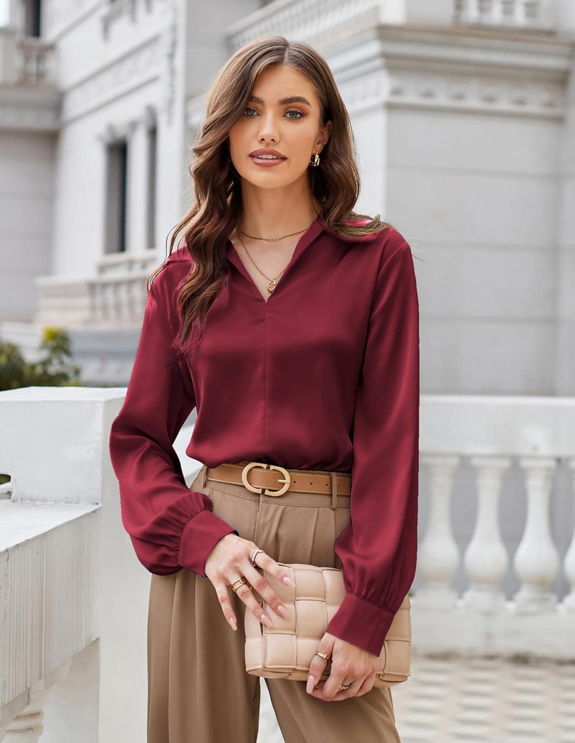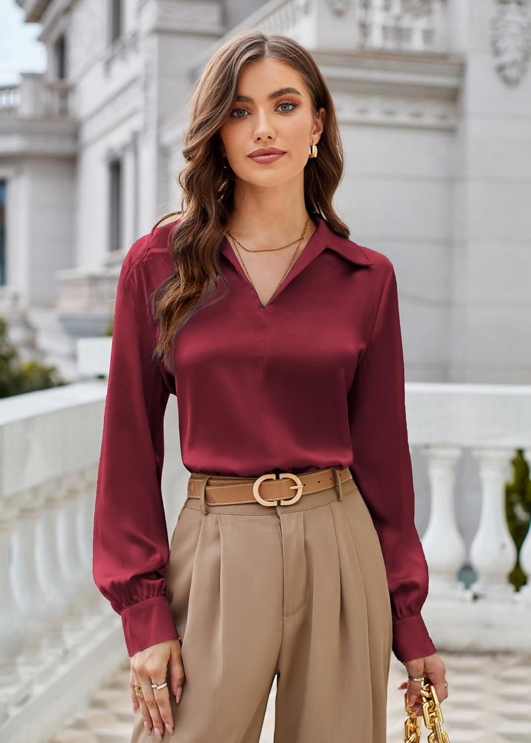 GRACE KARIN Business Casual Tops for Women Satin Silk Blouse Collared V Neck Long Sleeve Work Shirts Dressy Tops Fall Clothes(Wine Red)