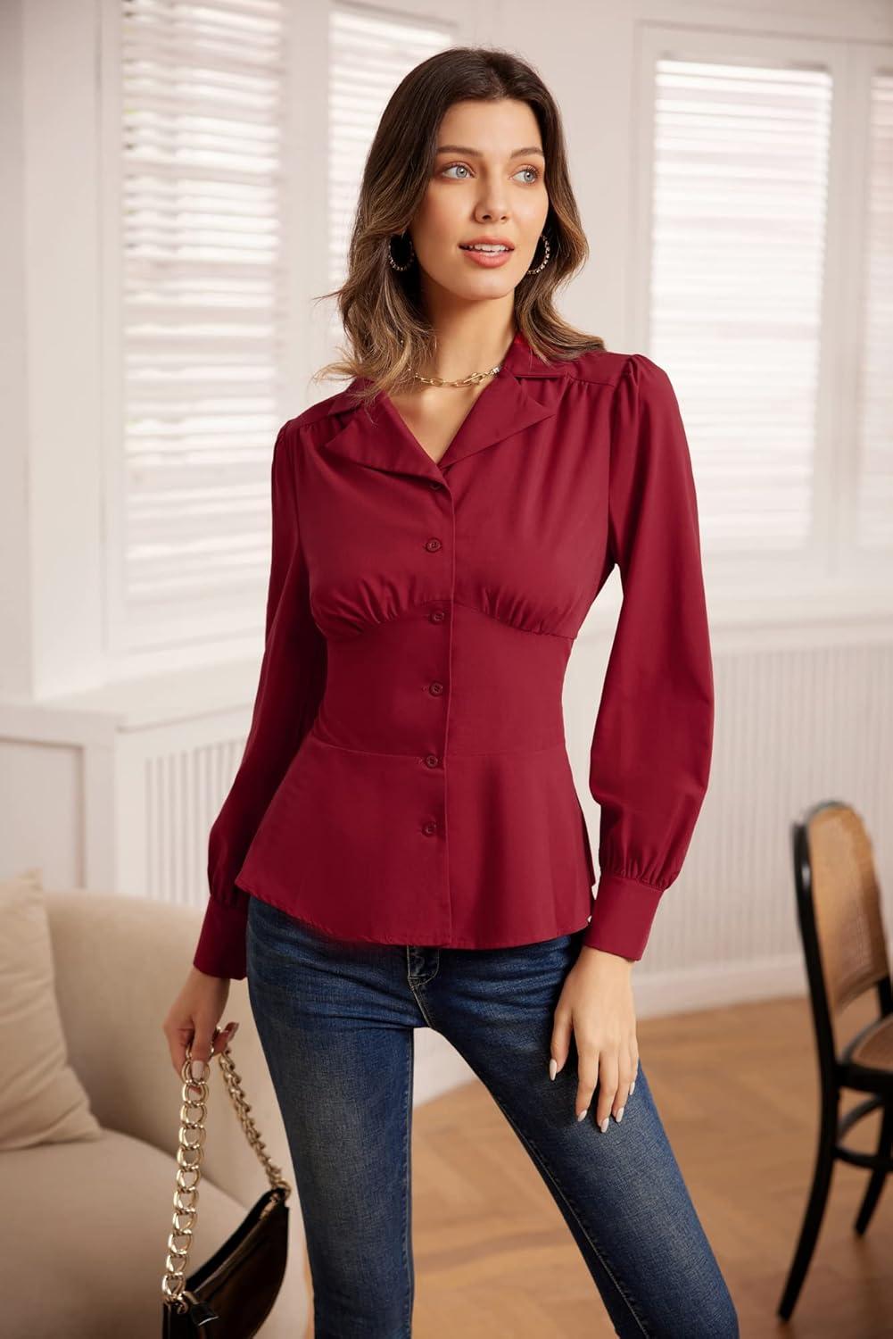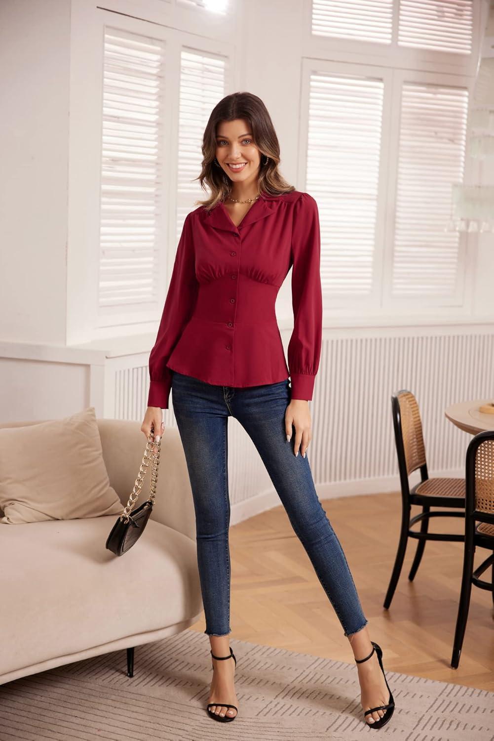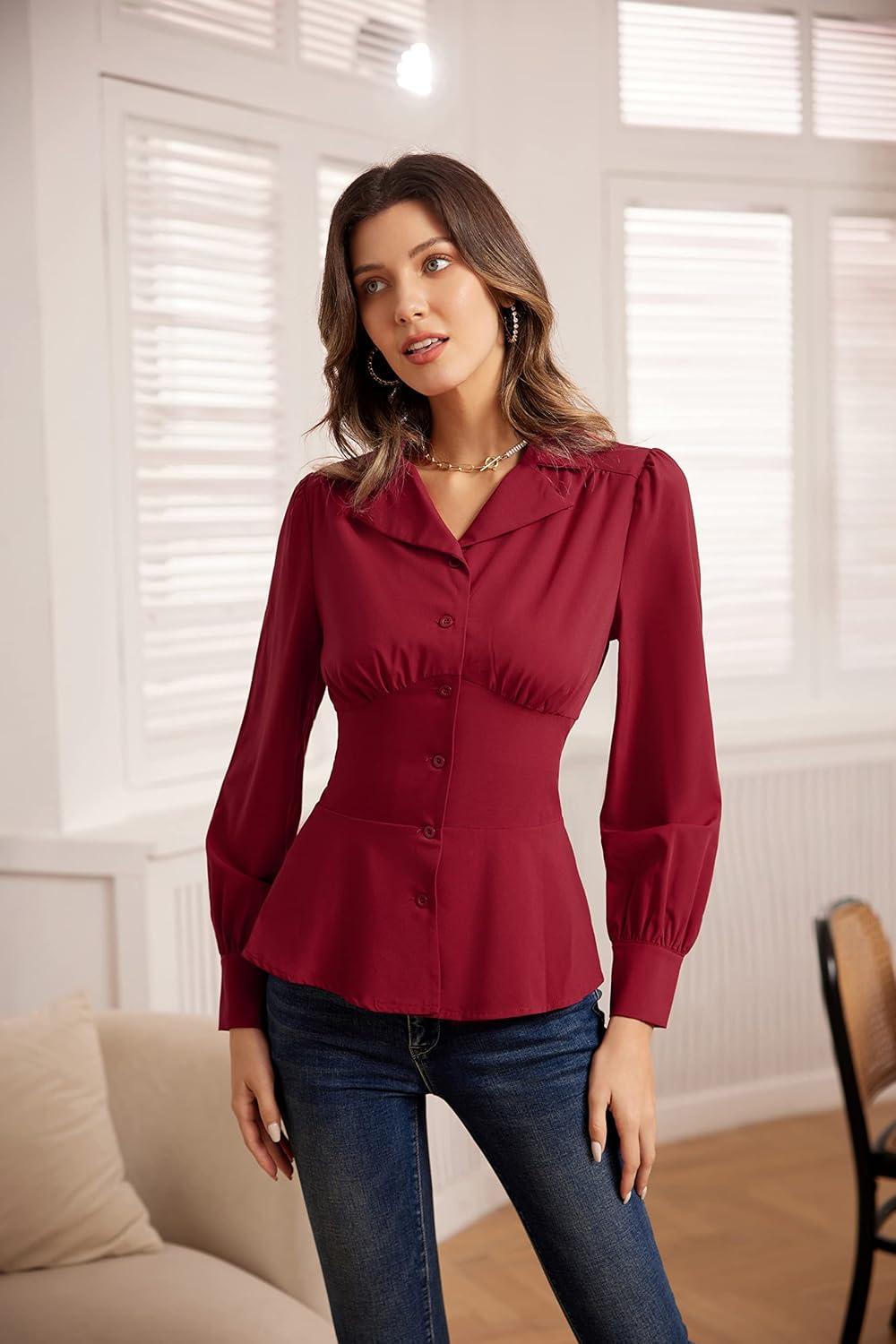 GRACE KARIN Button Down Shirts for Women Summer Peplum Tops Long Sleeve Work Blouse Collared Shirt Dressy Top(Wine Red)