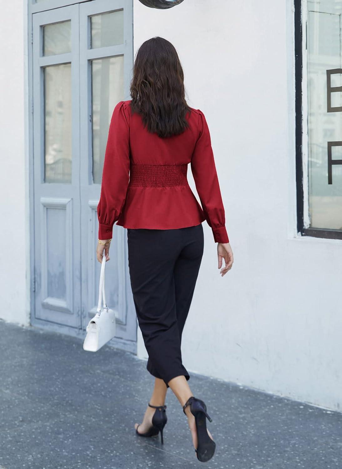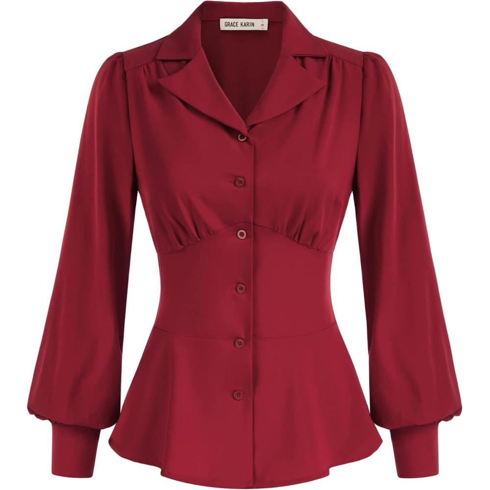 imageGRACE KARIN Button Down Shirts for Women Summer Peplum Tops Long Sleeve Work Blouse Collared Shirt Dressy TopWine Red