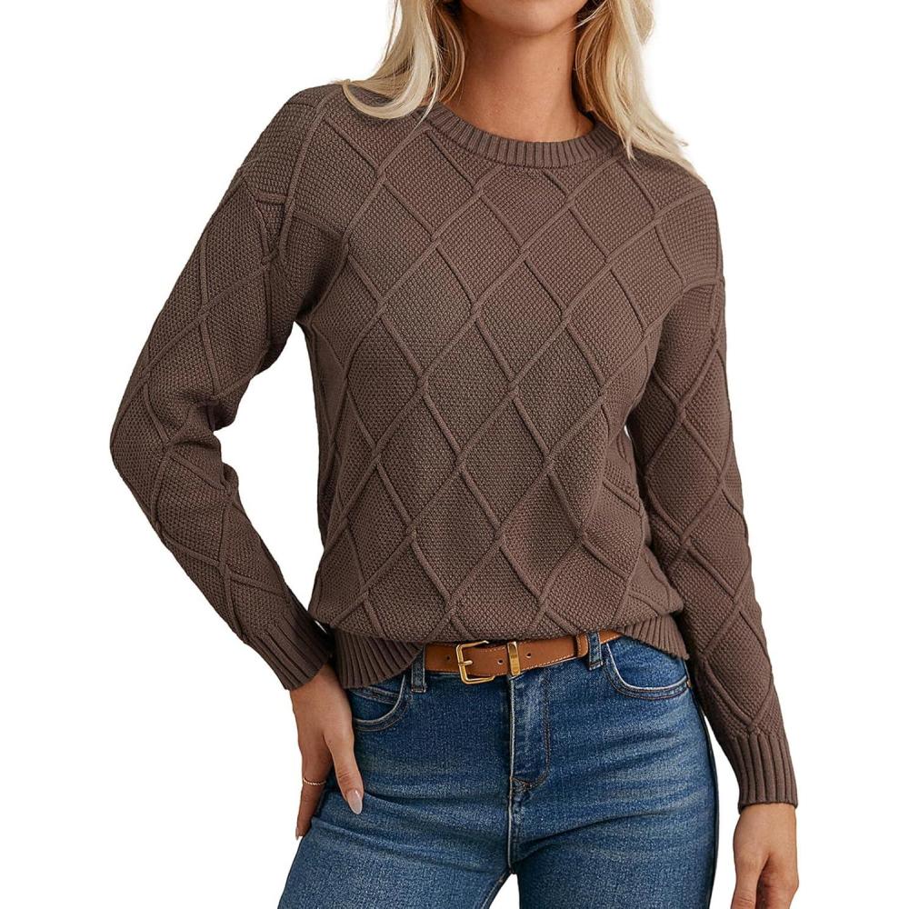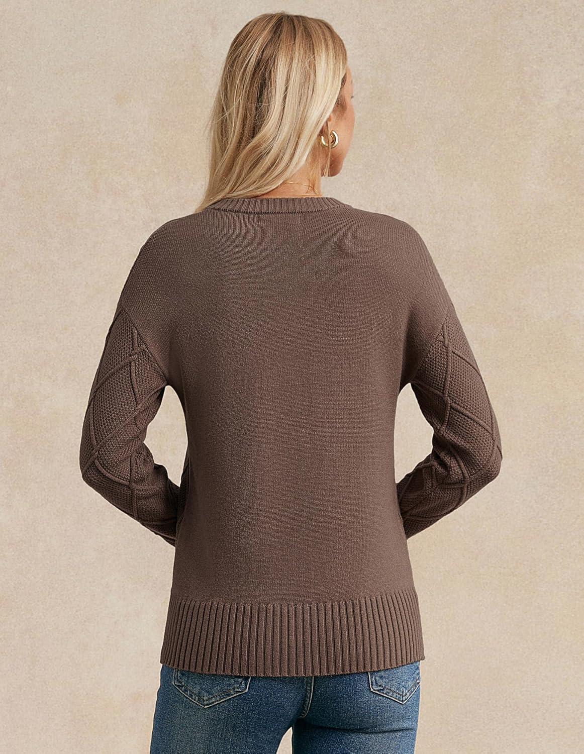 GRACE KARIN Cable Knit Sweater Women Long Sleeve Crew Neck Pullover Sweaters Slit Hem Casual Dressy Sweater Tops(Coffee)