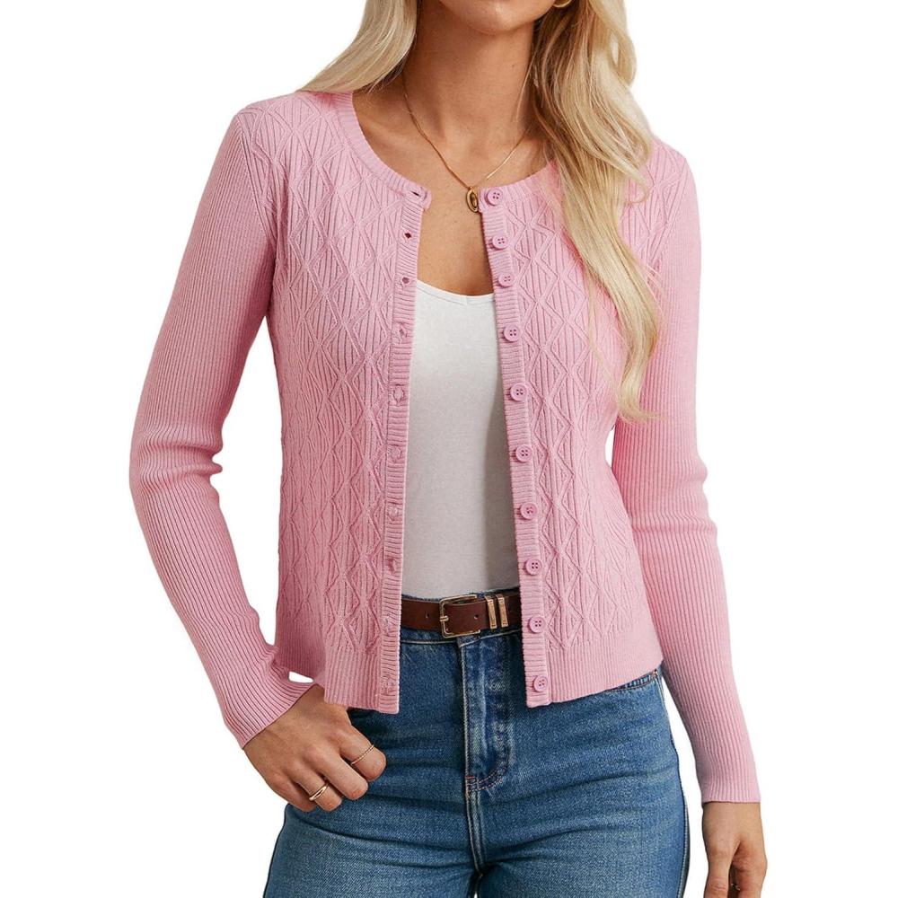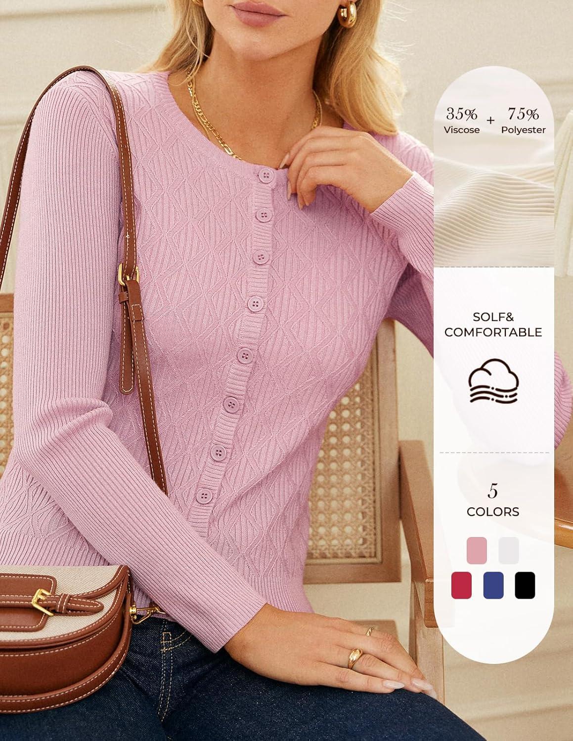 GRACE KARIN Cardigans for Women Lightweight Long Sleeve Button up Crop Cardigans Crew Neck Sweater Business Casual Outfits(Pink)