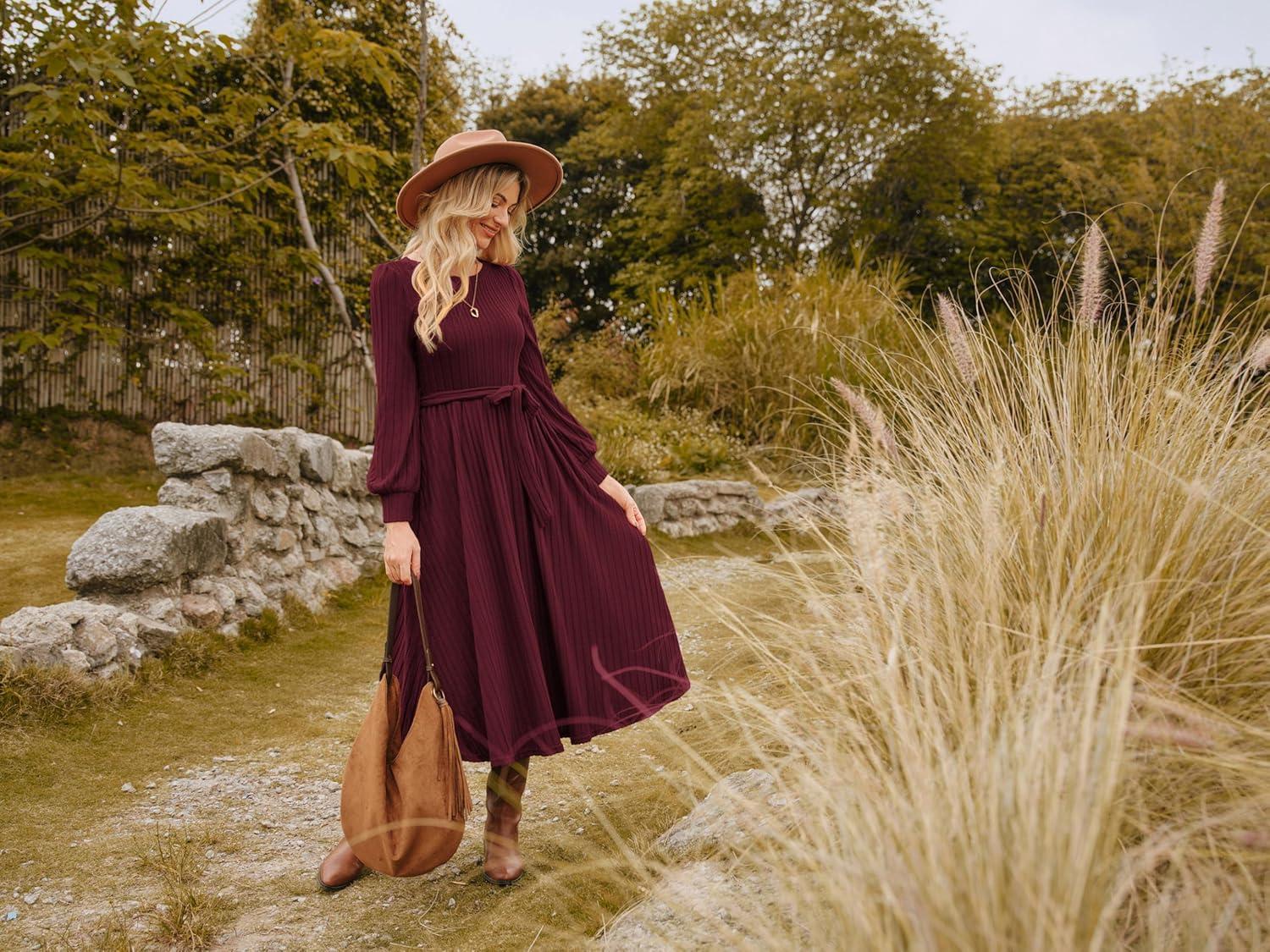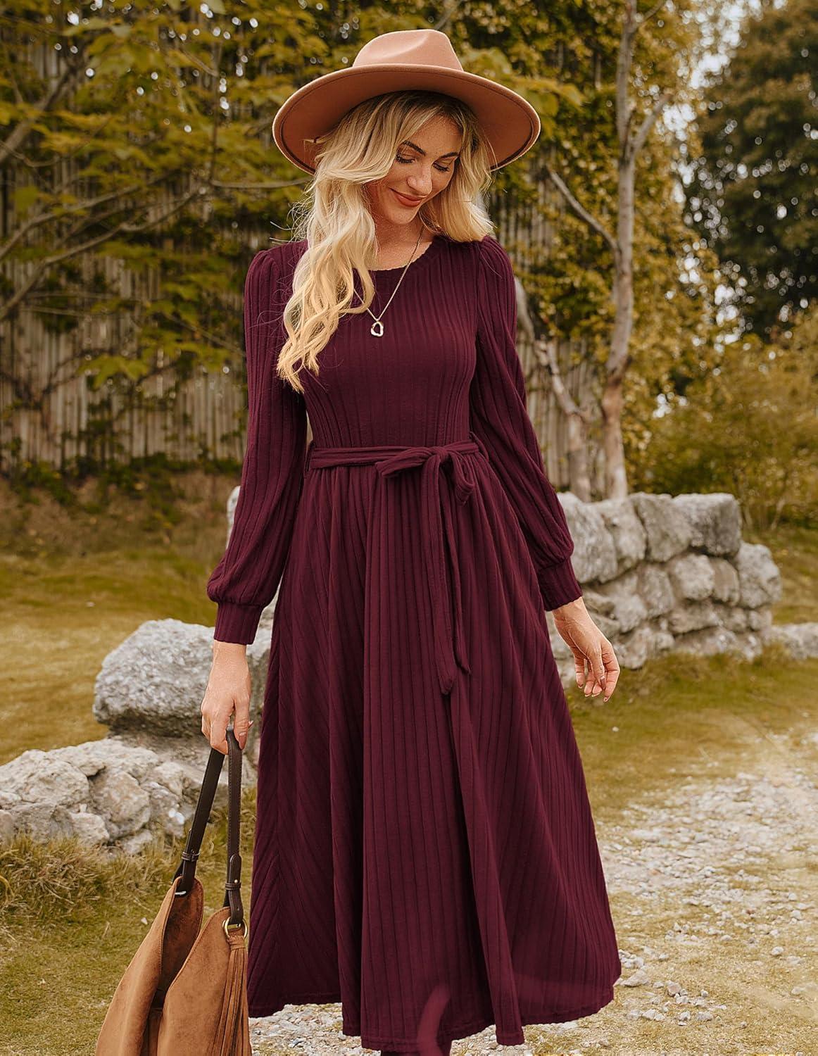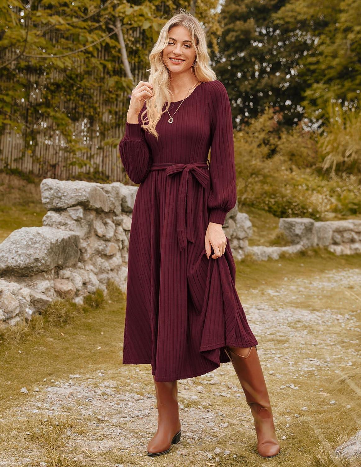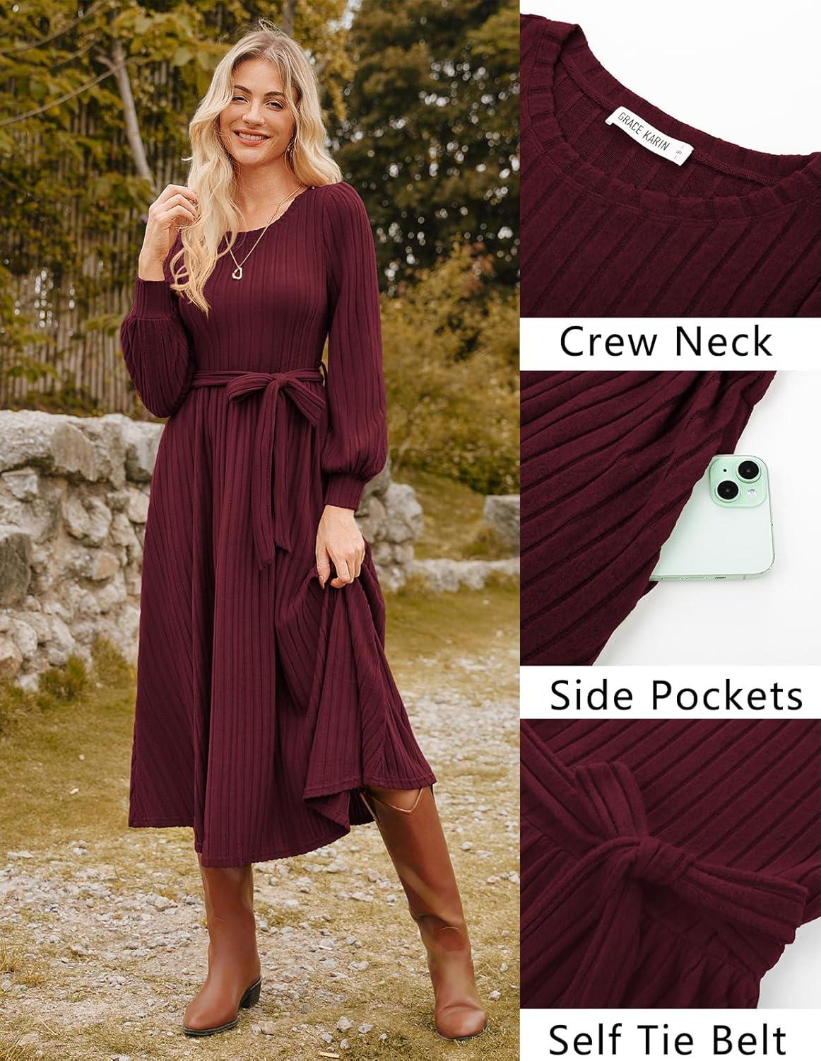 GRACE KARIN Casual Long Sleeve Dress 2025 A Line, Fall Sweater Dresses Ribbed, Crew Neck Midi Dress with Pocket(Wine Red)