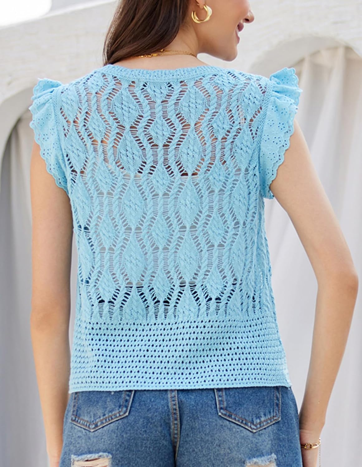 GRACE KARIN Crochet Cropped Cardigan Sweater Vest Ruffle Sleeve Lace Button Up Lightweight Bolero Shrugs for Dress Top 2024(Blue)