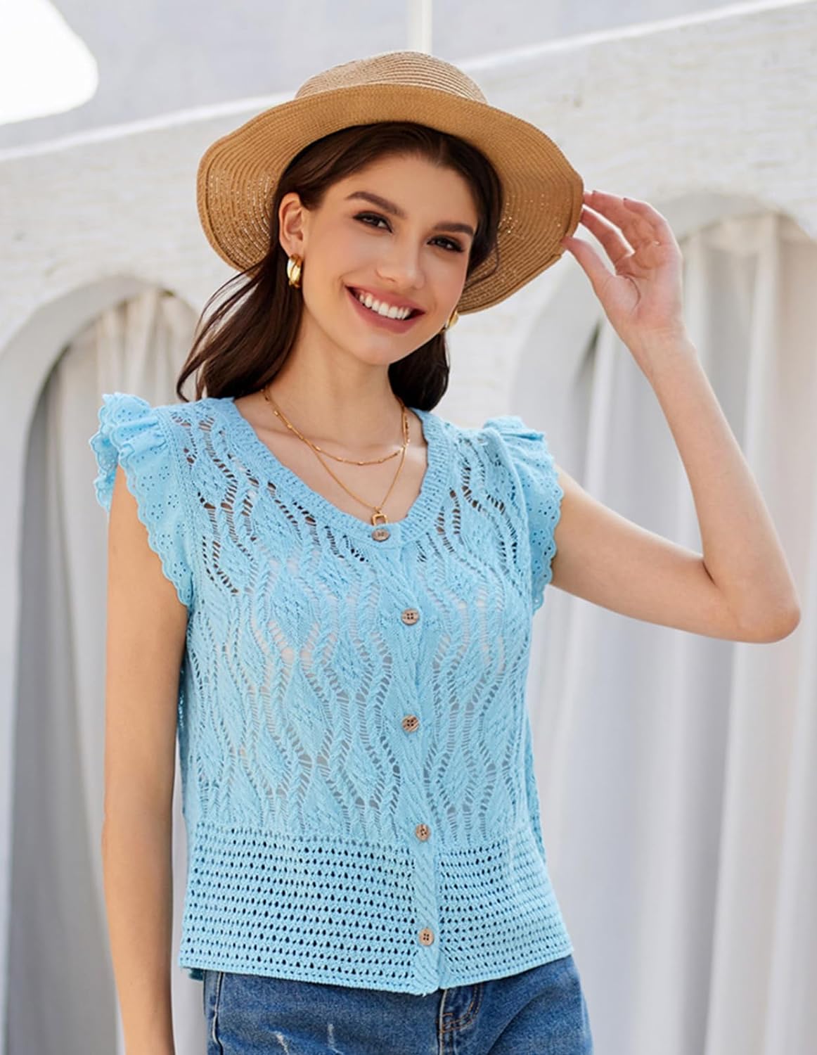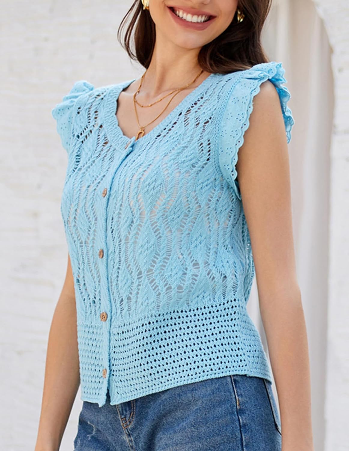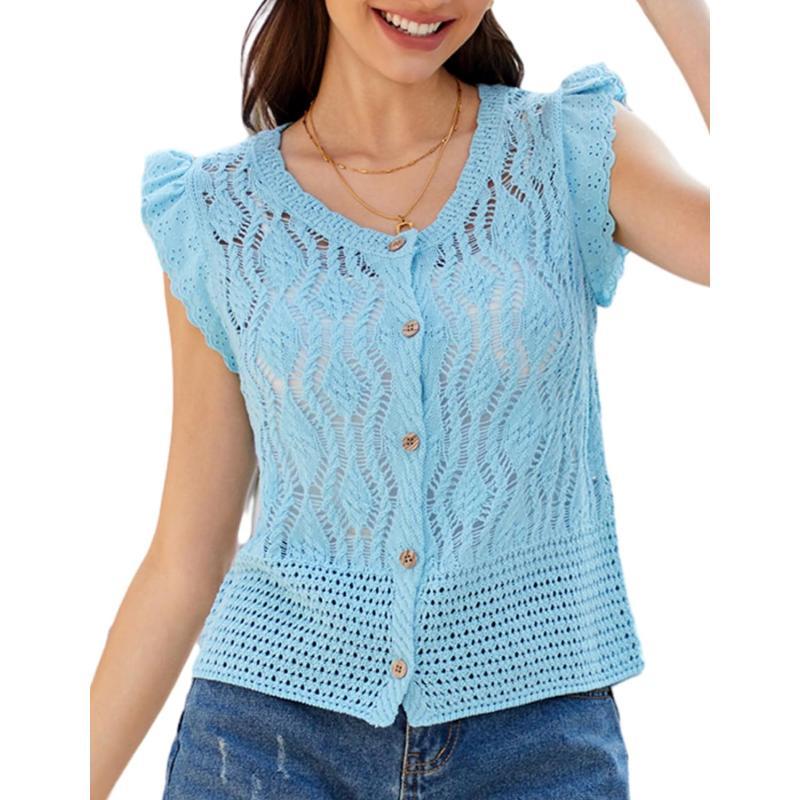 GRACE KARIN Crochet Cropped Cardigan Sweater Vest Ruffle Sleeve Lace Button Up Lightweight Bolero Shrugs for Dress Top 2024Blue