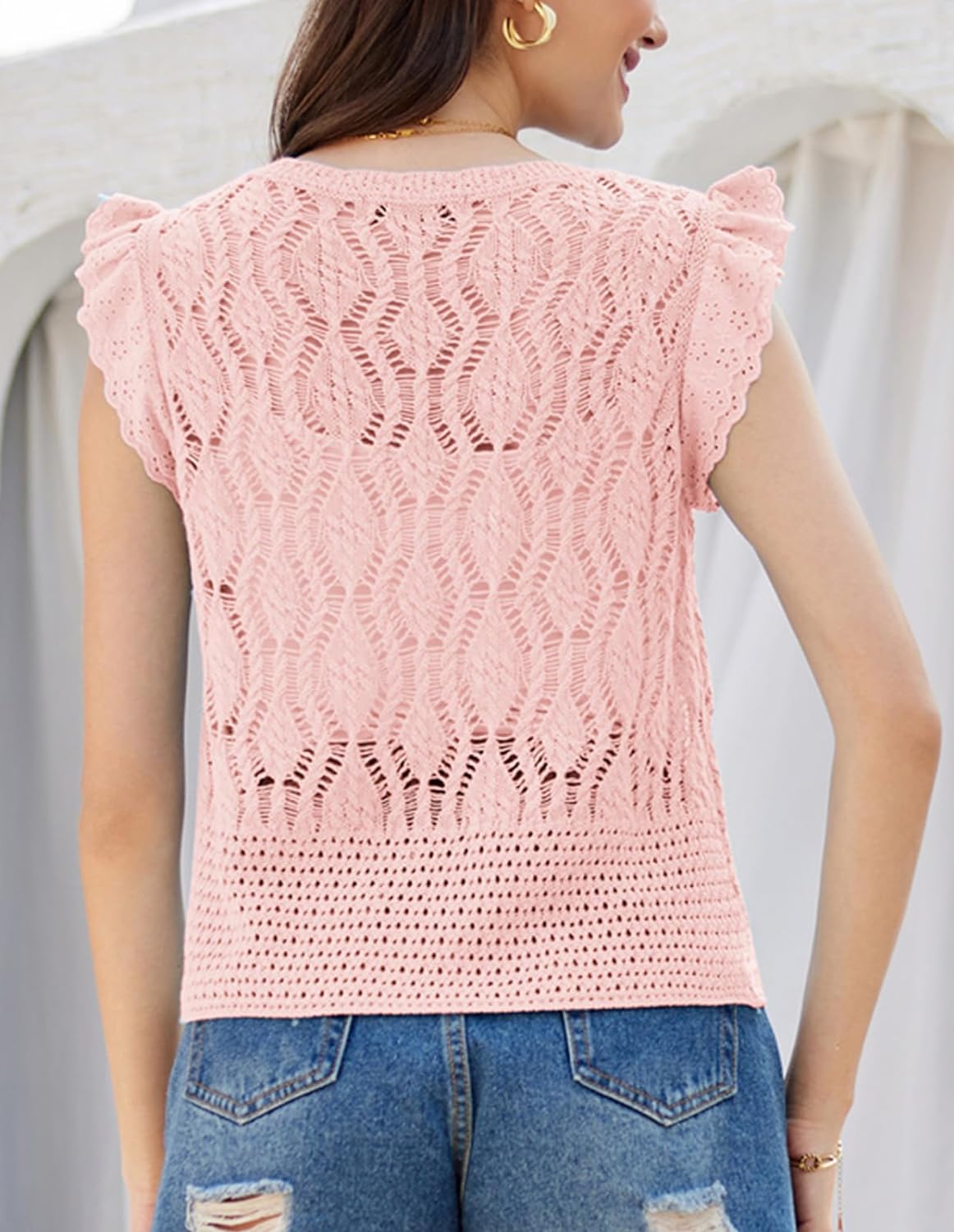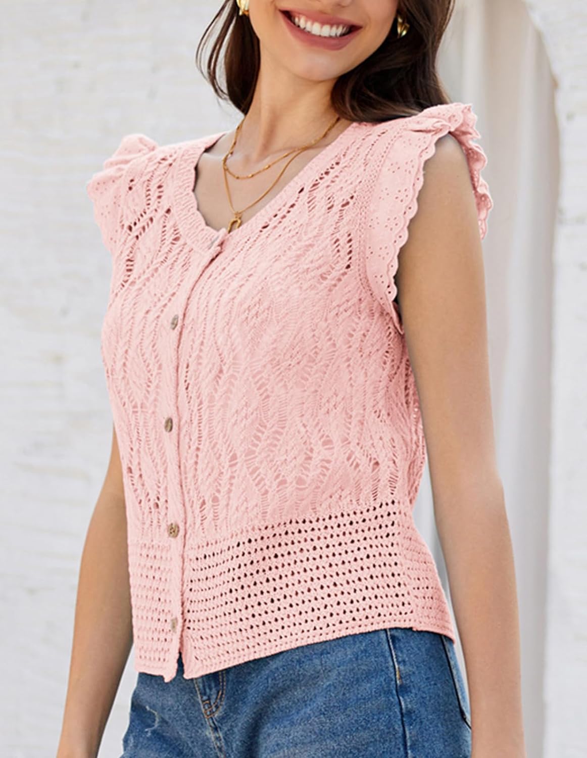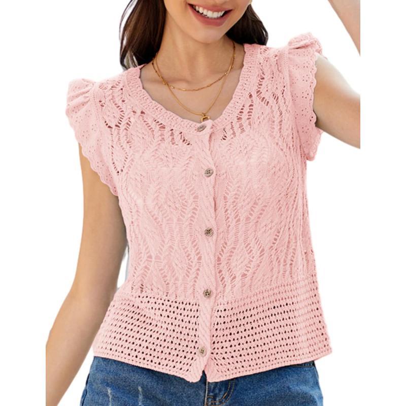 GRACE KARIN Crochet Cropped Cardigan Sweater Vest Ruffle Sleeve Lace Button Up Lightweight Bolero Shrugs for Dress Top 2024Pink