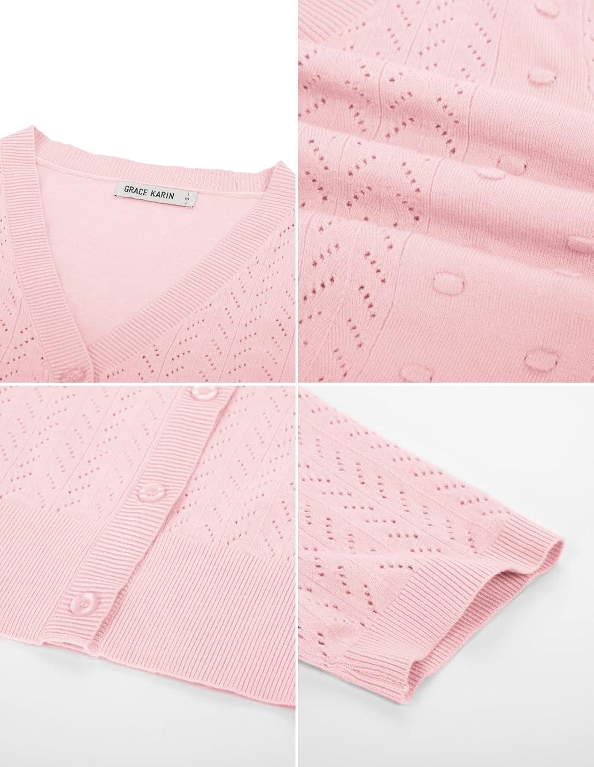 GRACE KARIN Cropped Cardigan Sweaters for Women Short Sleeve Crochet Knit Bolero Shrug V-Neck Button up Tops(Light Pink)