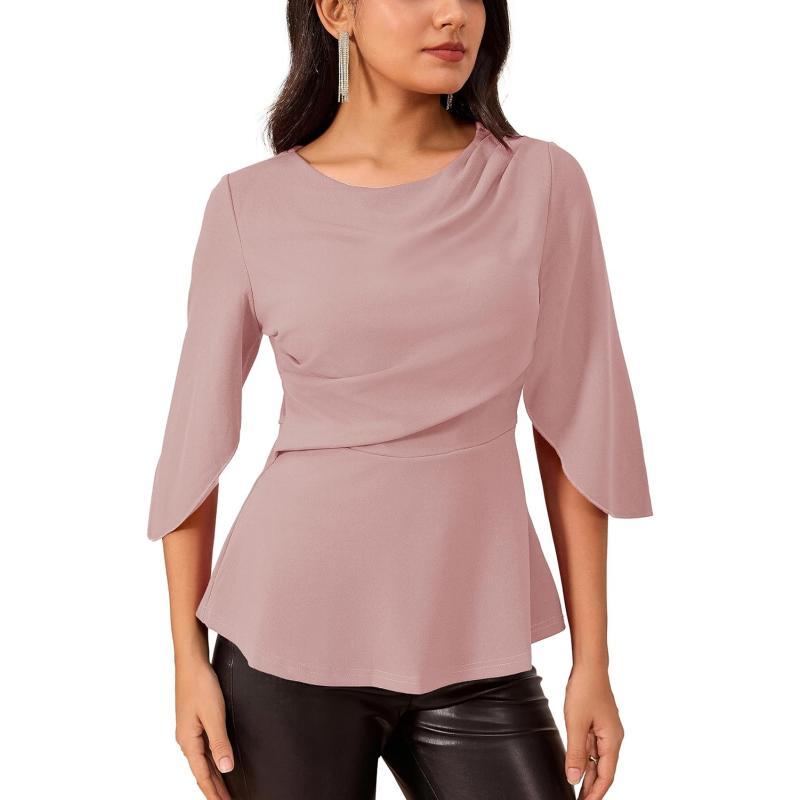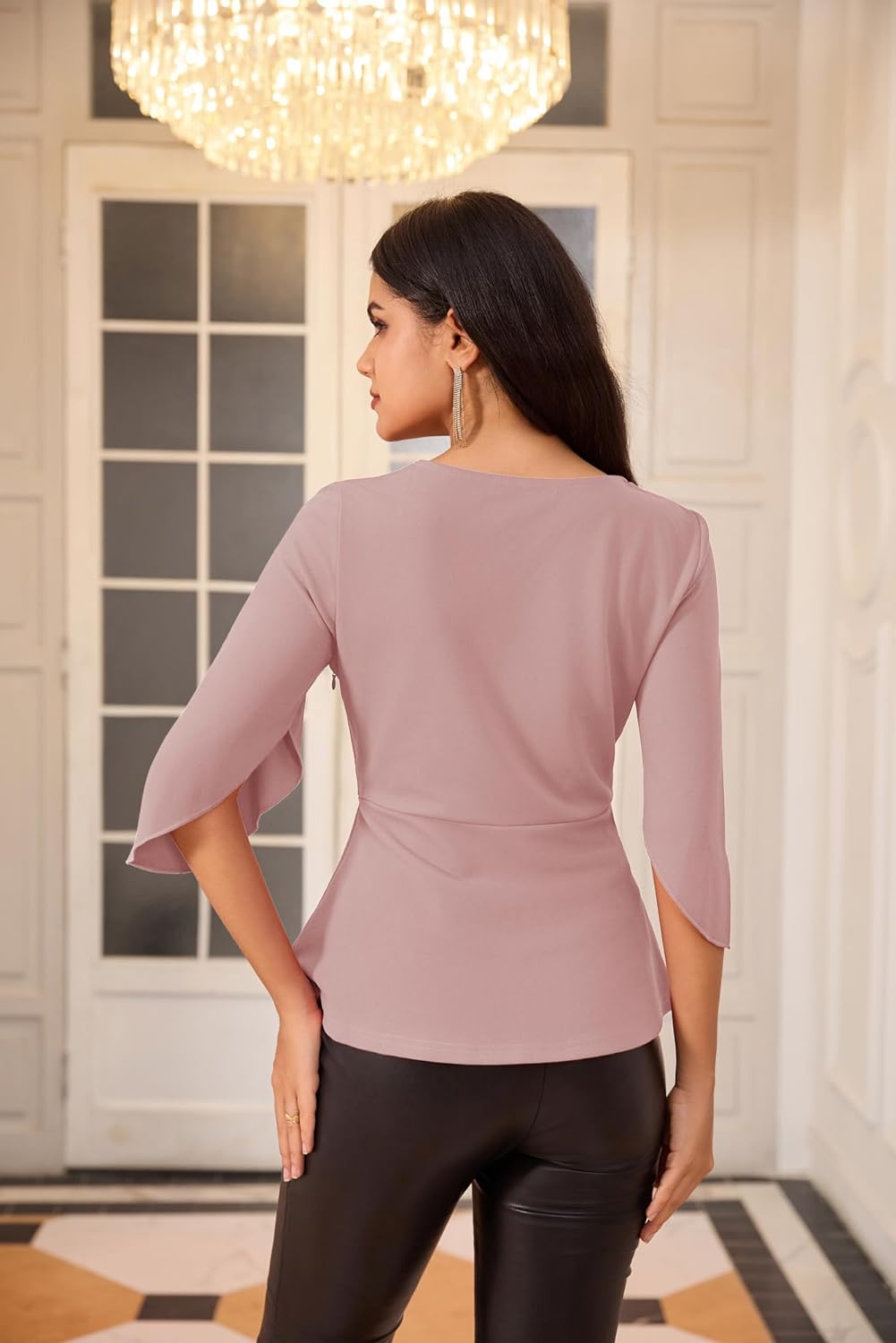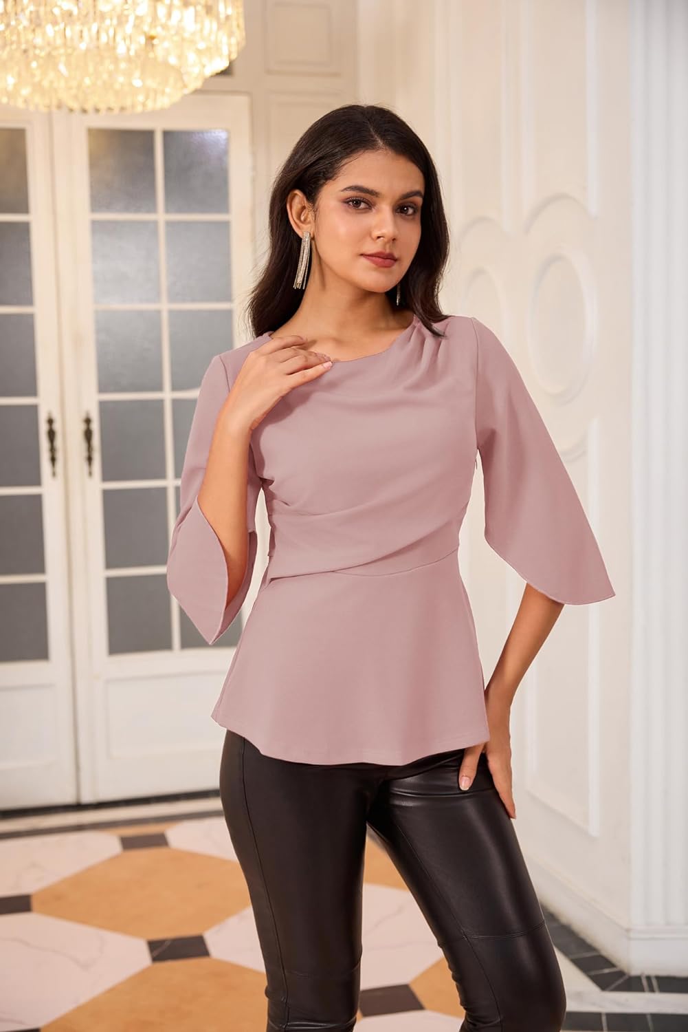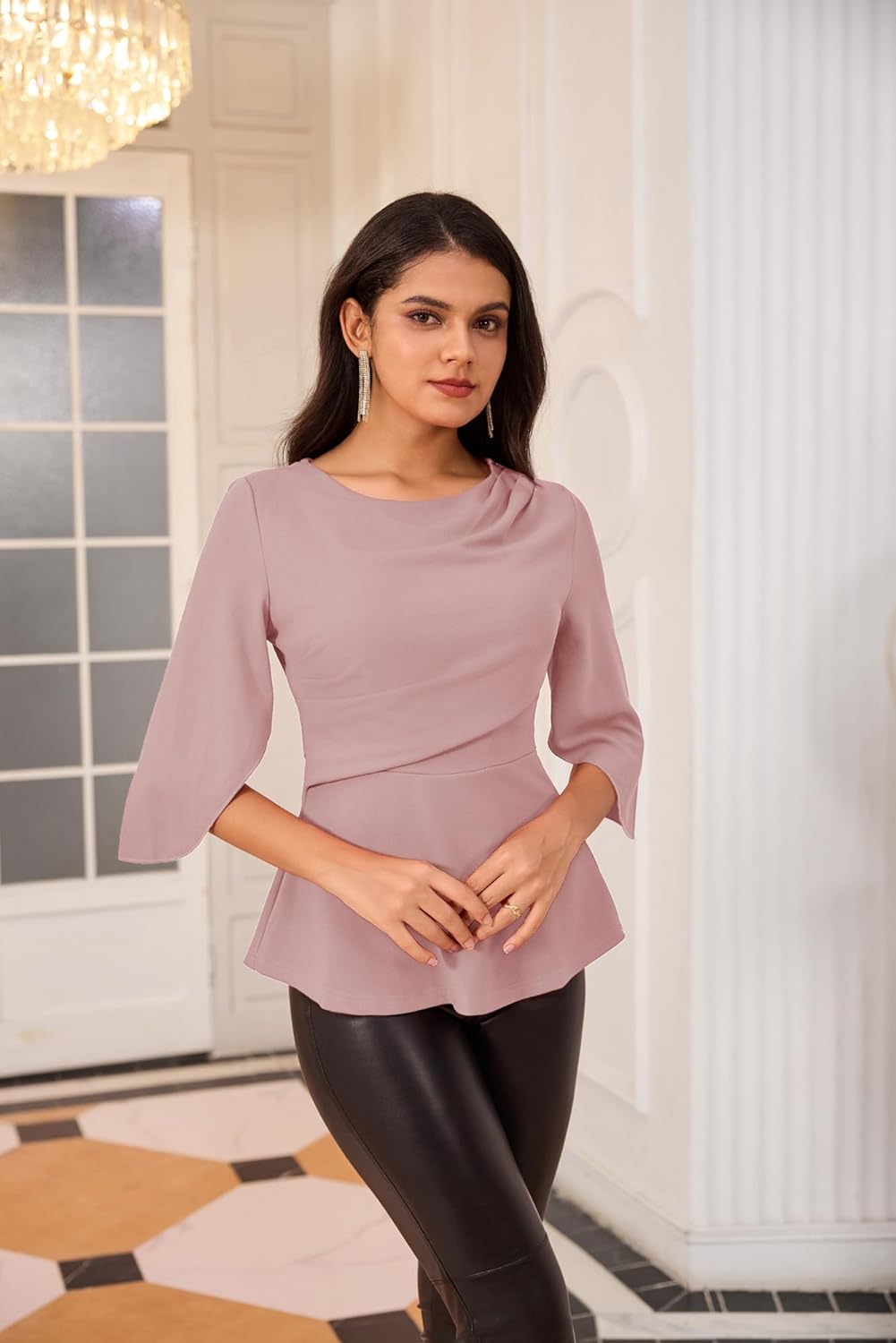 【Unique Feature】 The trendy business casual tops for women has flattering irregular 3/4 sleeve,side zipper, peplum hem, A-Line style, shoulder and belly ruching chic design. Stretchy material makes it suitable for various body types.