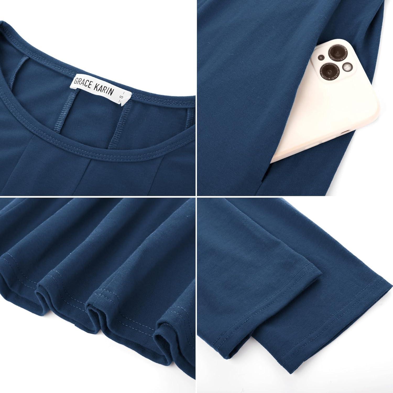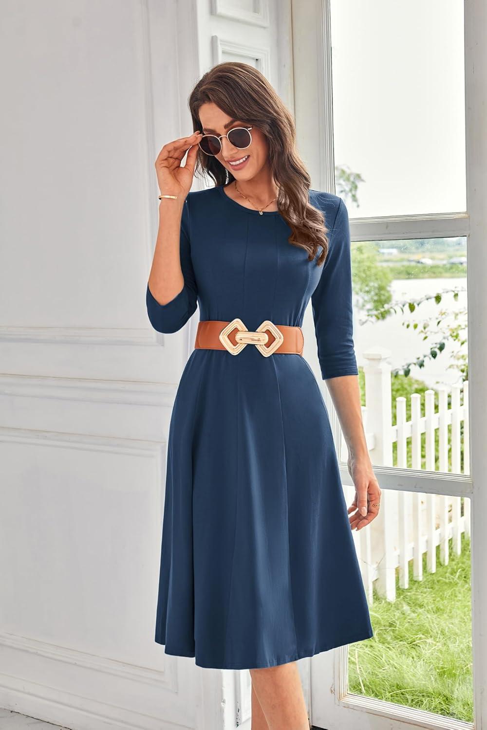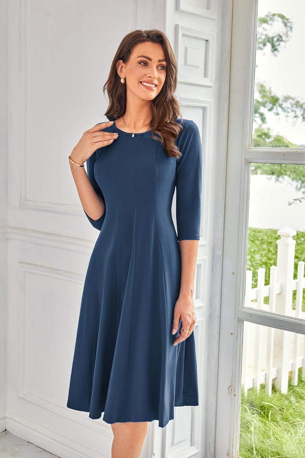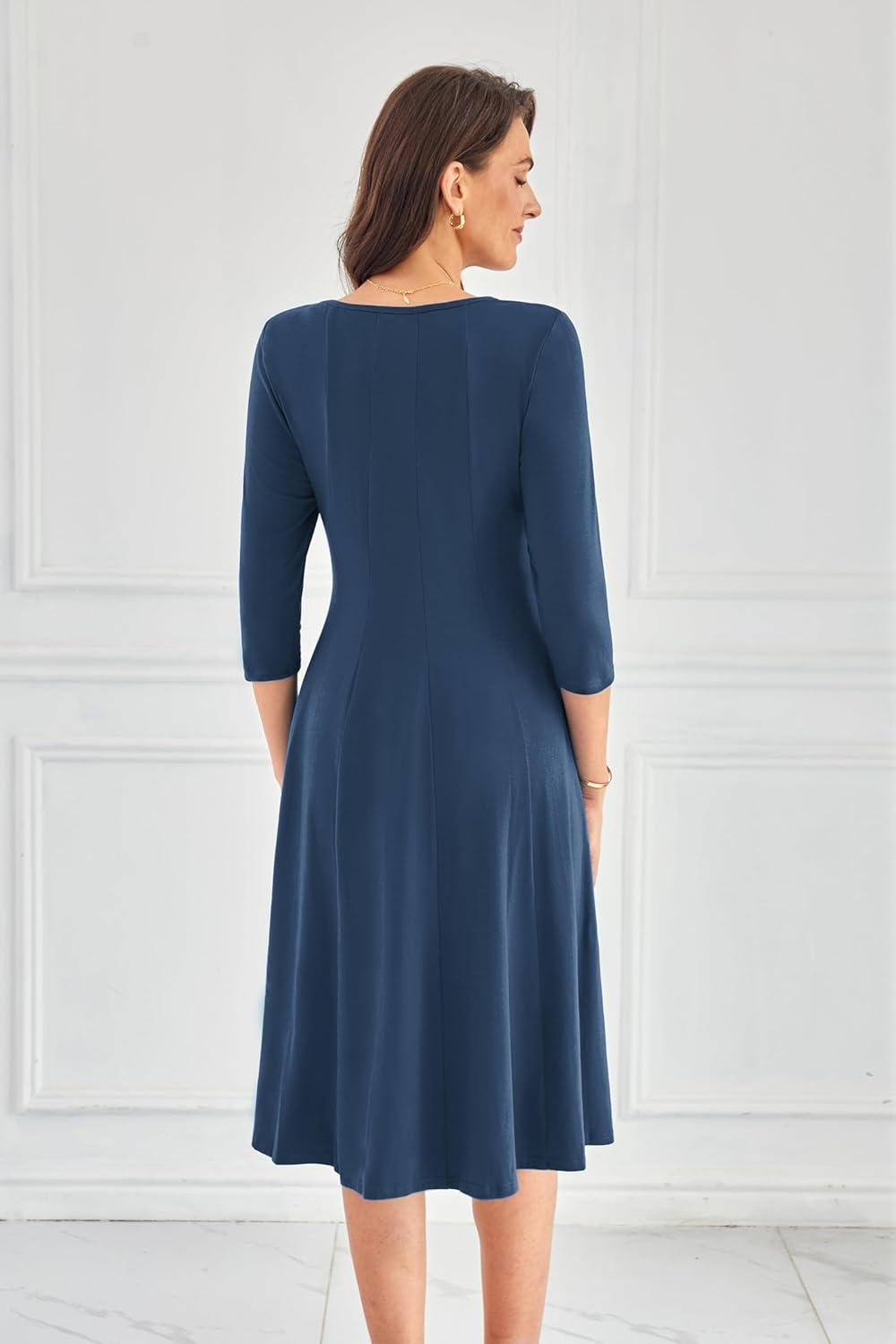 GRACE KARIN Fall Dresses for Women 2025 Casual 3/4 Sleeve Dress A Line Fit and Flare Midi Dress with Pockets(Navy Blue)