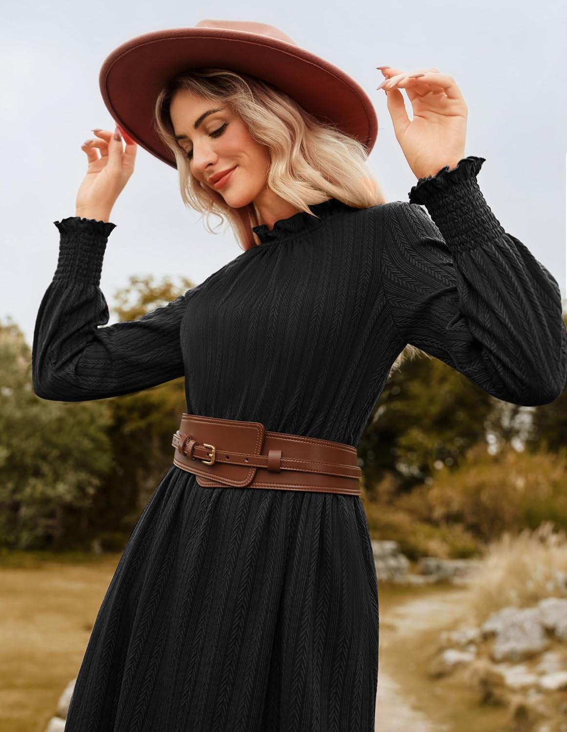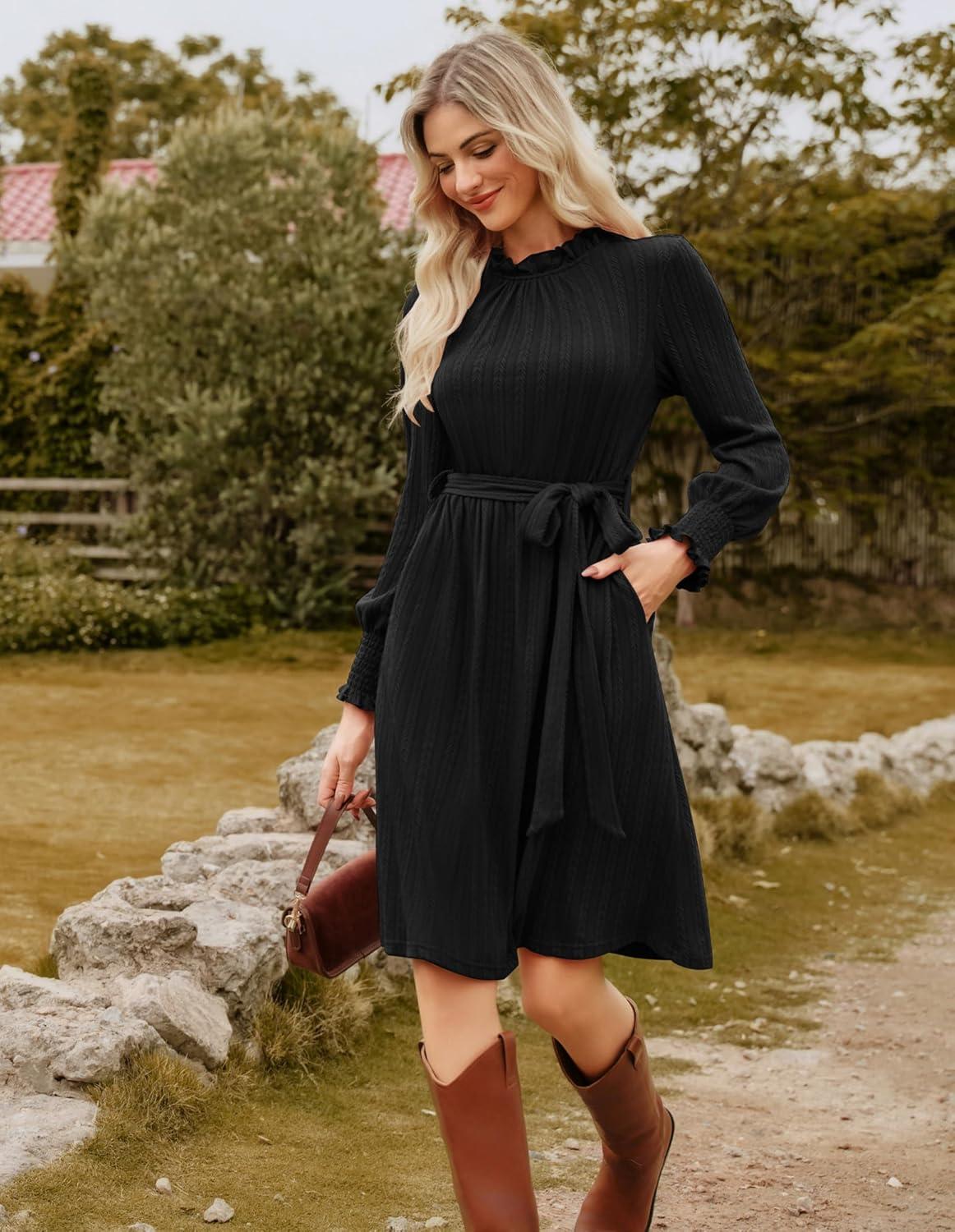 GRACE KARIN Fall Dresses for Women 2025 Casual Long Sleeve Crew Neck Ribbed Belted Dresses with Pocket(Black)