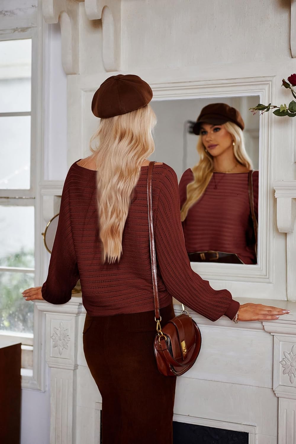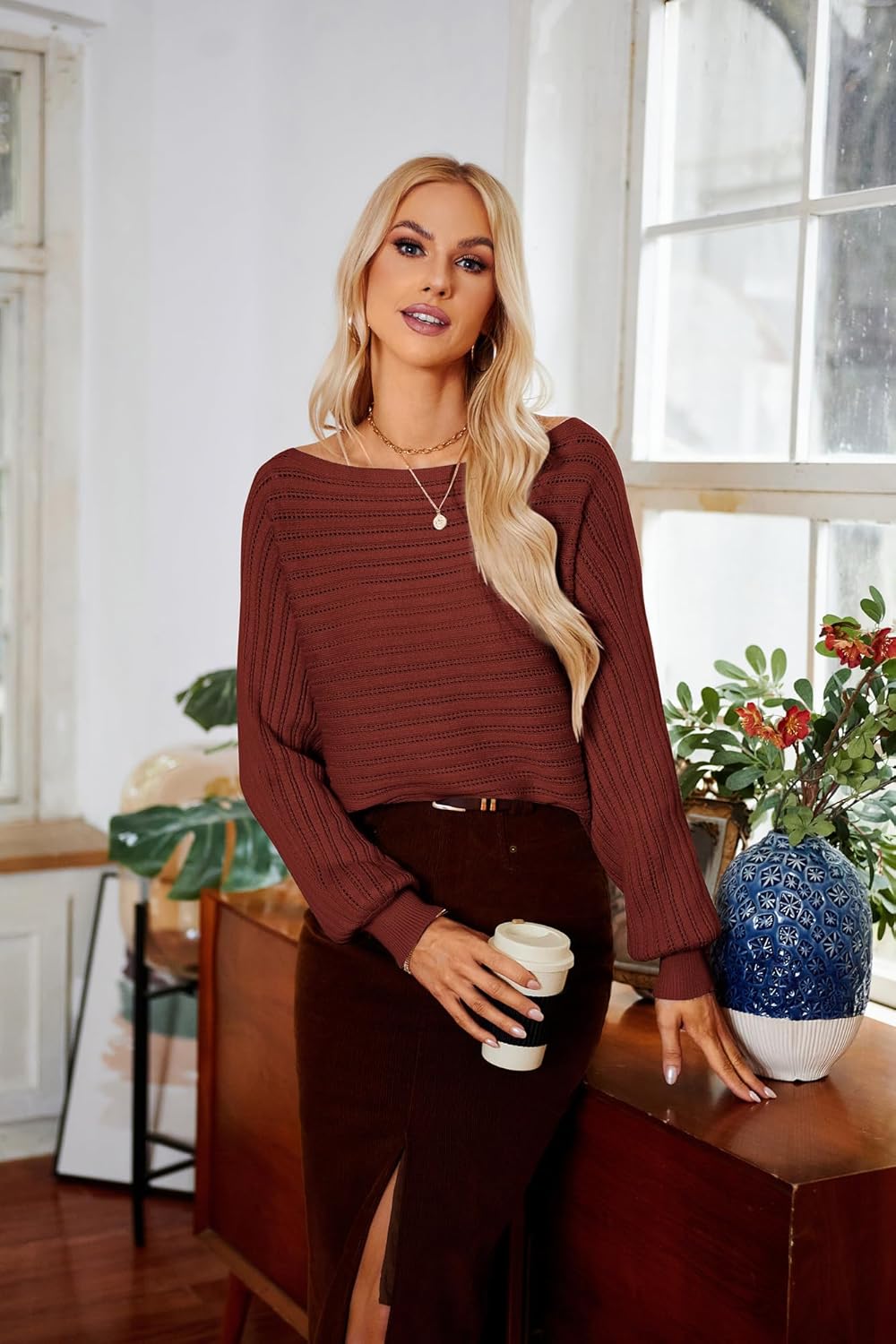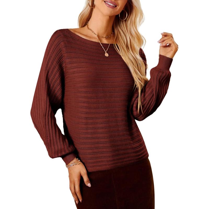 GRACE KARIN Fall Sweaters for Women 2024 Boat Neck Striped Crochet Pullover Sweater Knitted Batwing Long Sleeve Casual Tops(Brown)
