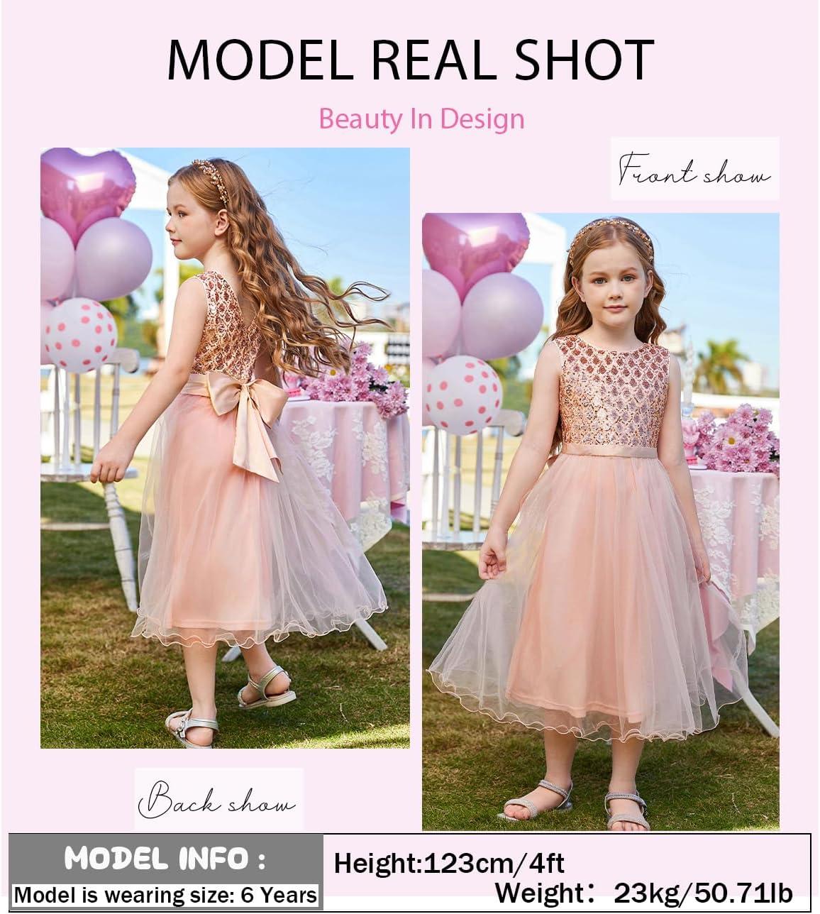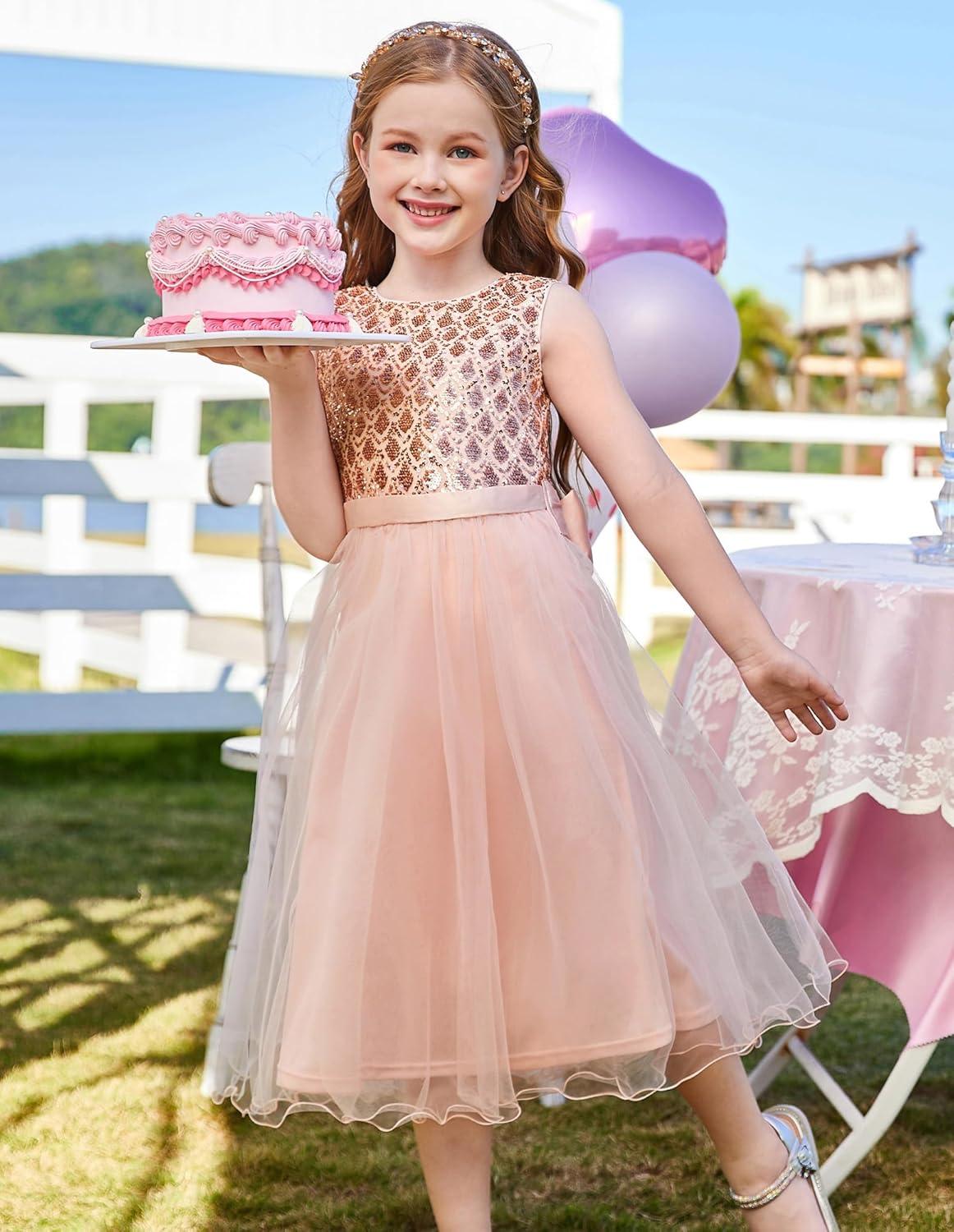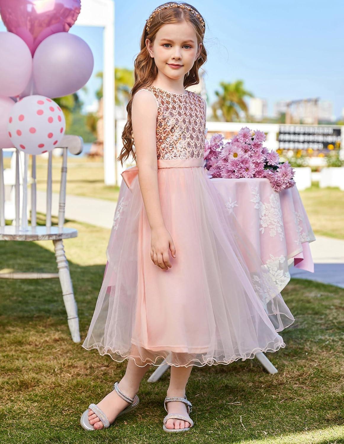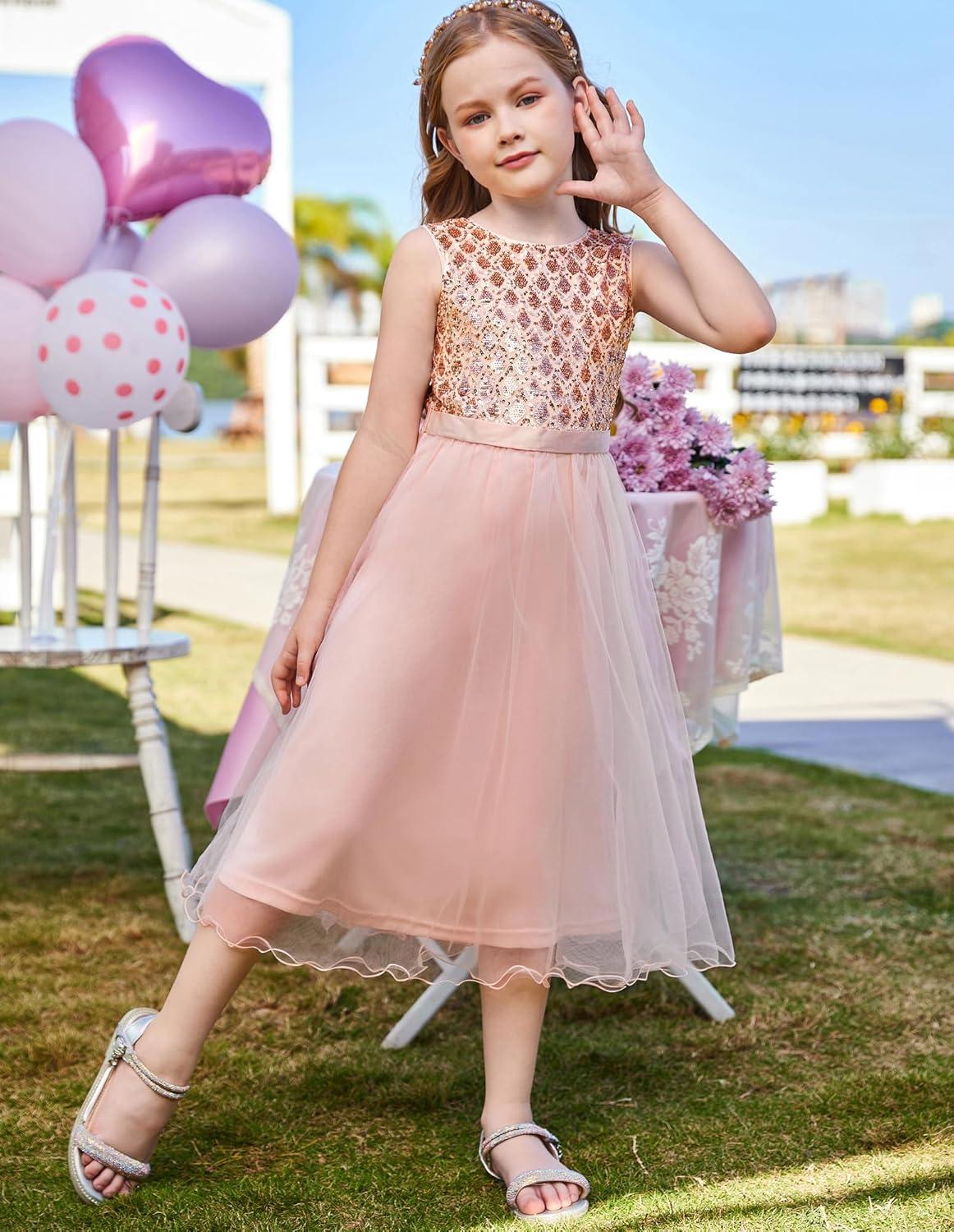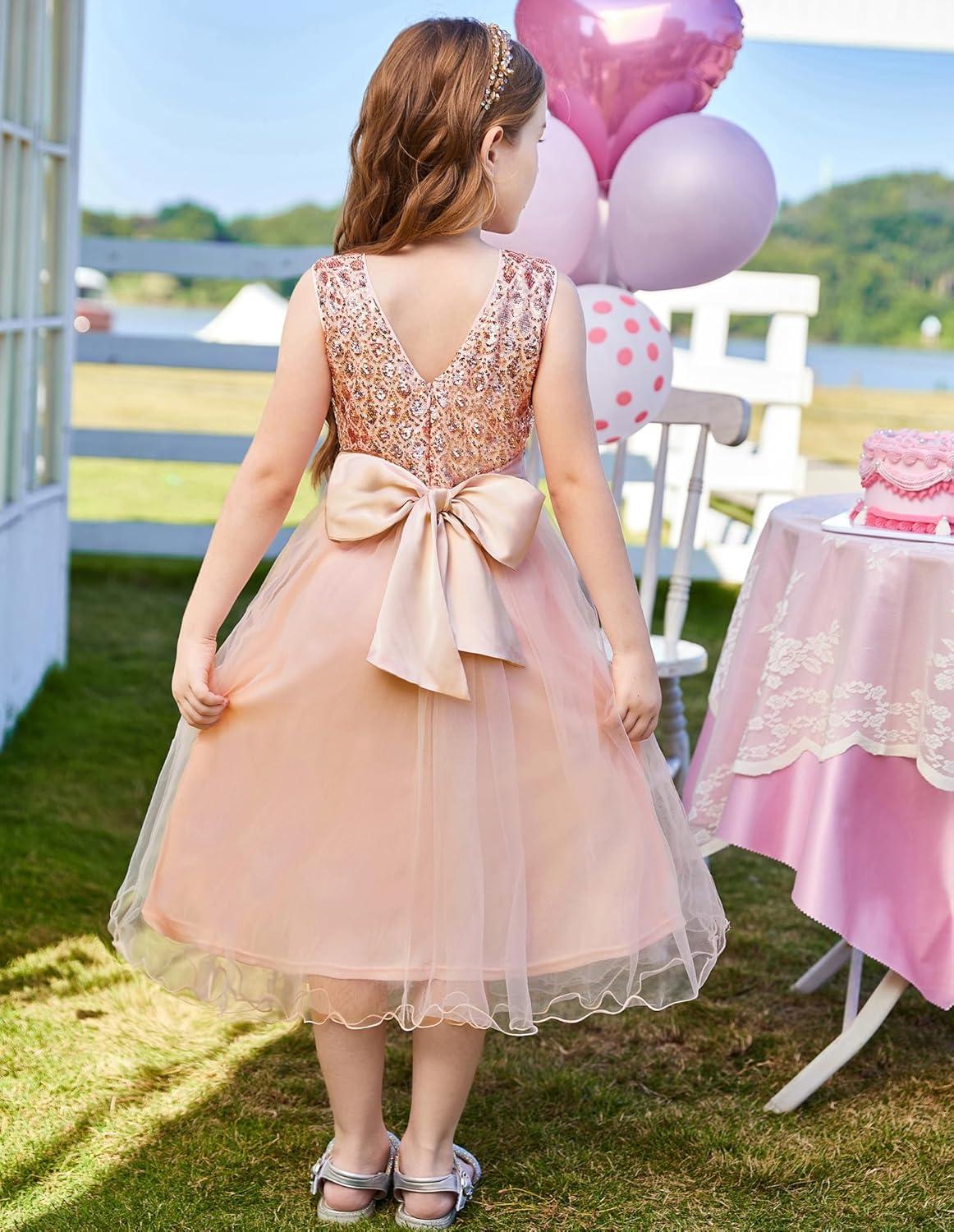 GRACE KARIN Flower Girl Dress V-Back Sequin Party Tulle Dresses Kids Birthday Formal Wedding Pageant Princess Dress 5-12(Rose Gold)