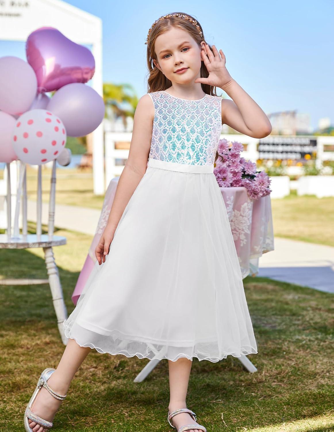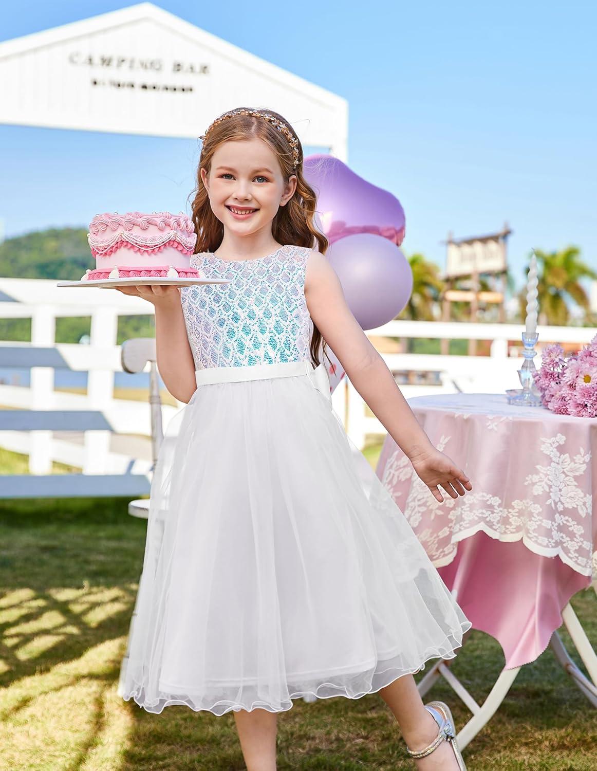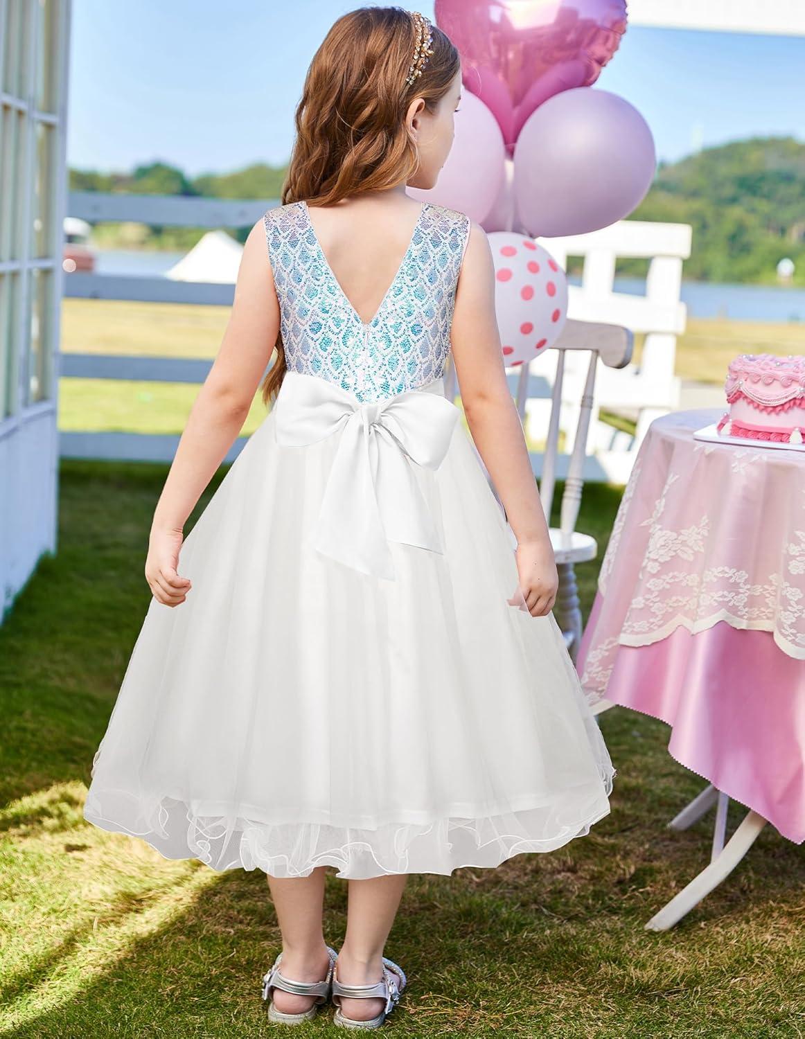 GRACE KARIN Flower Girl Dress V-Back Sequin Party Tulle Dresses Kids Birthday Formal Wedding Pageant Princess Dress 5-12(White)
