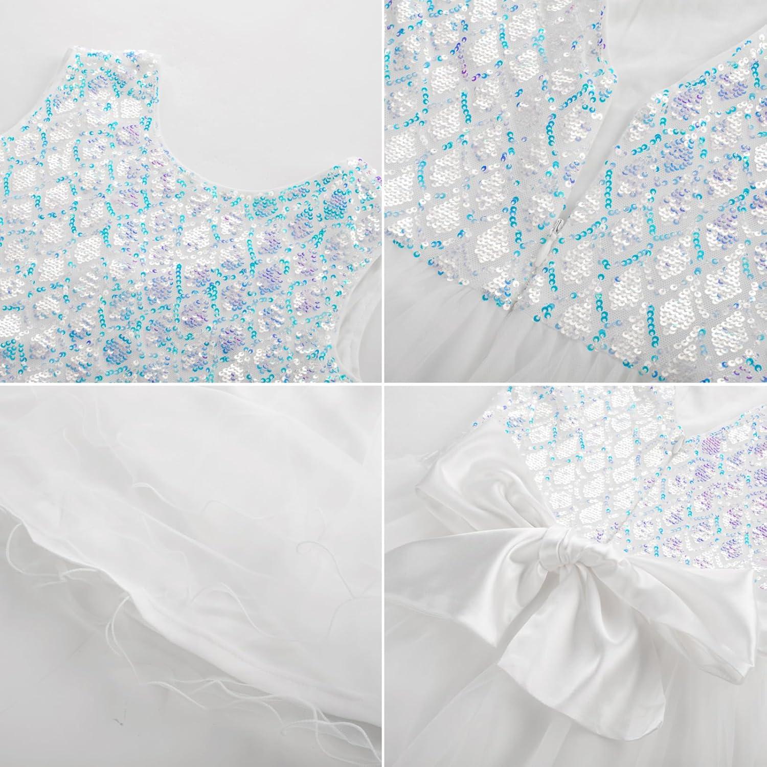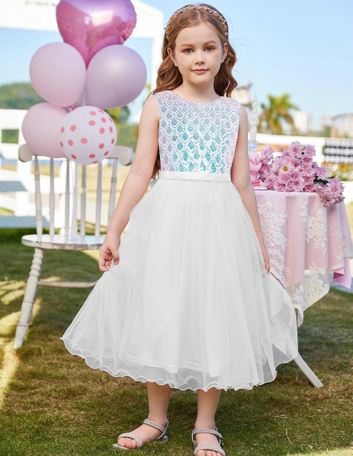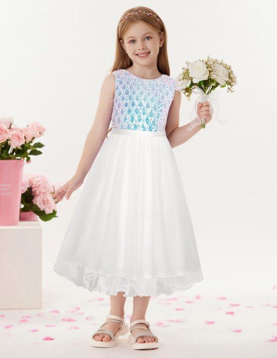 GRACE KARIN Flower Girl Dress V-Back Sequin Party Tulle Dresses Kids Birthday Formal Wedding Pageant Princess Dress 5-12(White)