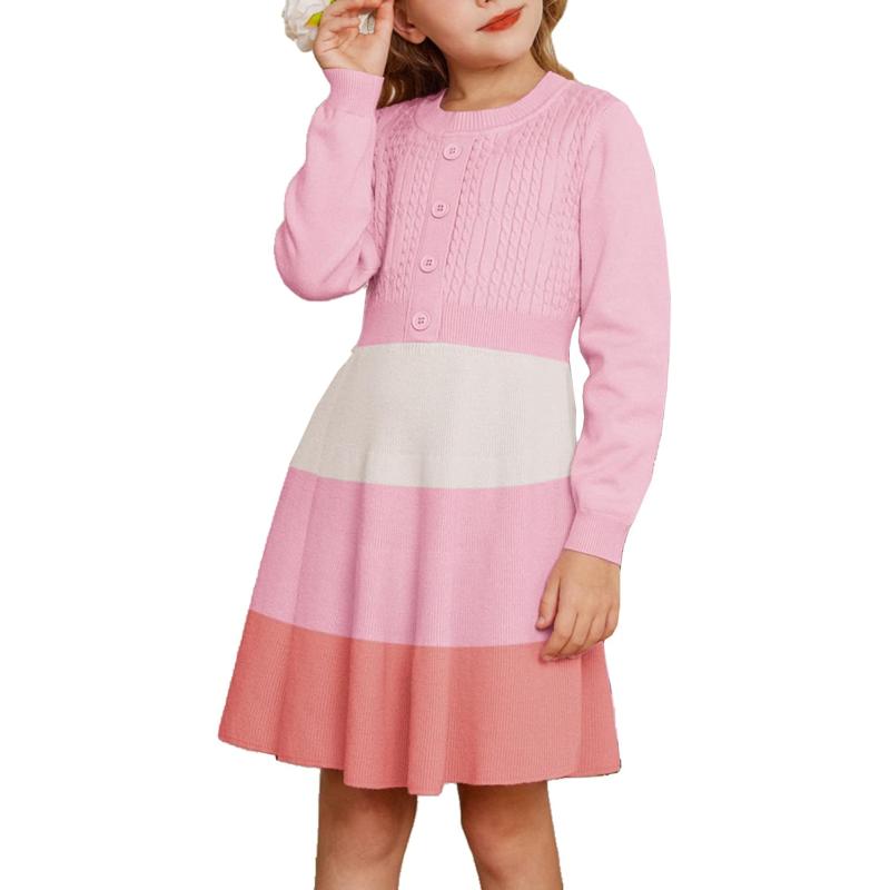 GRACE KARIN Girl Dress Long Sleeve Sweater Ruffle Button Front Knit Casual Fall Winter Dresses for Girls 5-12(Color Block-pink)
