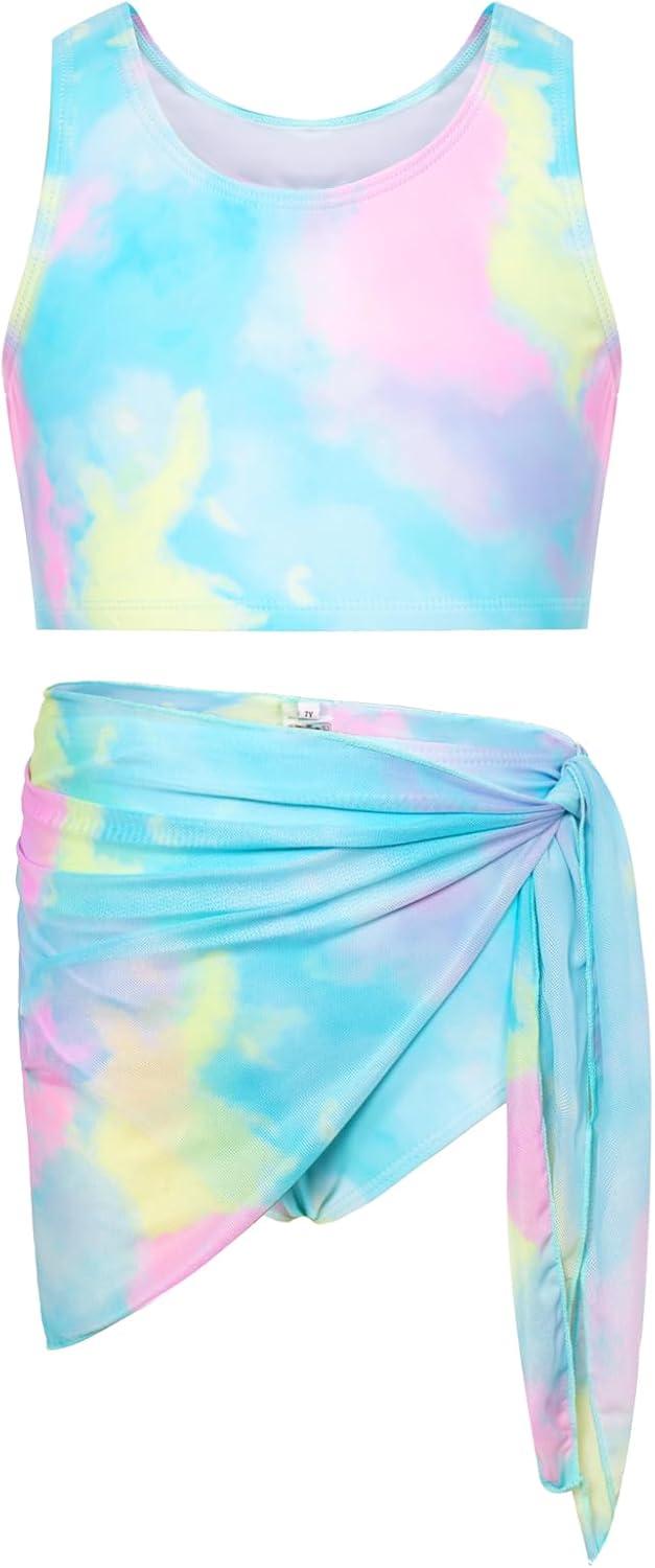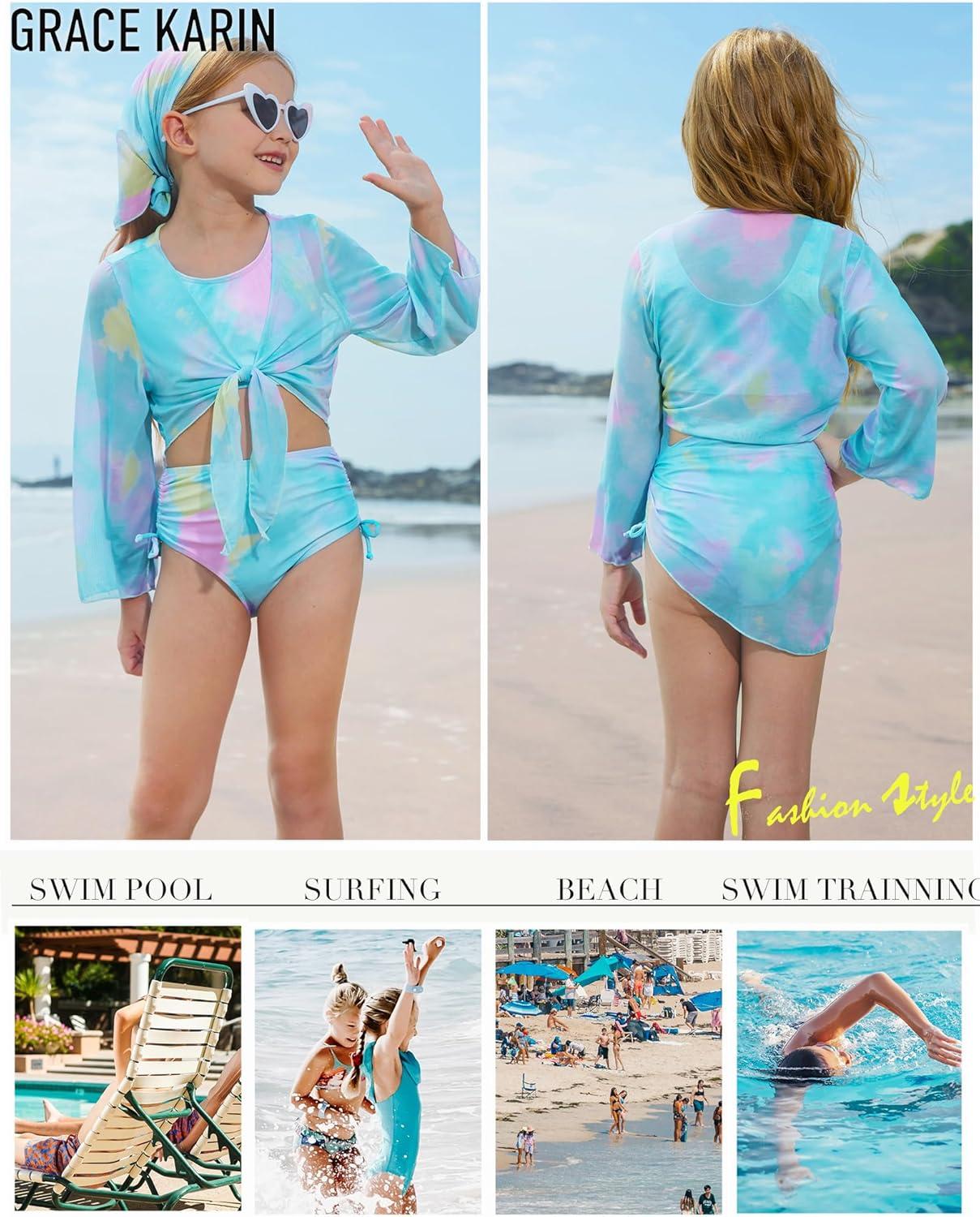 GRACE KARIN Girls Bathing Suit Adjustable Taniki Swimsuit Tie Front 4 Piece Bikini Set with Kimono Cover Up 6-14(Blue-purple)