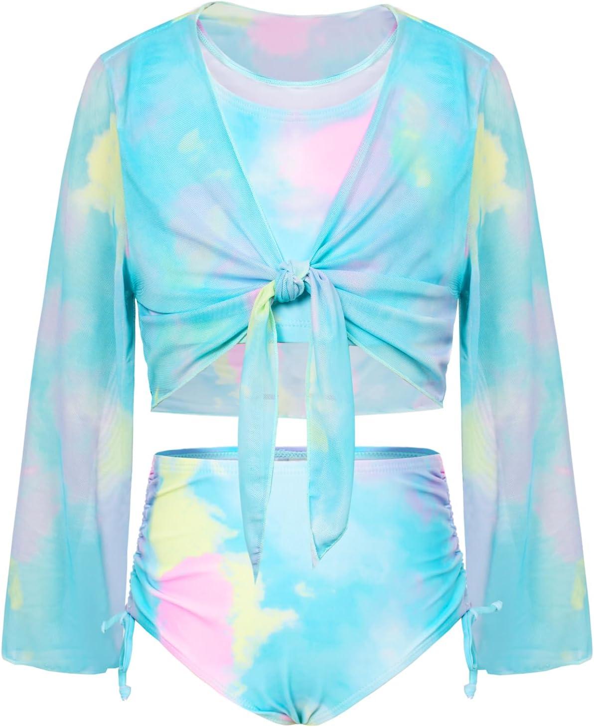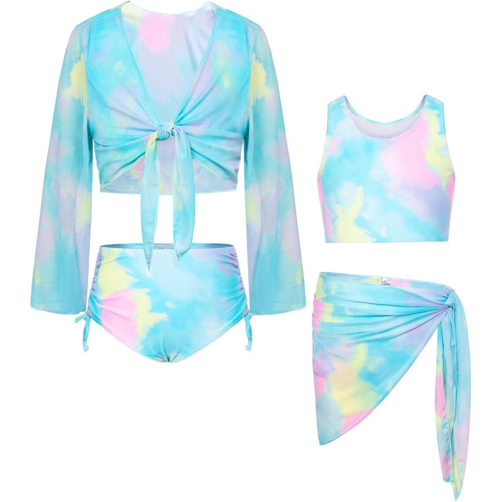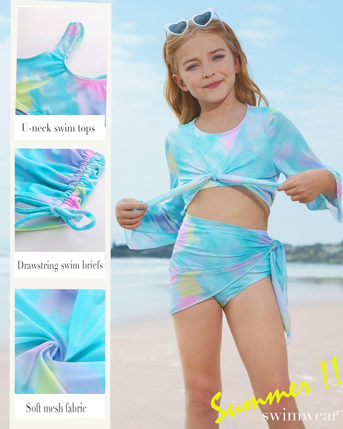 GRACE KARIN Girls Bathing Suit Adjustable Taniki Swimsuit Tie Front 4 Piece Bikini Set with Kimono Cover Up 6-14(Blue-green)