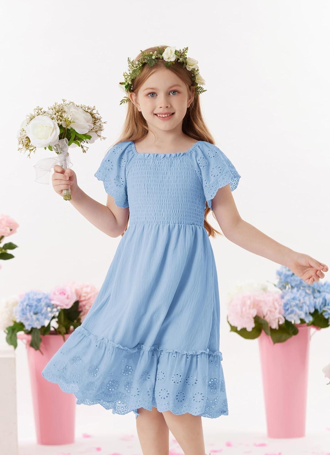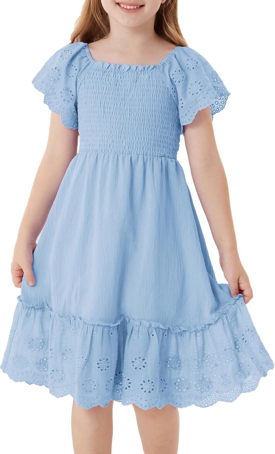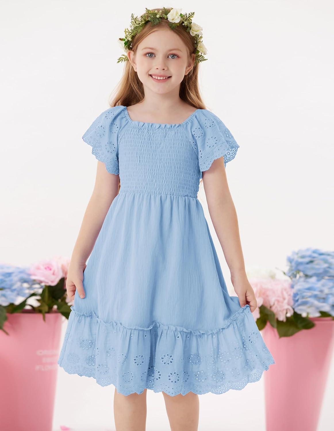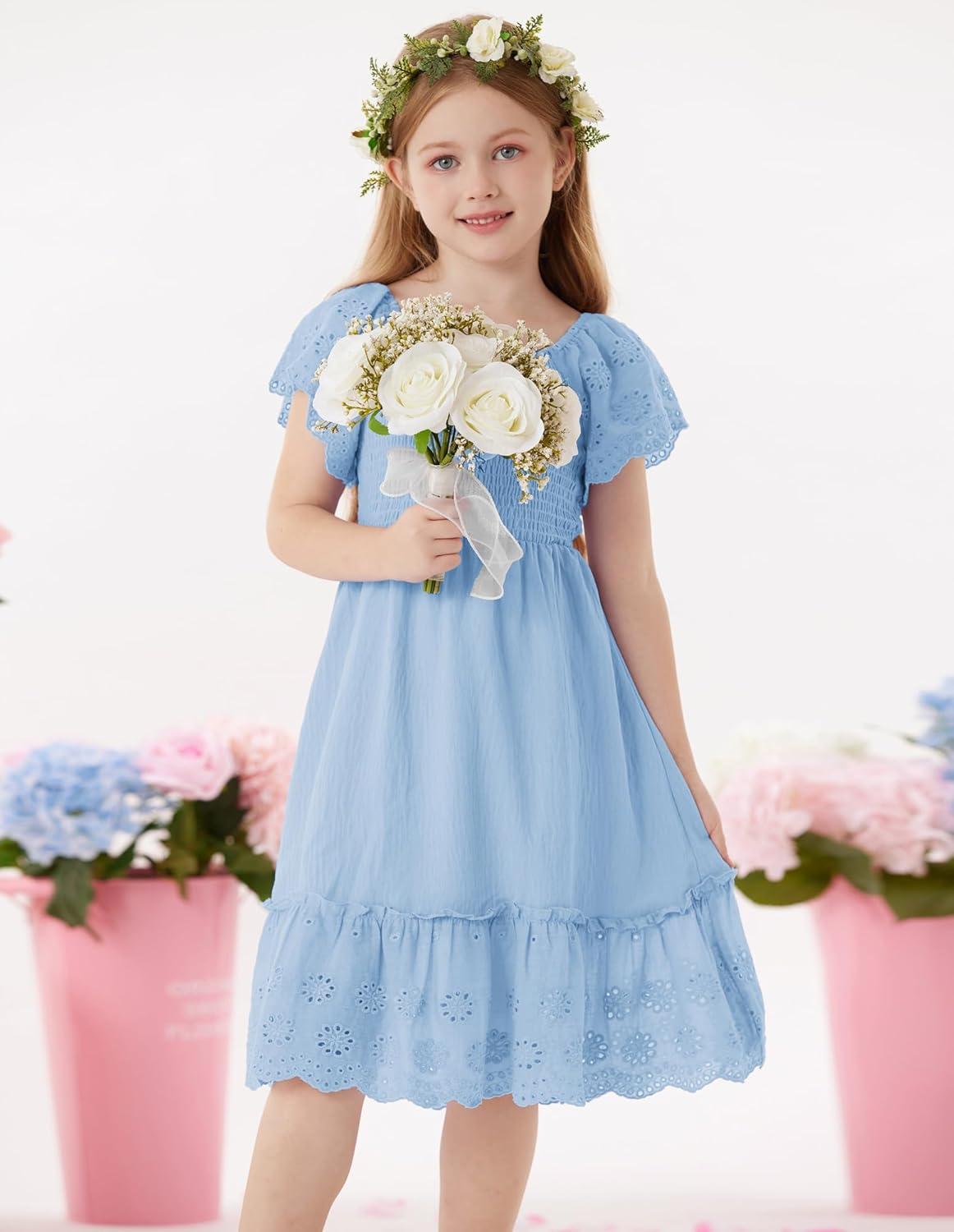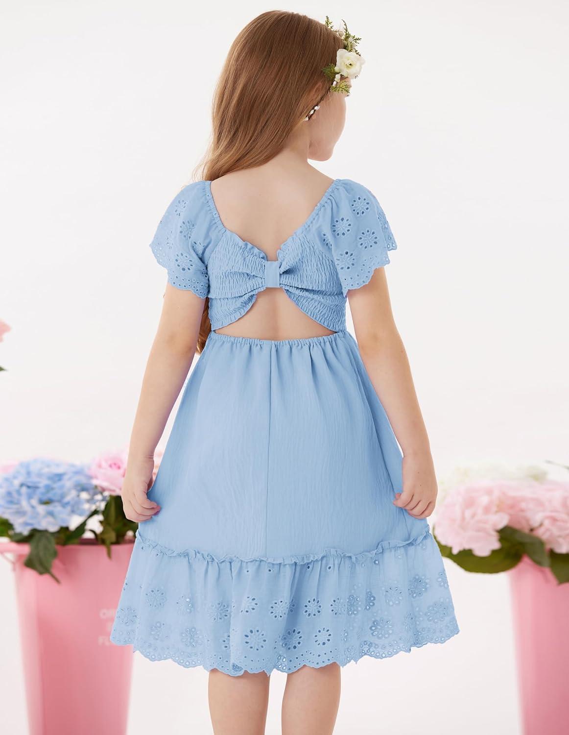 GRACE KARIN Girls Bow Back Dress Summer Beach Party Casual Sundress Ruffle Backless Dress for Teens Girls Size 6-14(Light Blue)