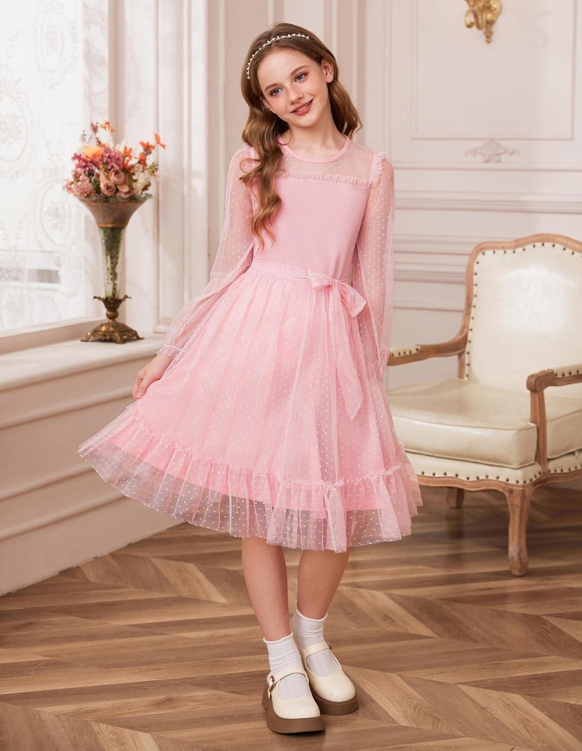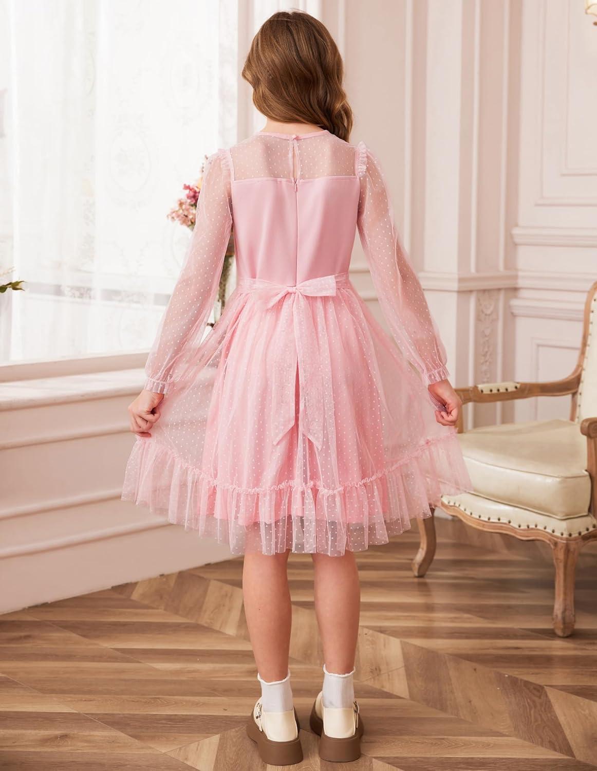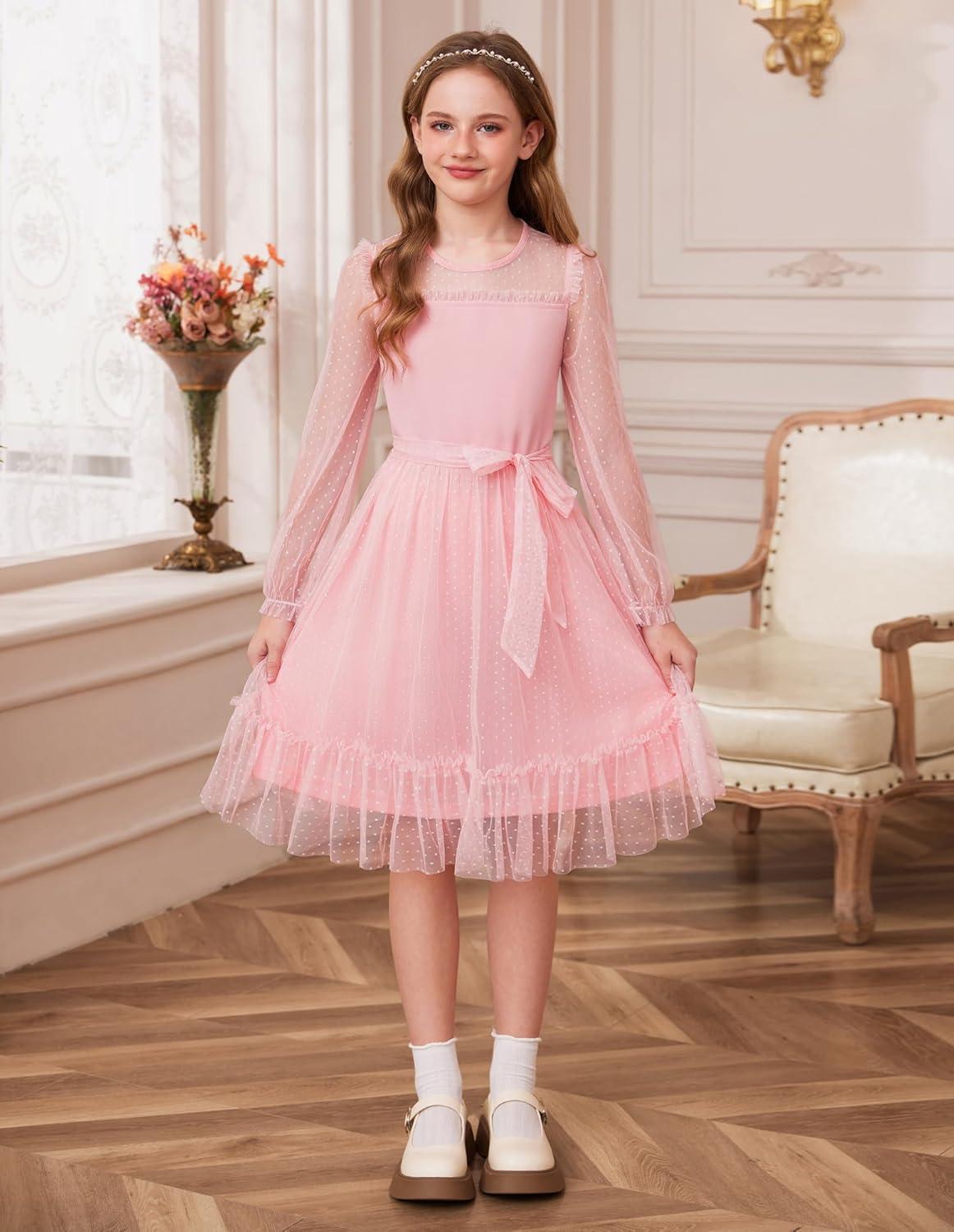 GRACE KARIN Girls Contrast Mesh Dress Party Birthday Formal Kids Long Sleeve A-Line Tulle Dresses for 6-12 Years(Pink)