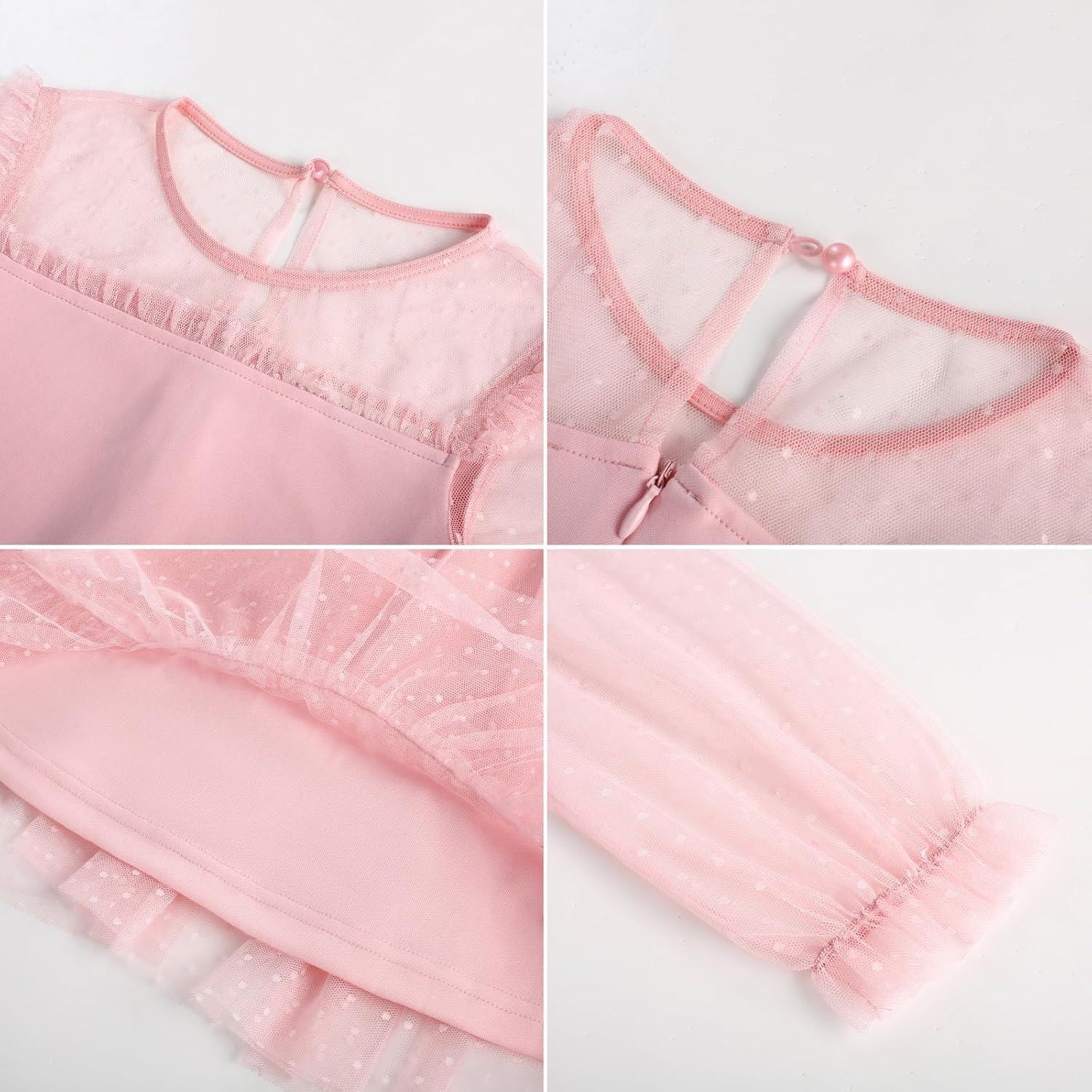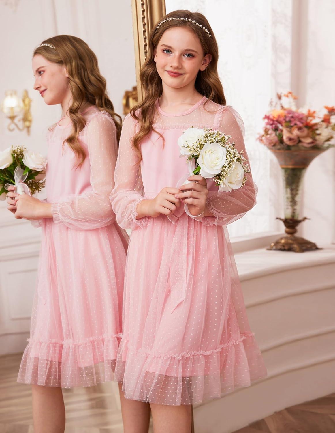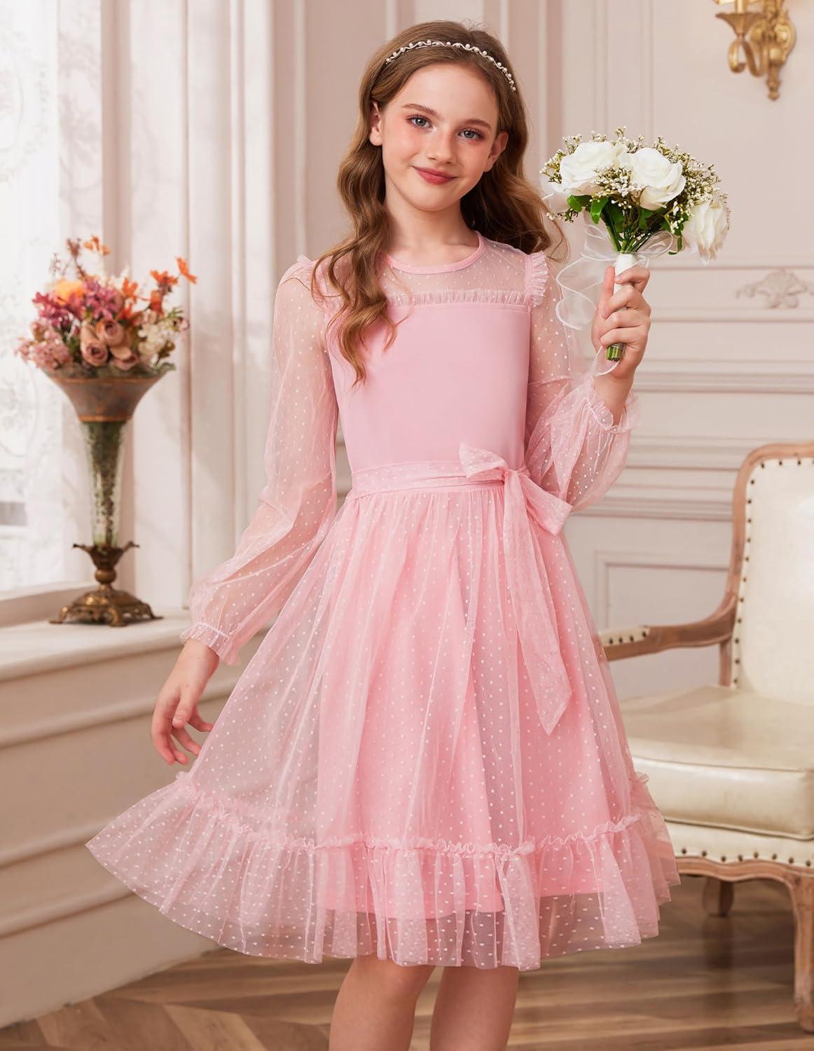 GRACE KARIN Girls Contrast Mesh Dress Party Birthday Formal Kids Long Sleeve A-Line Tulle Dresses for 6-12 Years(Pink)