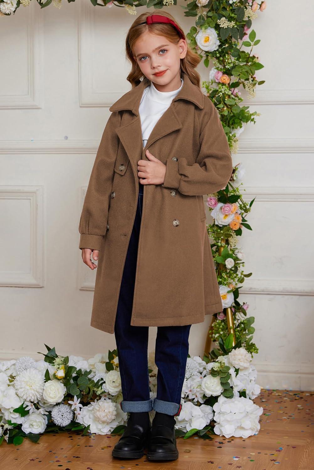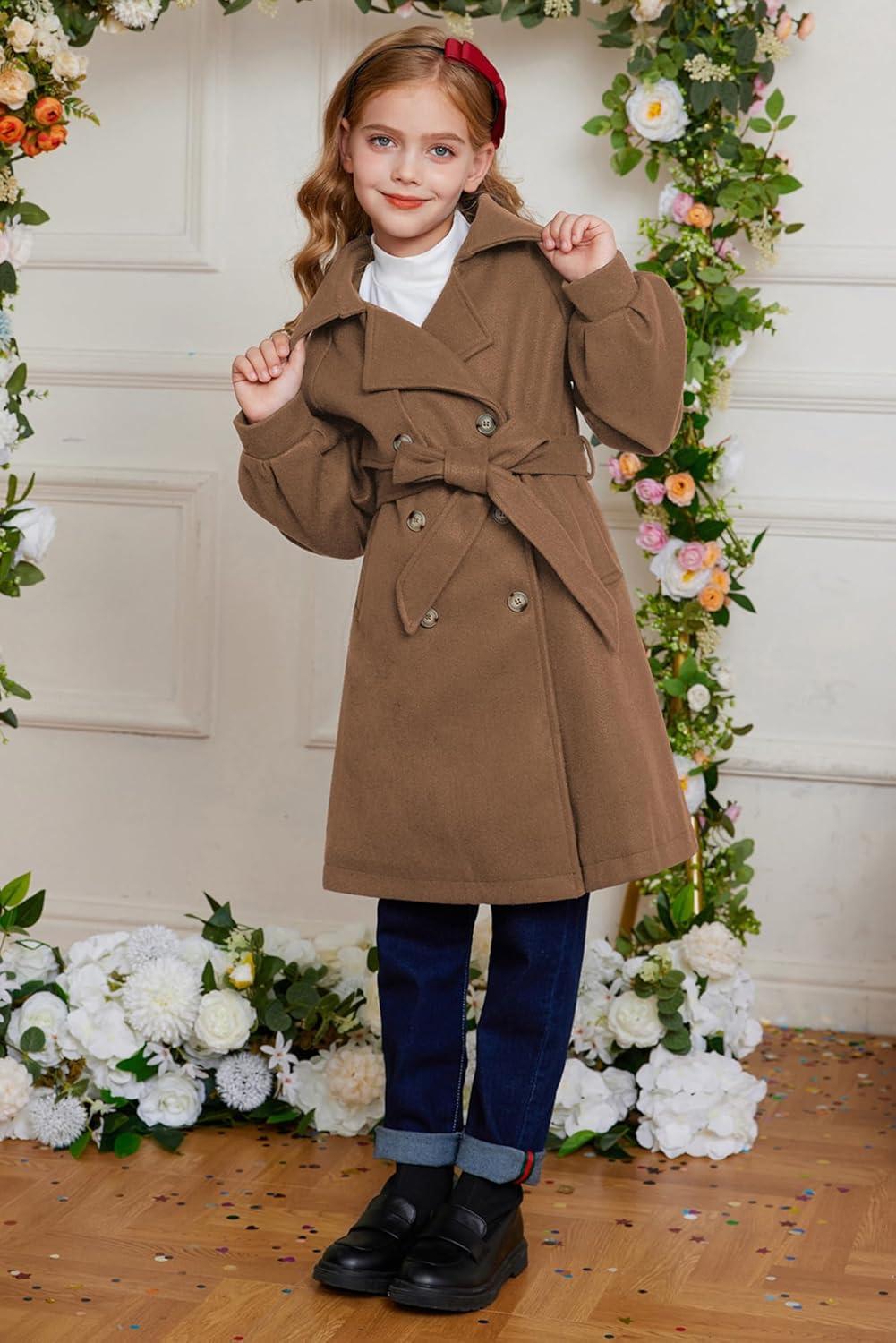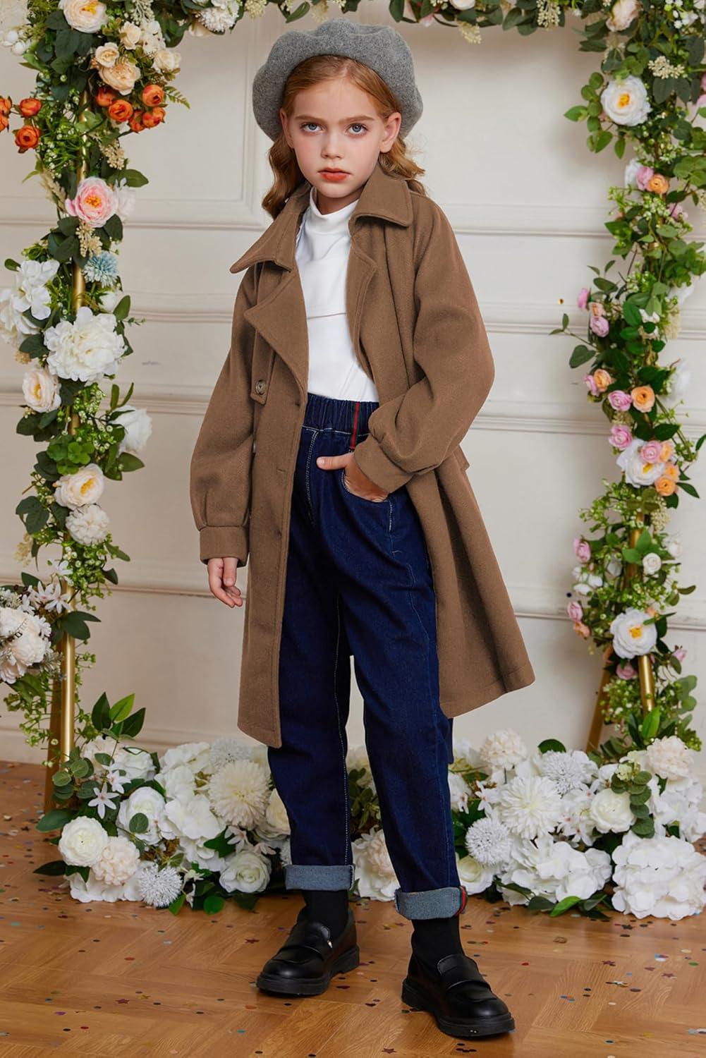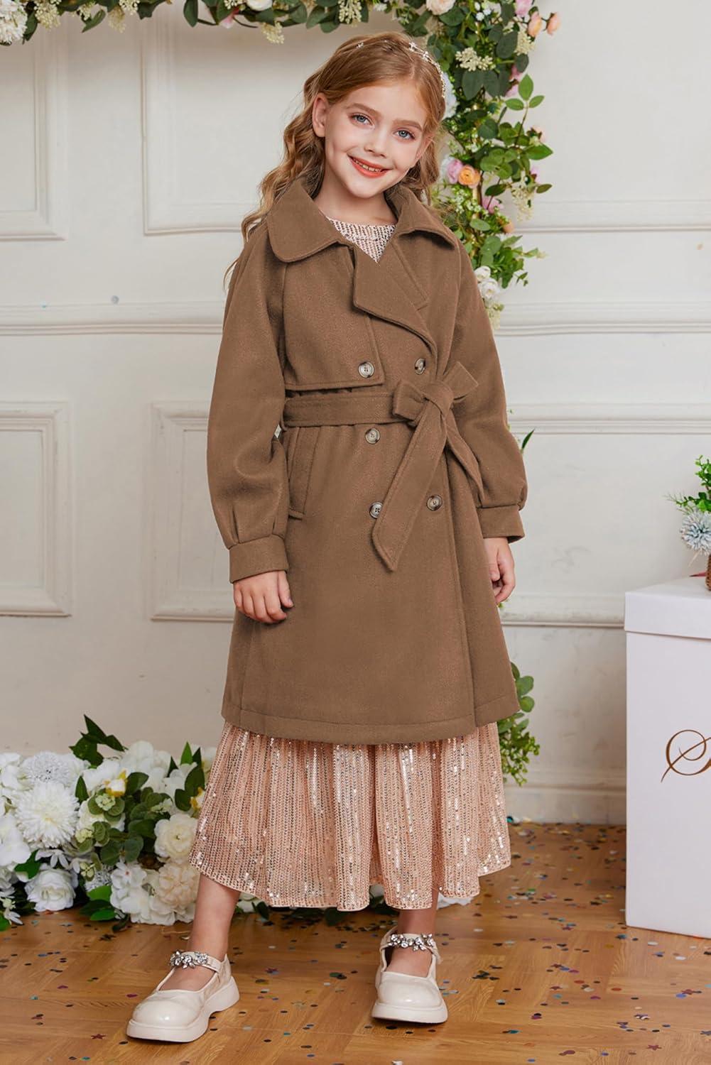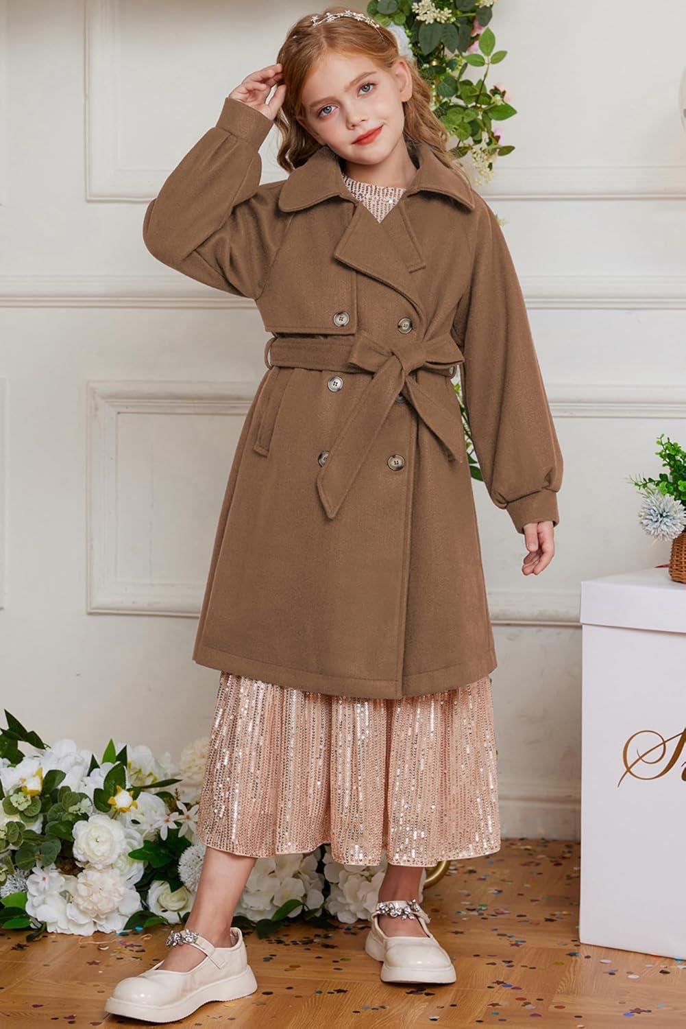 GRACE KARIN Girls Dress Coat Lapel Wool Blend Long Winter Jackets with Pockets Belt 6-14Y(Dark Camel)